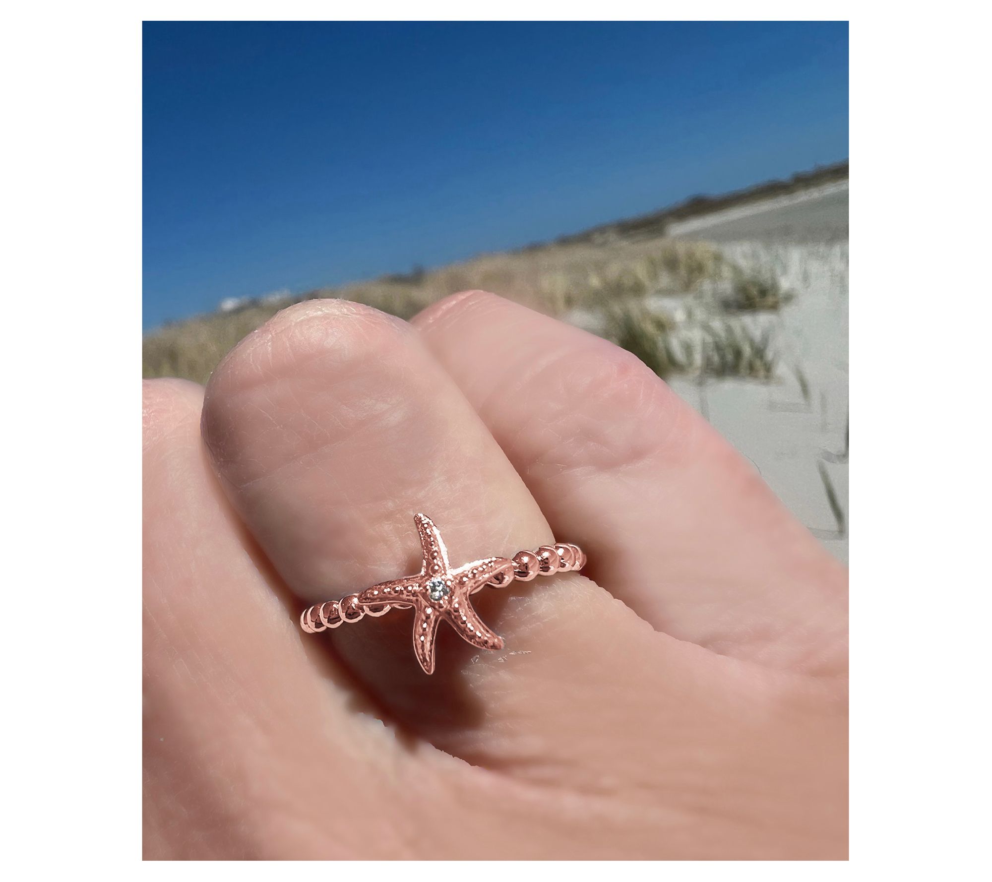Starfish design with round-cut white topaz; prong setting