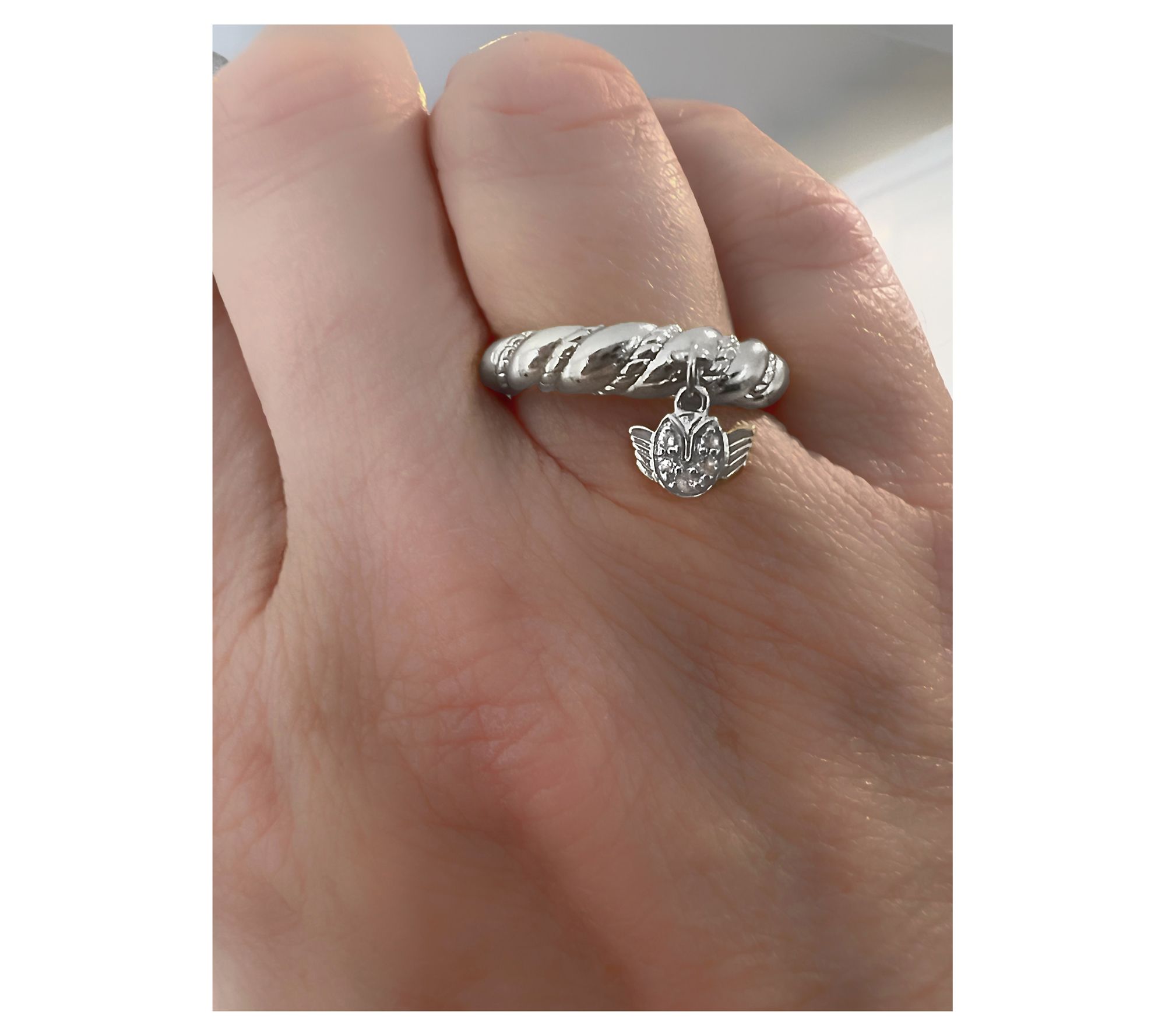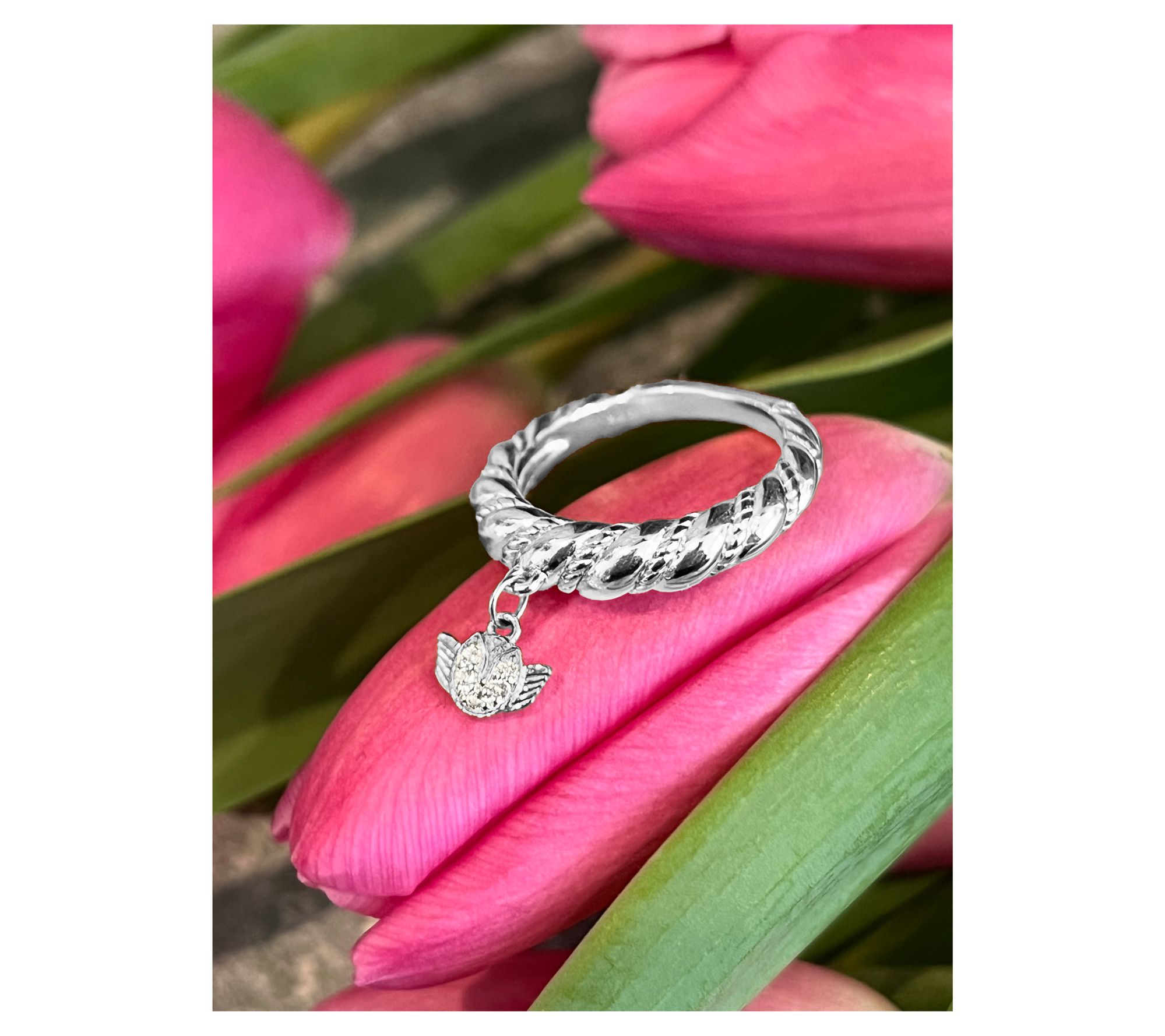 Sweet occasions -- graduations, family gatherings, or an everyday note of encouragement -- are even more memorable when celebrated with a symbol as meaningful as this tulip angel charm ring. Shimmering with white topaz accents, it brings a little joy and an uplifting message to every moment. From Goddaughters.