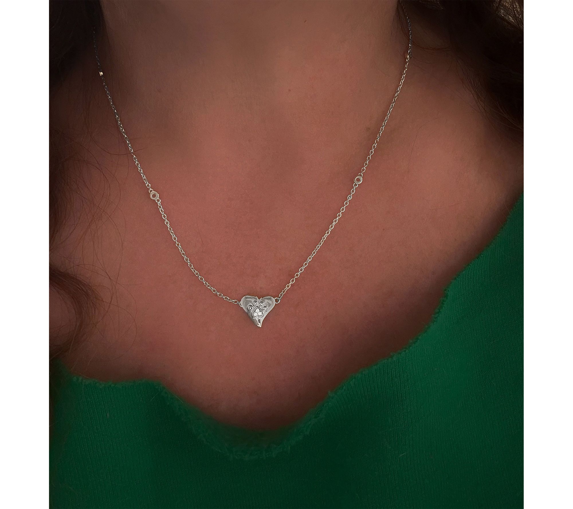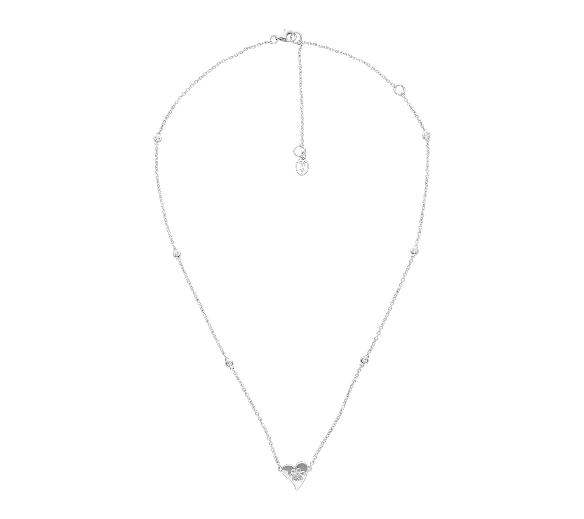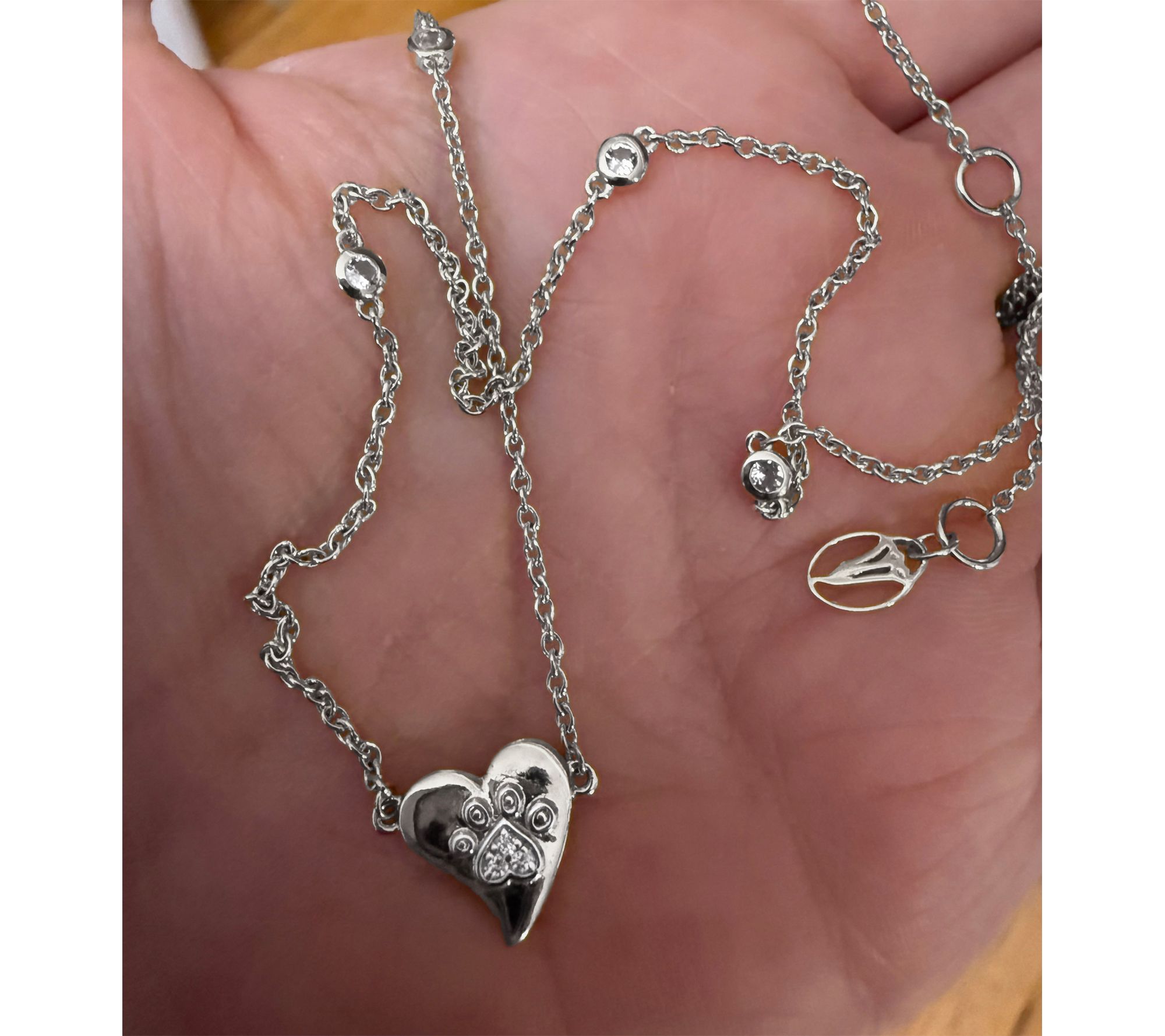 Honor your bond with your four-legged friend in elegant style -- this sterling silver station necklace features a heart adorned with a shimmering paw print, beautifully symbolizing a cherished connection. Sparkling white topaz gemstones catch the light, bringing a gentle glow to every look, whether it's a day at the office or an evening gathering. From Goddaughters.