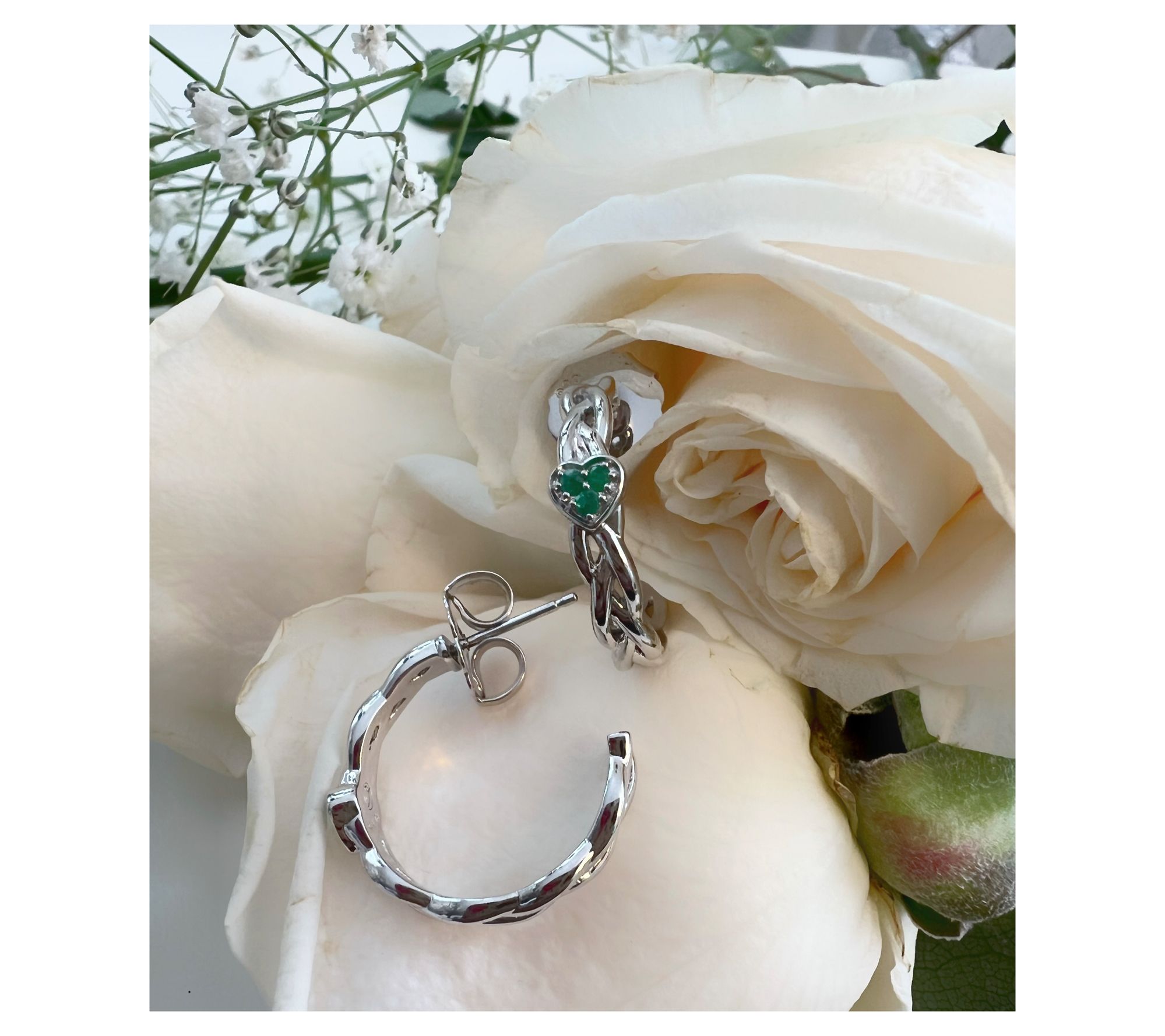 Let these earrings carry you away to a world of love and eternity, where the Celtic knot design speaks to the interconnectedness of all things. Accented with emeralds forming a gentle heart, they are not only a symbol of devotion but also a reminder of fresh starts and tranquility. Whether you're celebrating a bond or simply cherishing every day, these earrings provide a beautiful touch of elegance. From Goddaughters.
