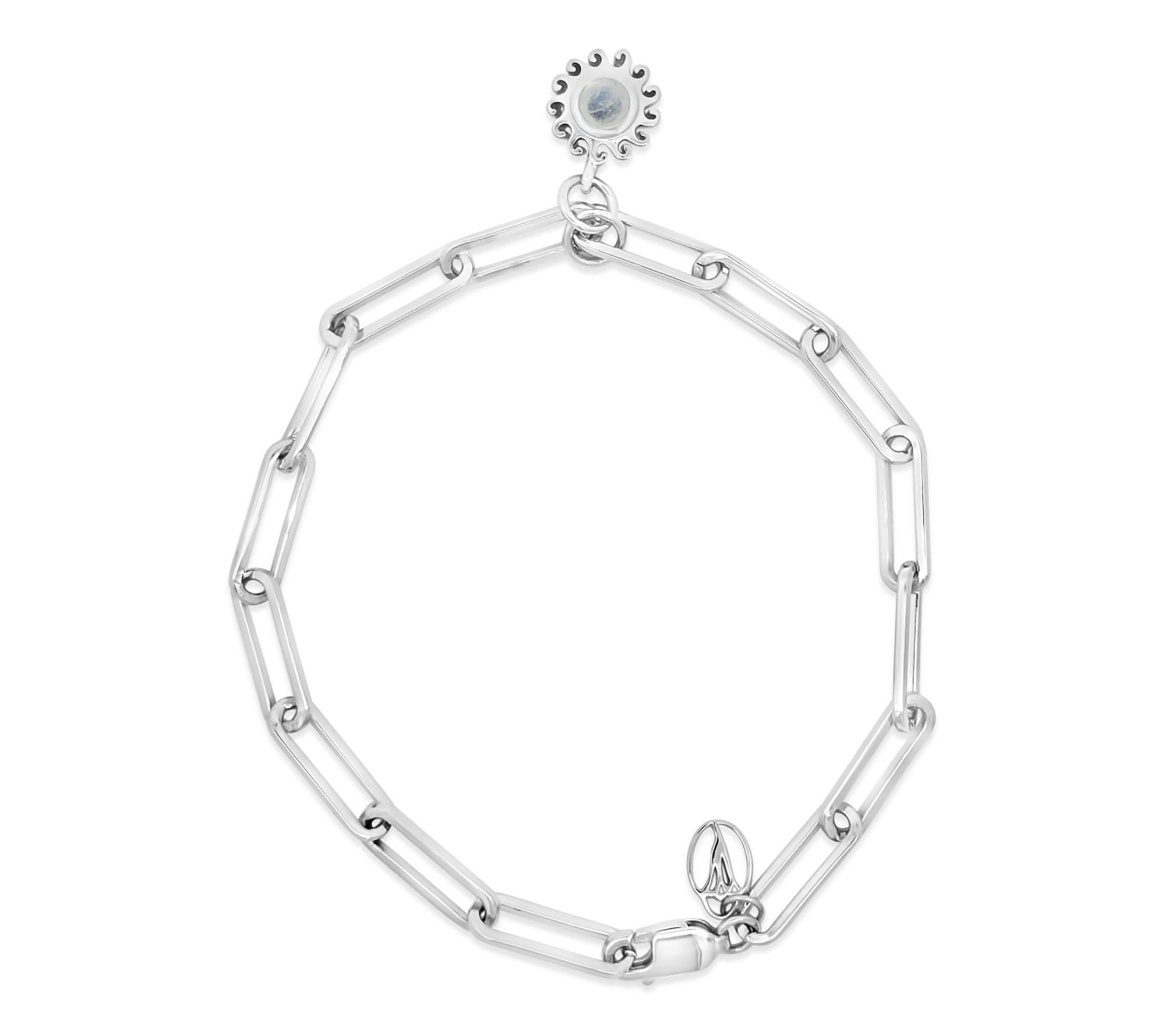 - Bezel-set, round rainbow moonstone; oval paperclip link chain; oxidized and polished finish