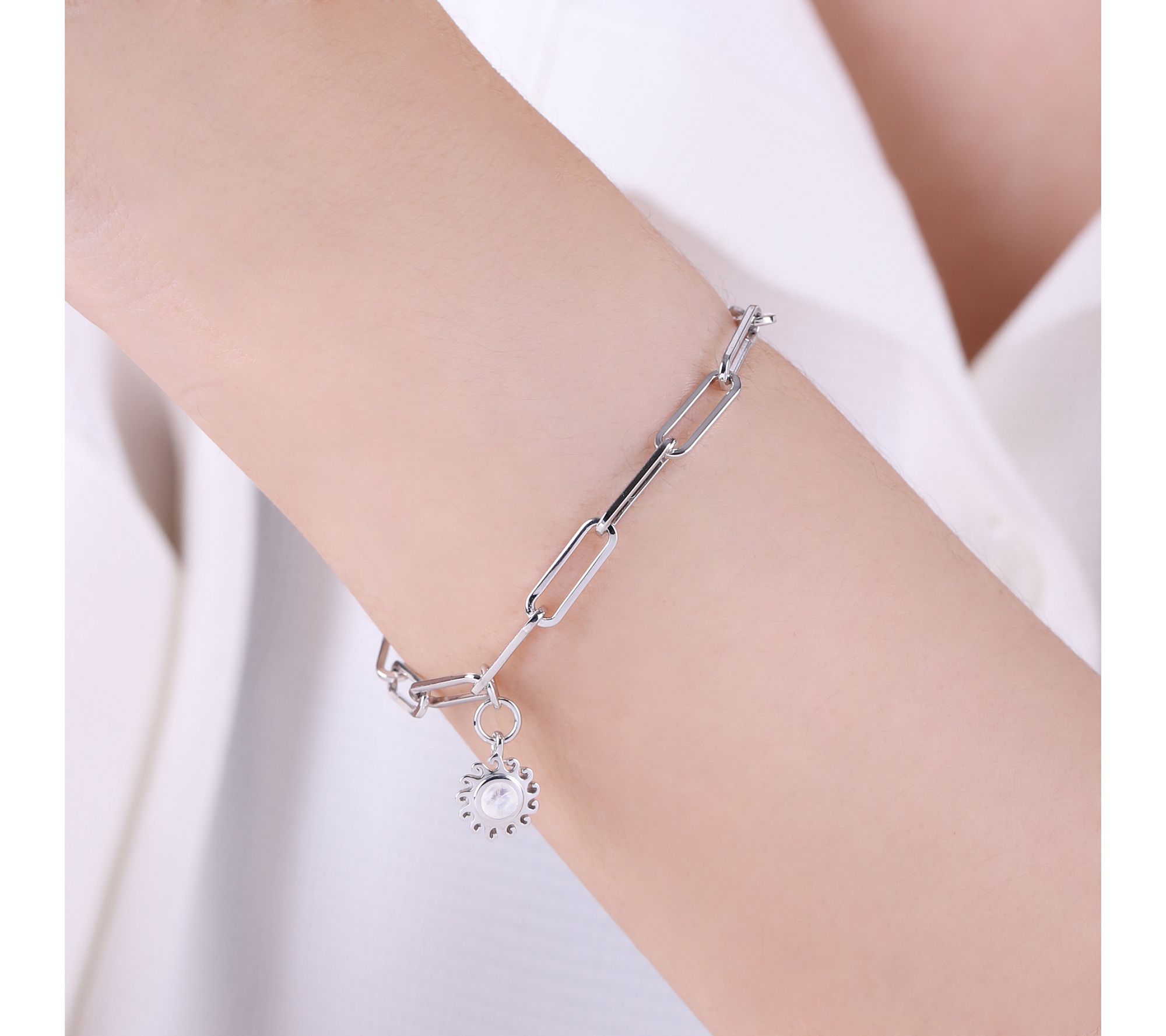 Reflect on your inner balance and strength with this moonstone sun bracelet accessorizing your look. From Goddaughters.
