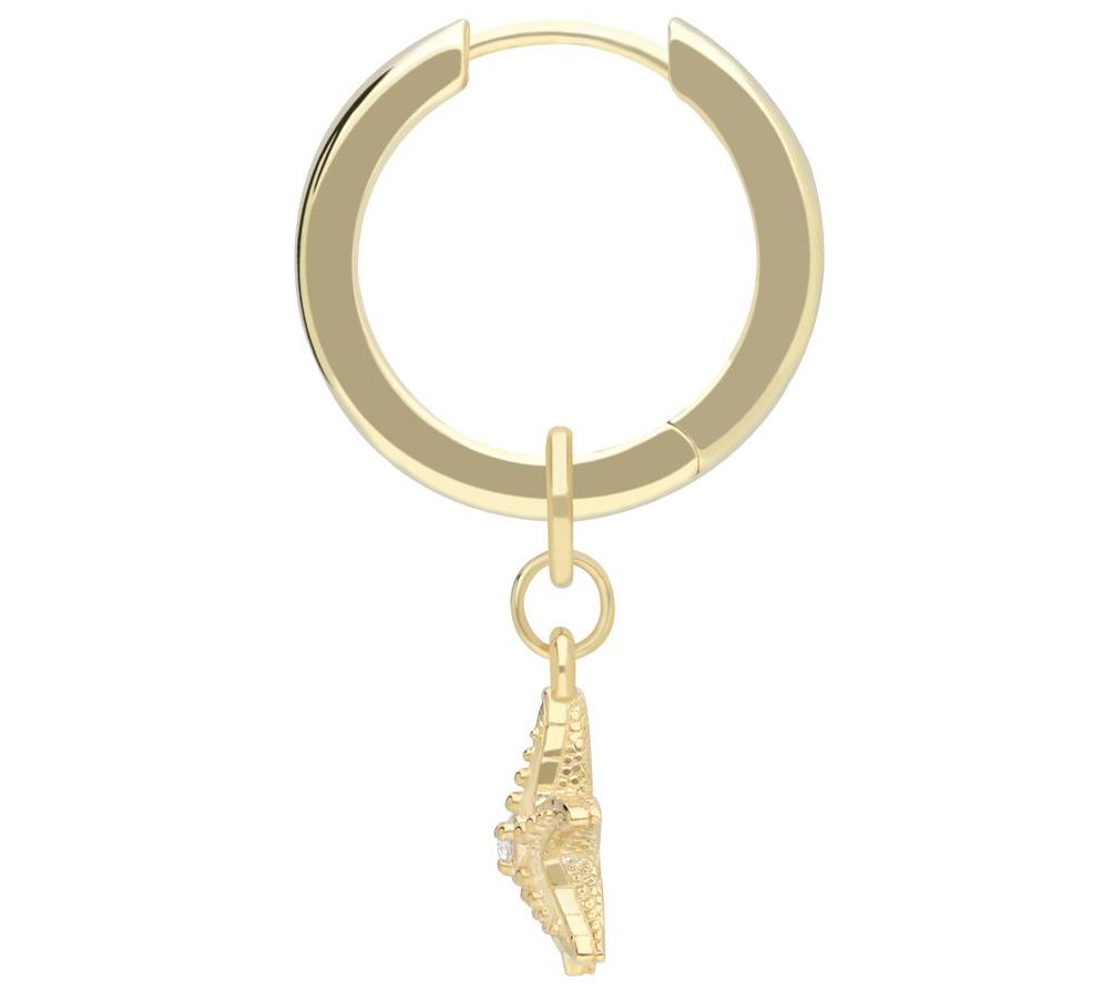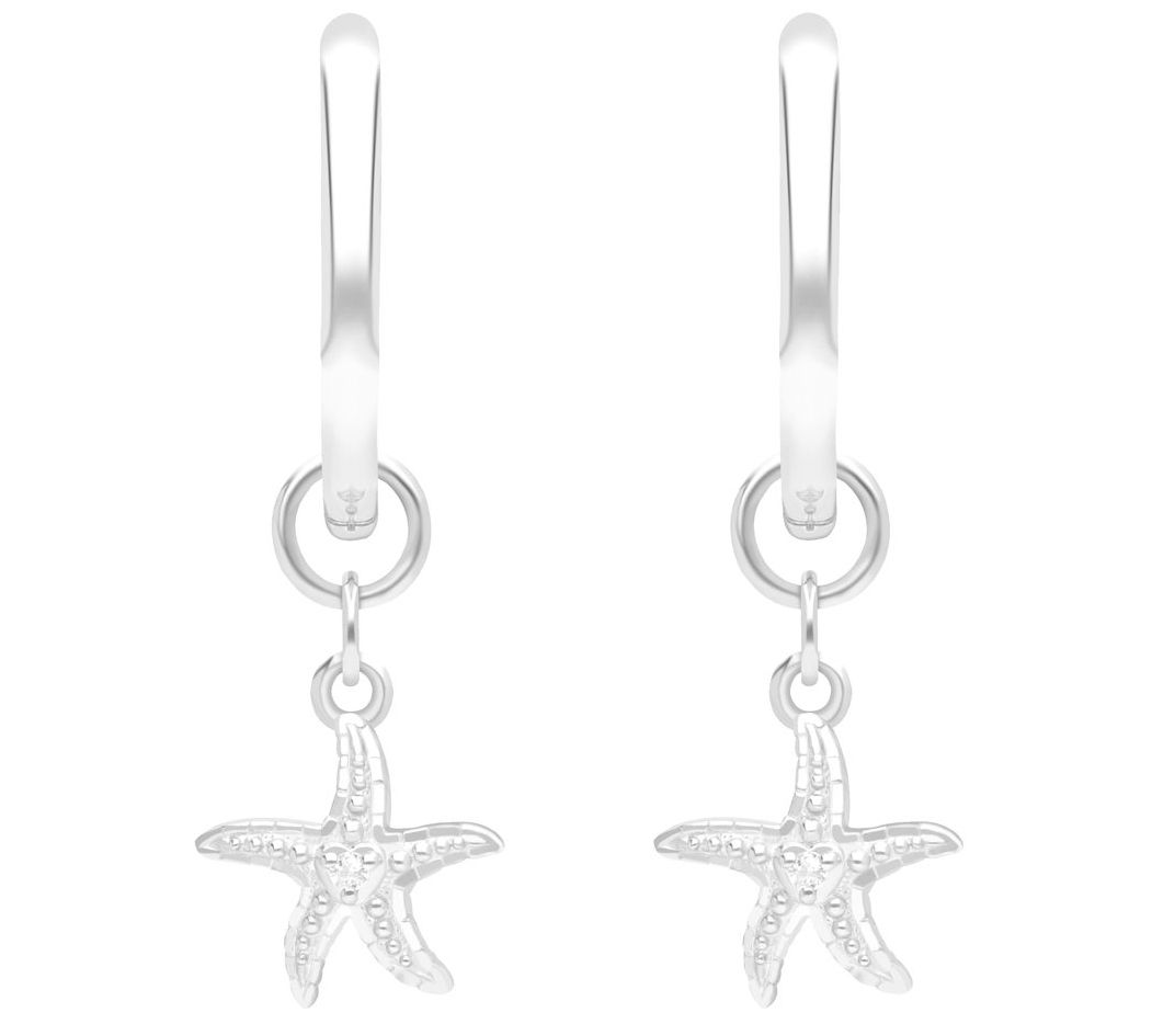 - Huggie hoop earrings with dangling starfish charms featuring round-cut pave white topaz stones in the center