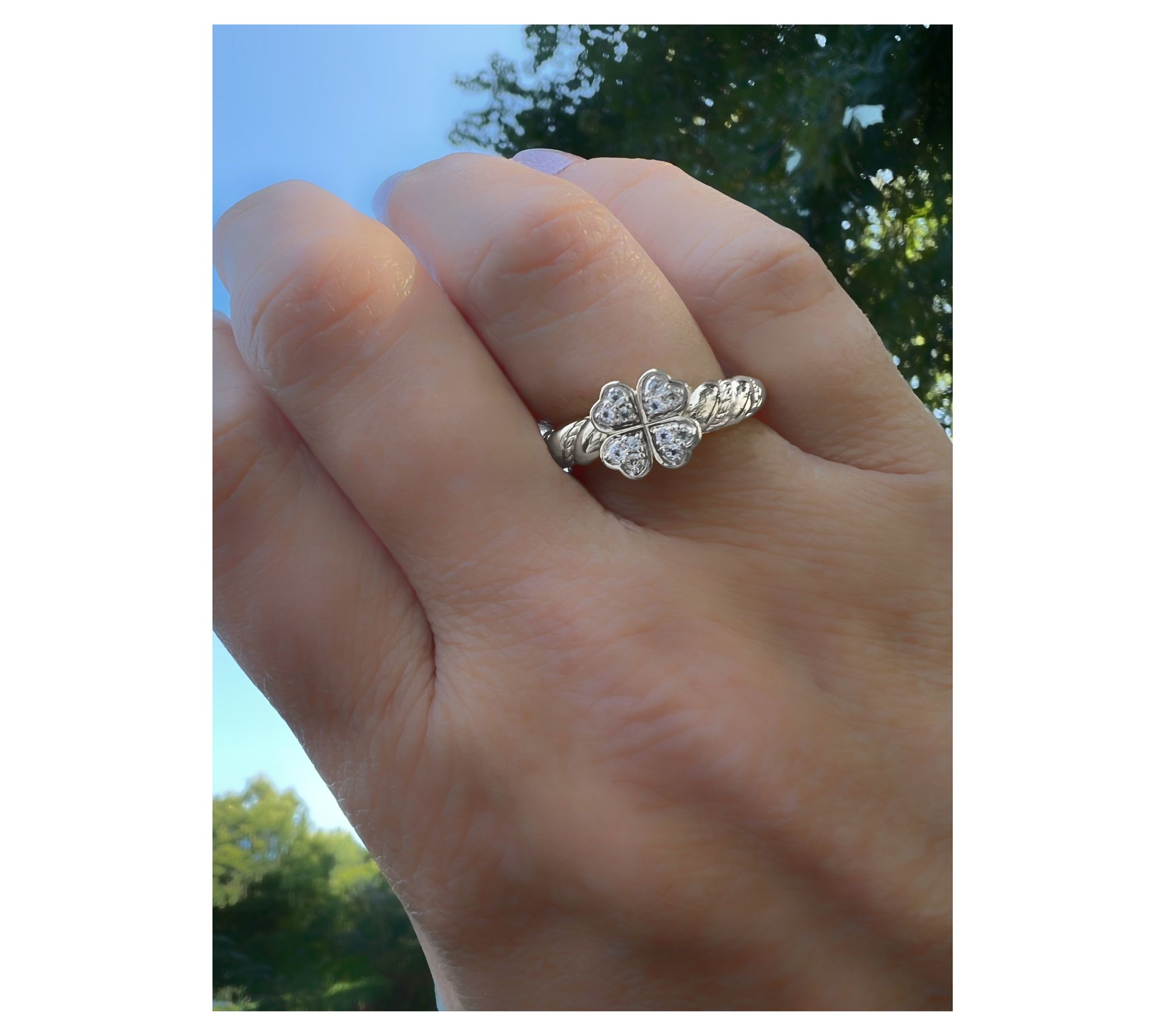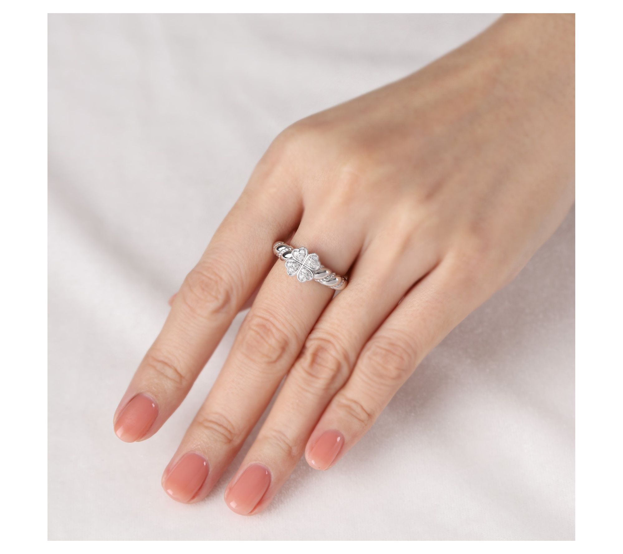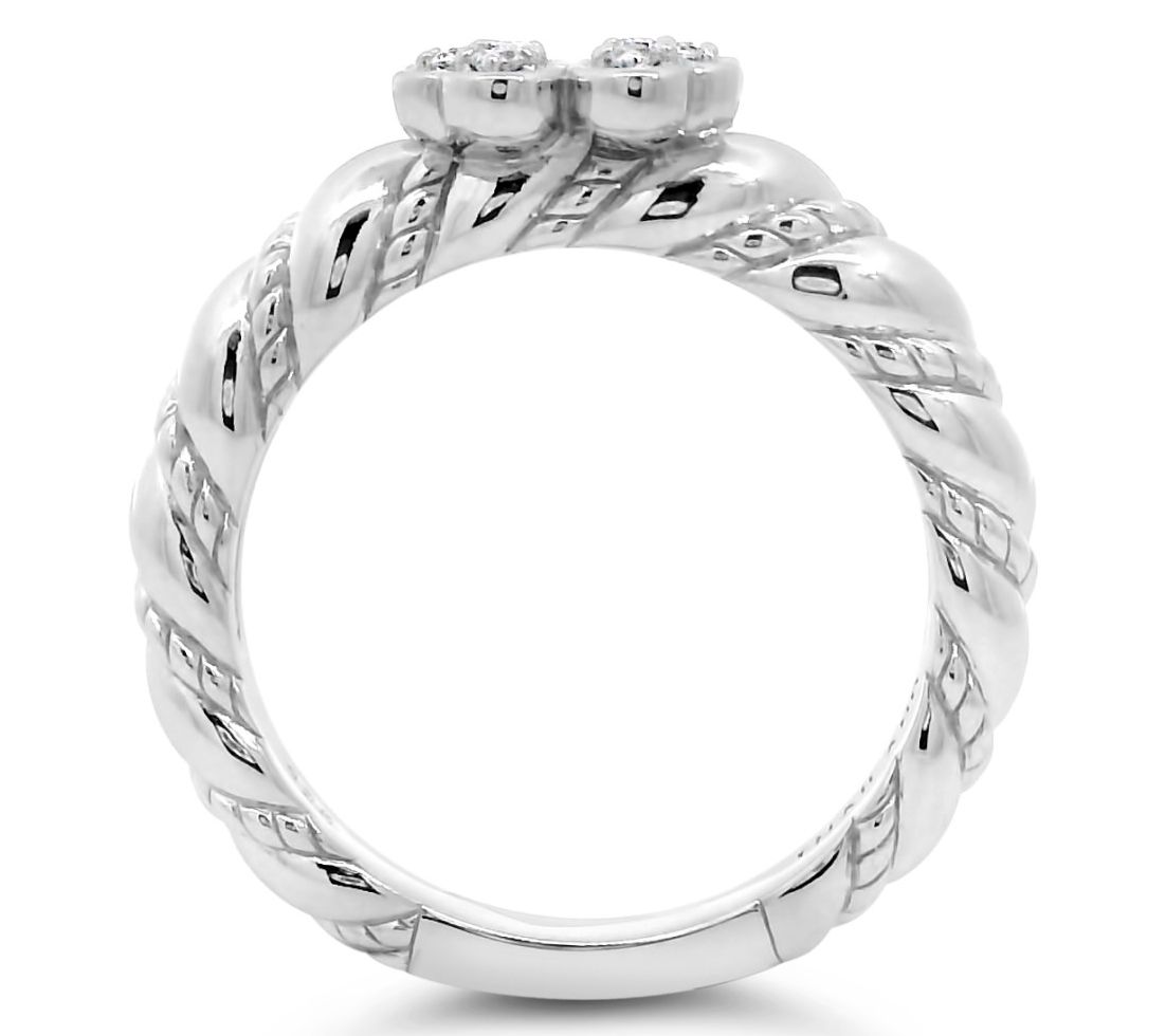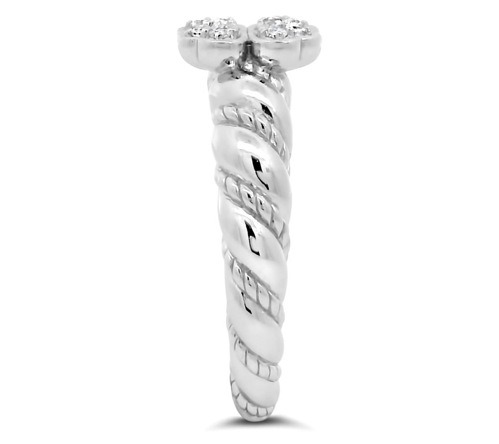 Four heart shapes combine to fashion a clover; round, pave-set white topaz gemstones; twisted design on band; polished finish