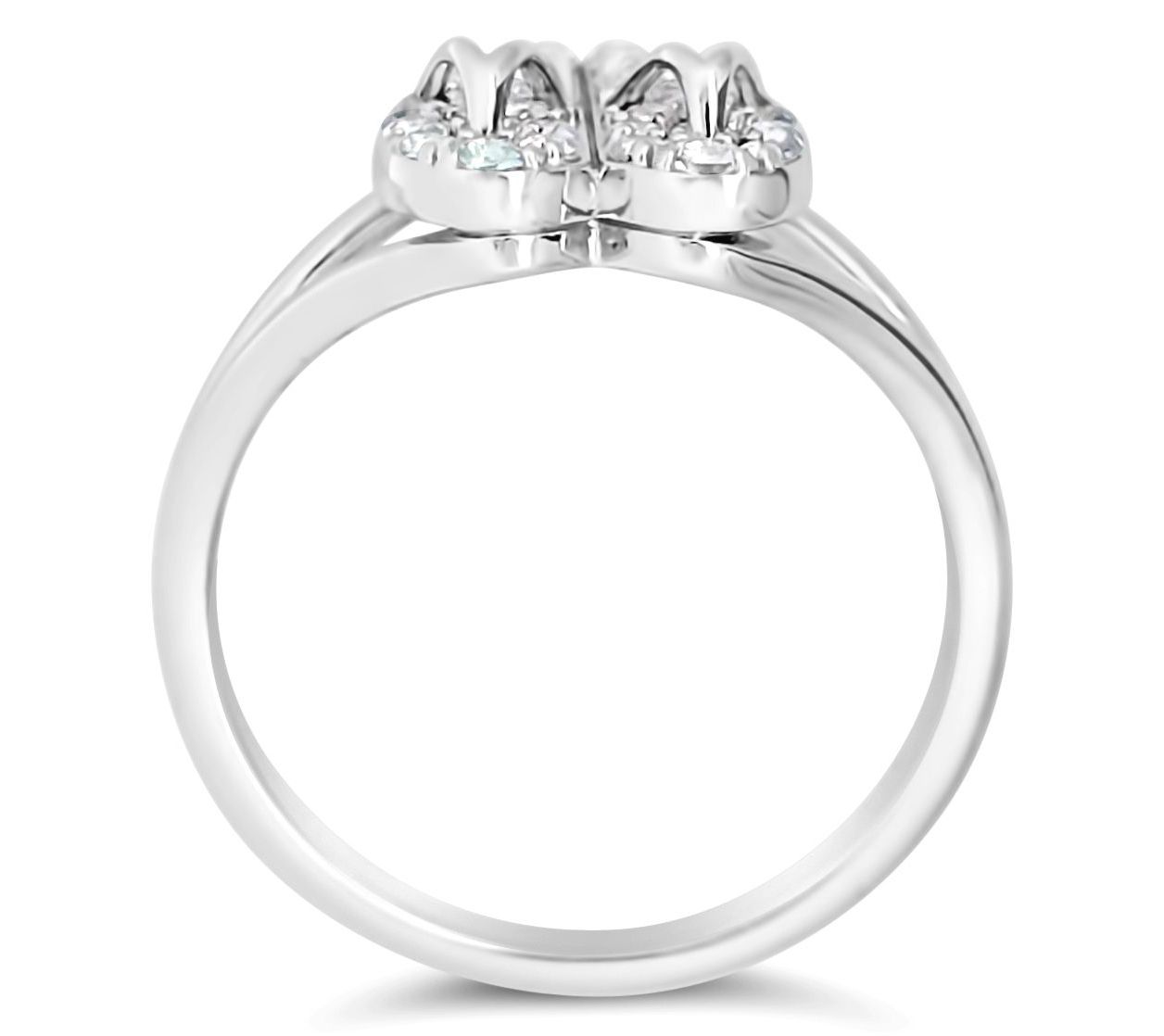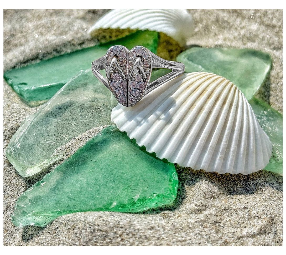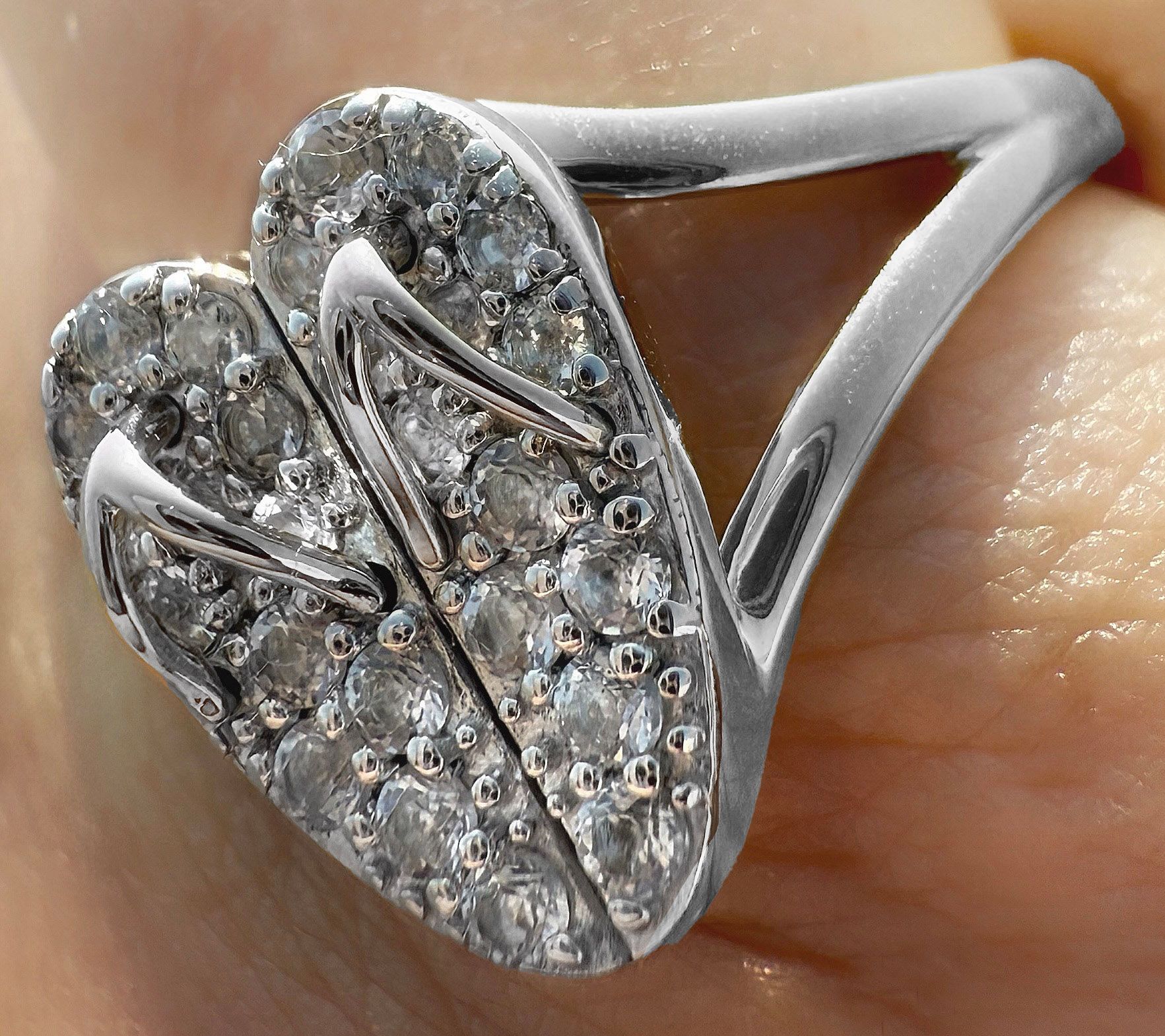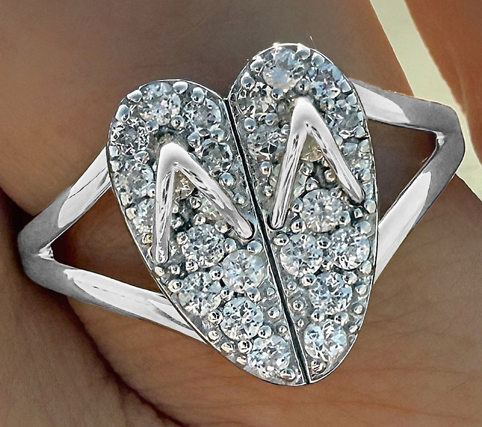 Two flip flops connected in a heart design; wishbone thongs; pave-set white topaz gemstones; split shank