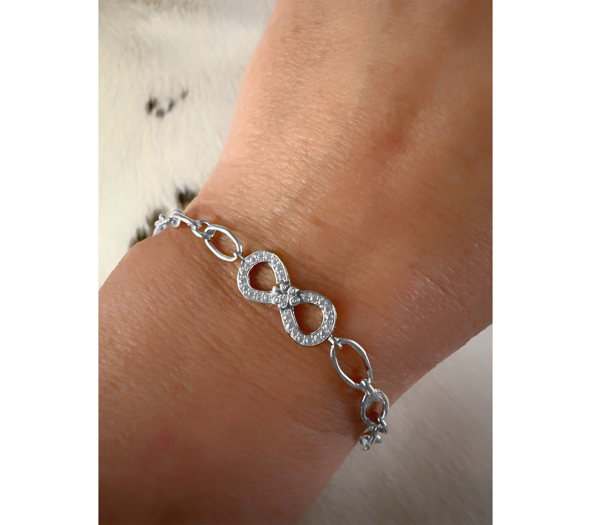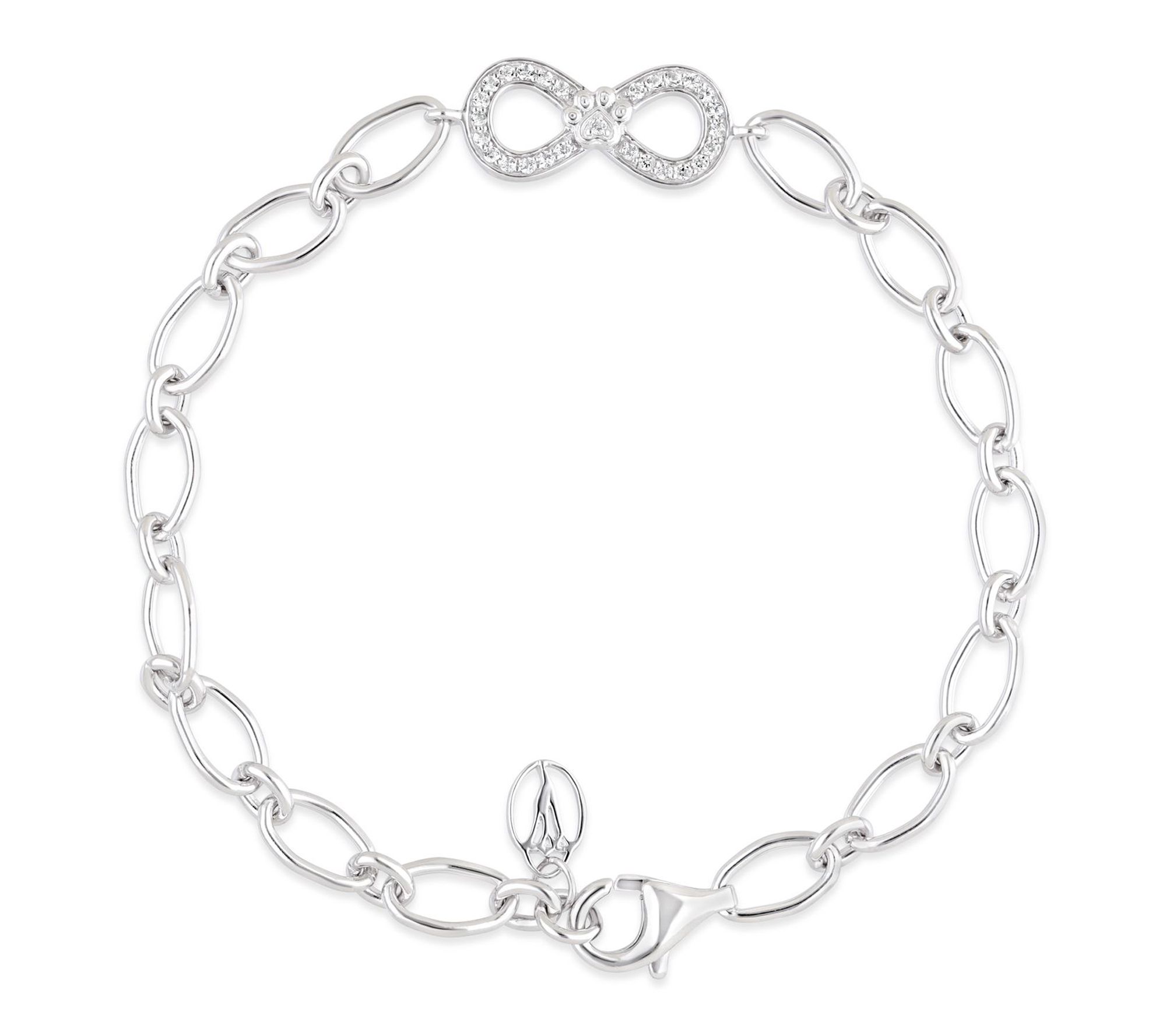 Whether you're celebrating a special bond or adding a heartfelt touch to your everyday look, this sterling silver bracelet brings meaning to every moment. The infinity paw design adorned with sparkling white topaz is a sweet reminder of loyalty and love -- ideal for gifting to a cherished loved one or wearing as your own token of affection. From Goddaughters.
