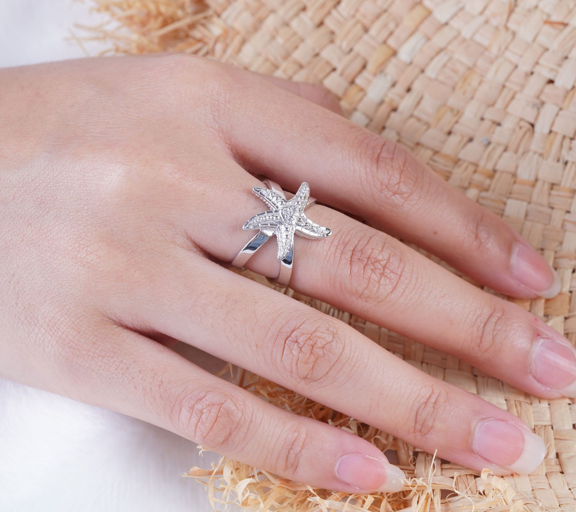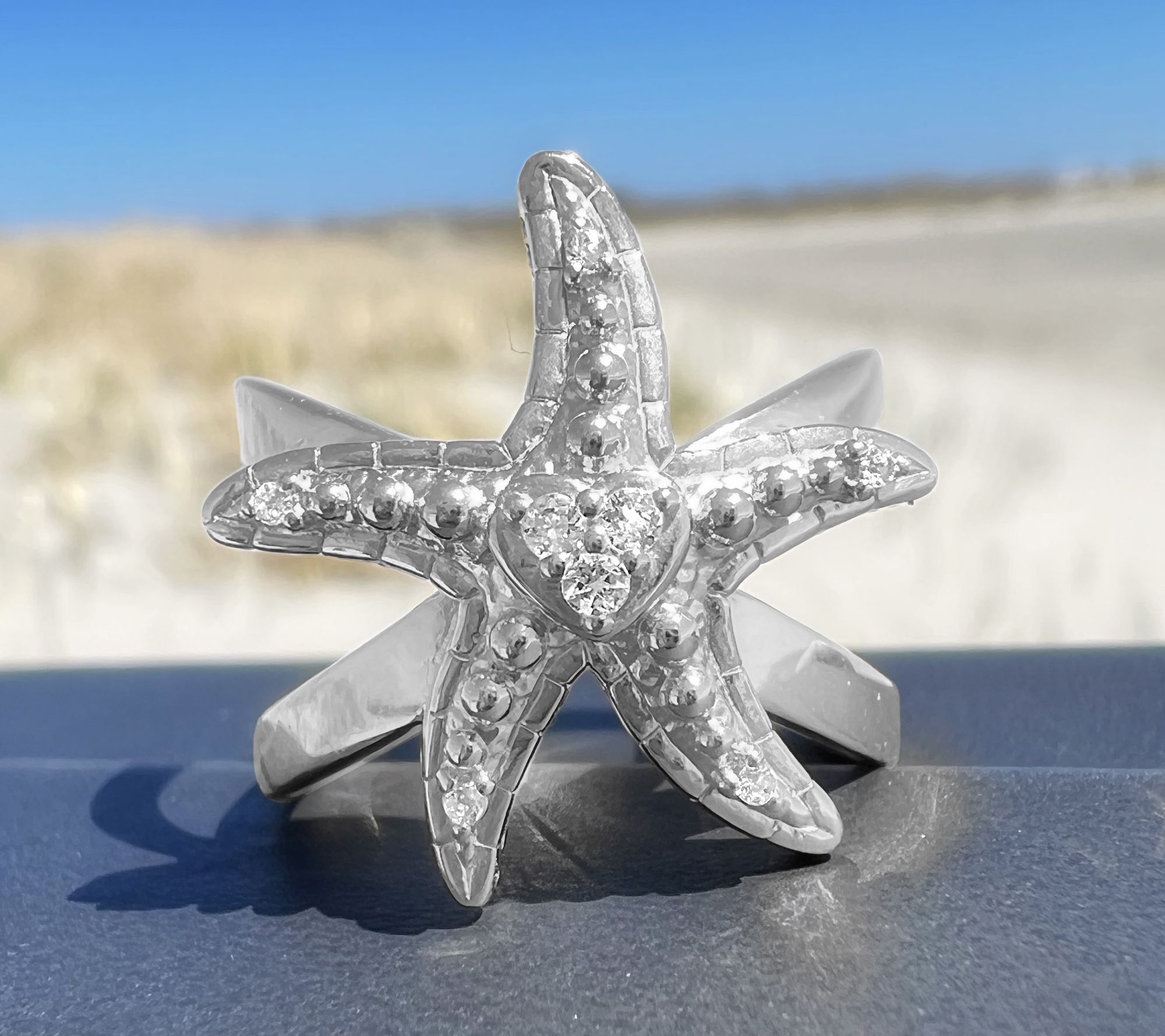 Starfish design accented with round, pave-set white topaz gemstones; heart-shaped motif in the center; split shank