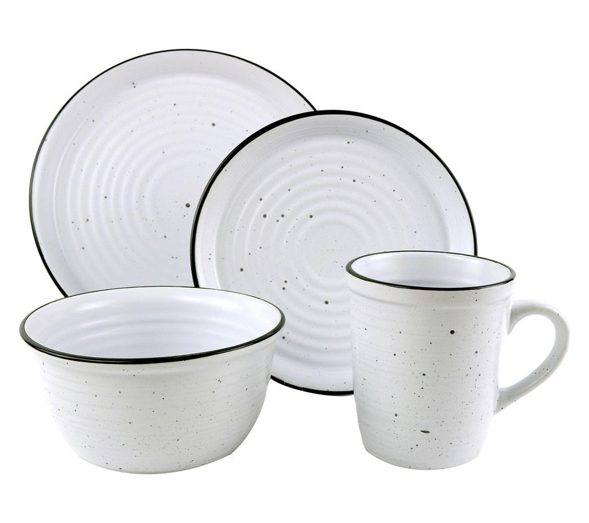 • Includes four dinner plates, four salad plates, four bowls, and four mugs