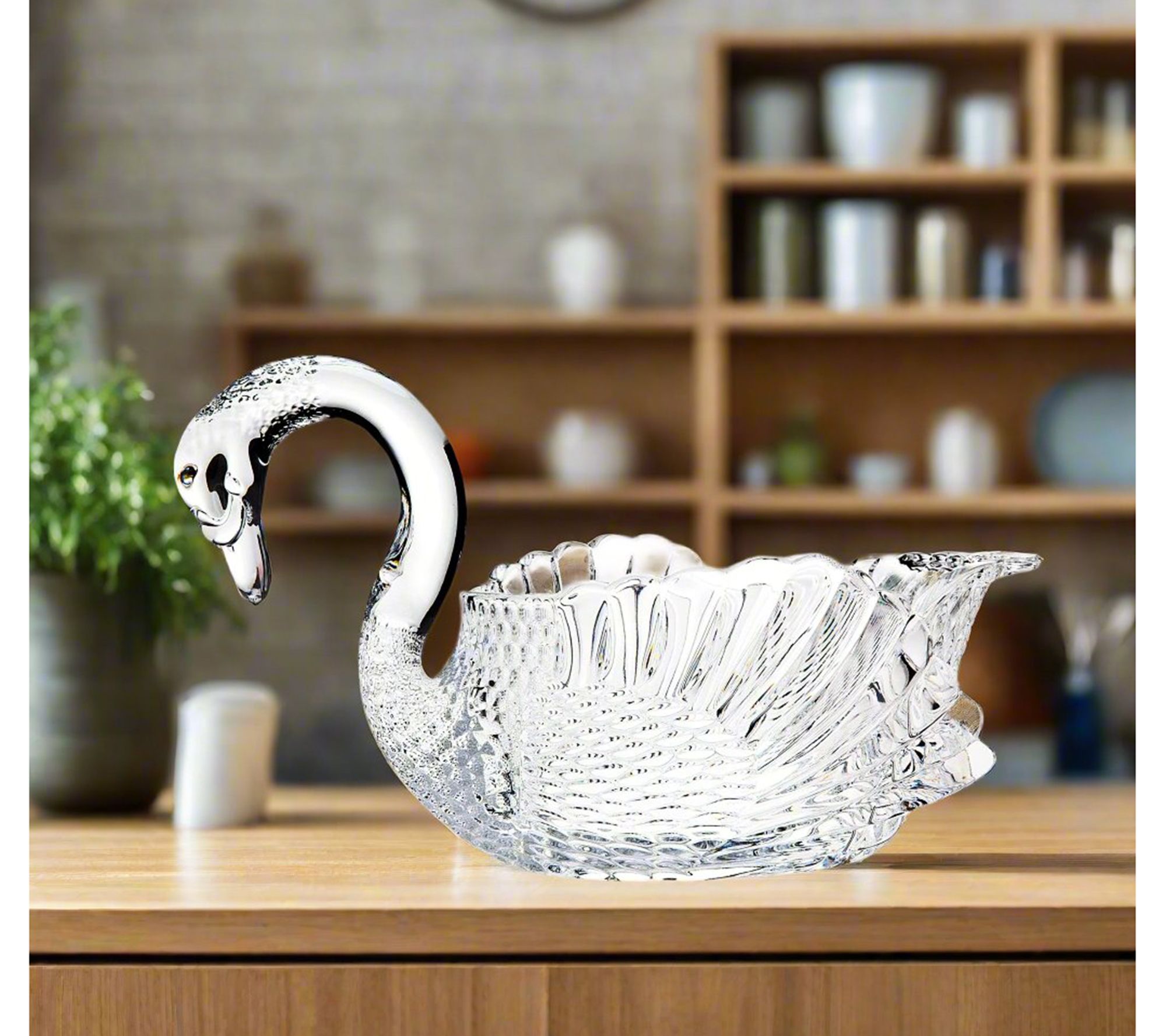 Graceful curves and a delicate design define the simple beauty of this crystal swan bowl, perfect as a centerpiece or for serving snacks. From Godinger.