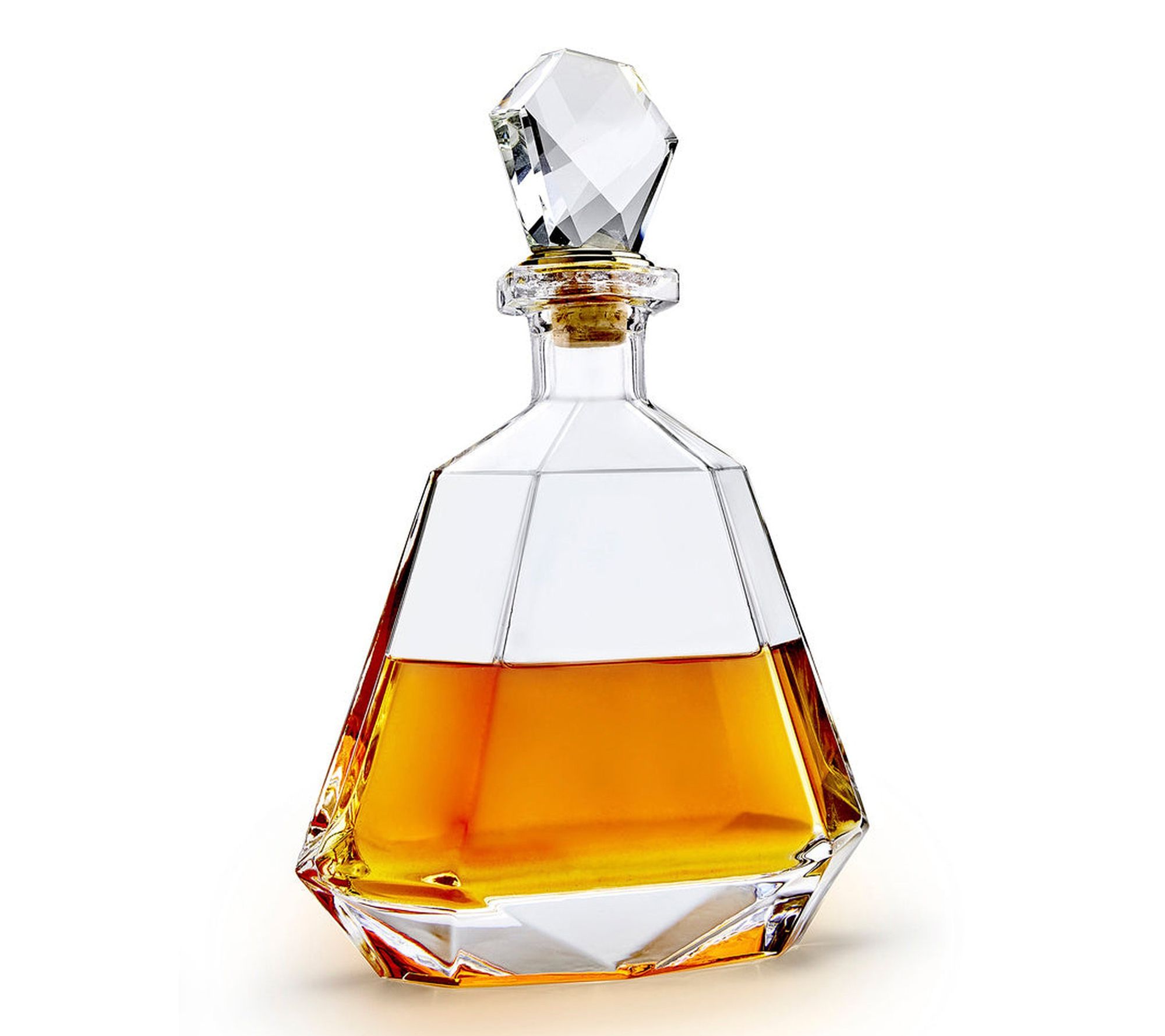 Impress your guests with the elegance of the Divina whiskey decanter. Featuring triangle crystal cut glass and a faceted topper, this exquisite piece elevates your bar cart with a touch of sophistication. From Godinger.
