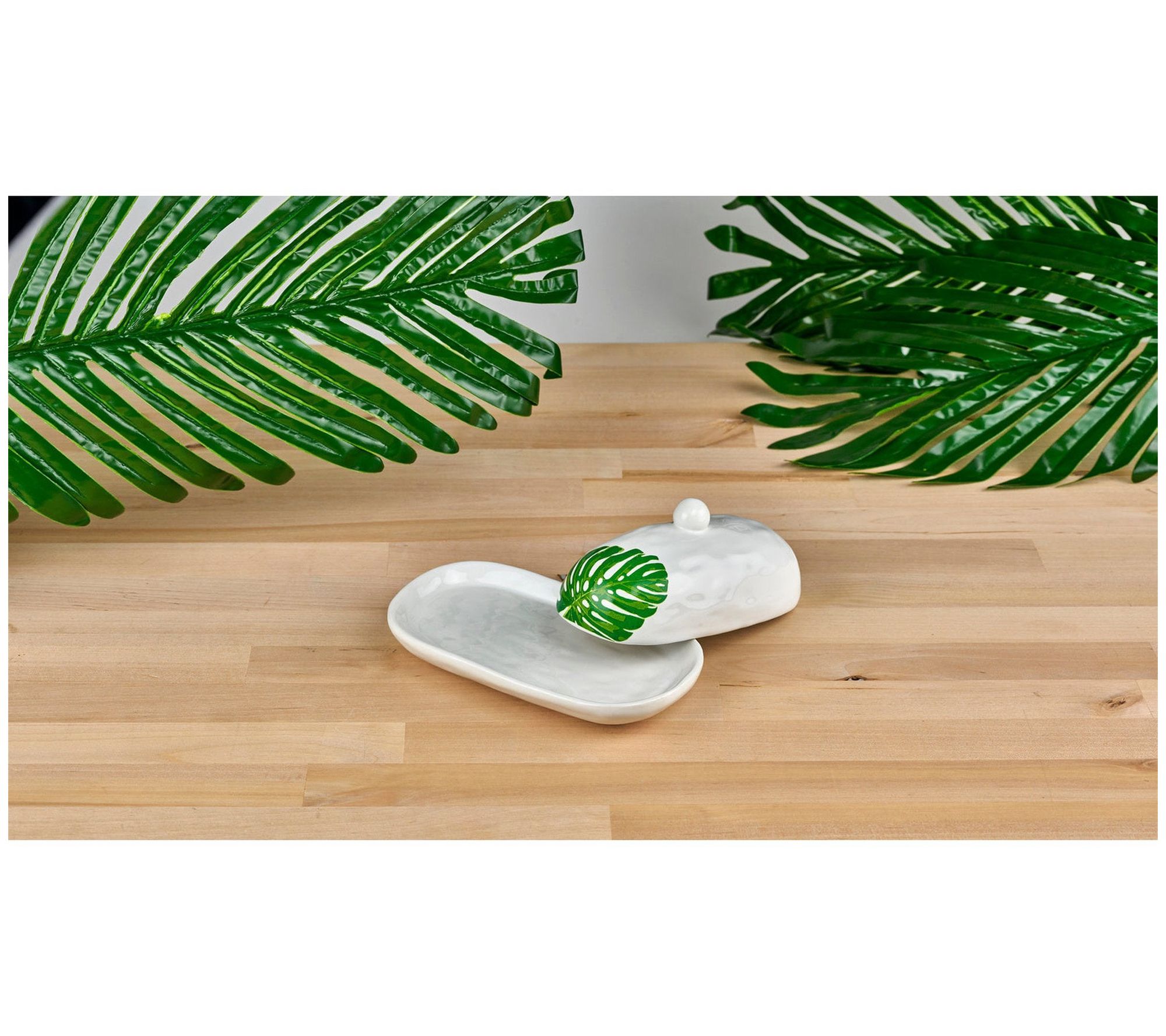 Special occasions and everyday meals become more delightful with this Monstera palm leaf butter dish. Elevate your kitchen decor with its ceramic texture and nature-inspired design. Its porcelain construction ensures both sturdiness and style. From Godinger.