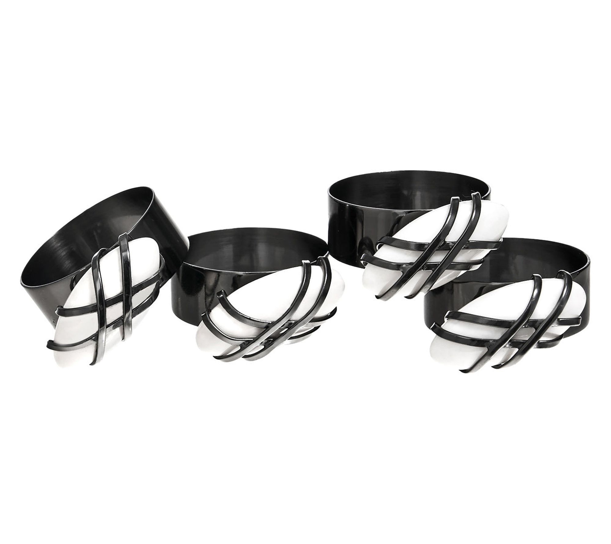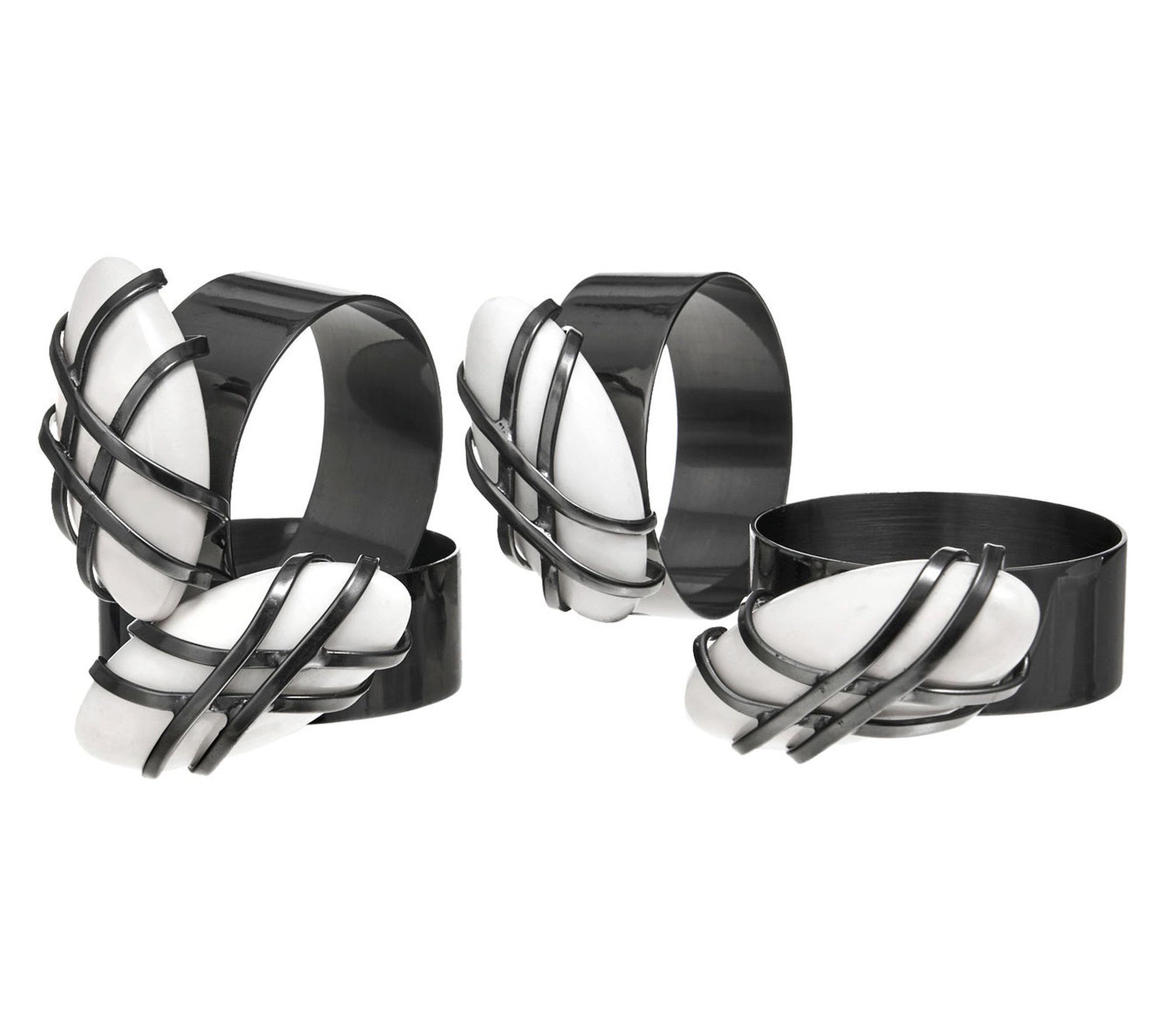 Godinger's intricately designed napkin accessory transforms ordinary dining moments into a visual masterpiece. The brilliant contrast of midnight metal paired with pristine white pebbles crafts a striking visual, turning your table setting into a radiant work of art. Enjoy the sophisticated fusion of hues that brings elegance and style to every meal. From Godinger.