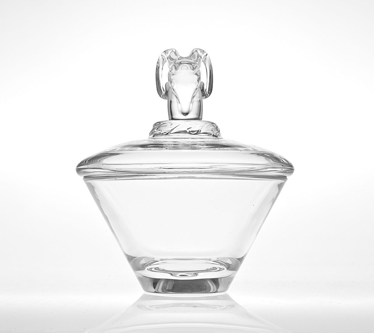 Topped by a spiral-horned ram's head stopper, this crystal glass covered storage container brings intrigue to your space. From Godinger.
