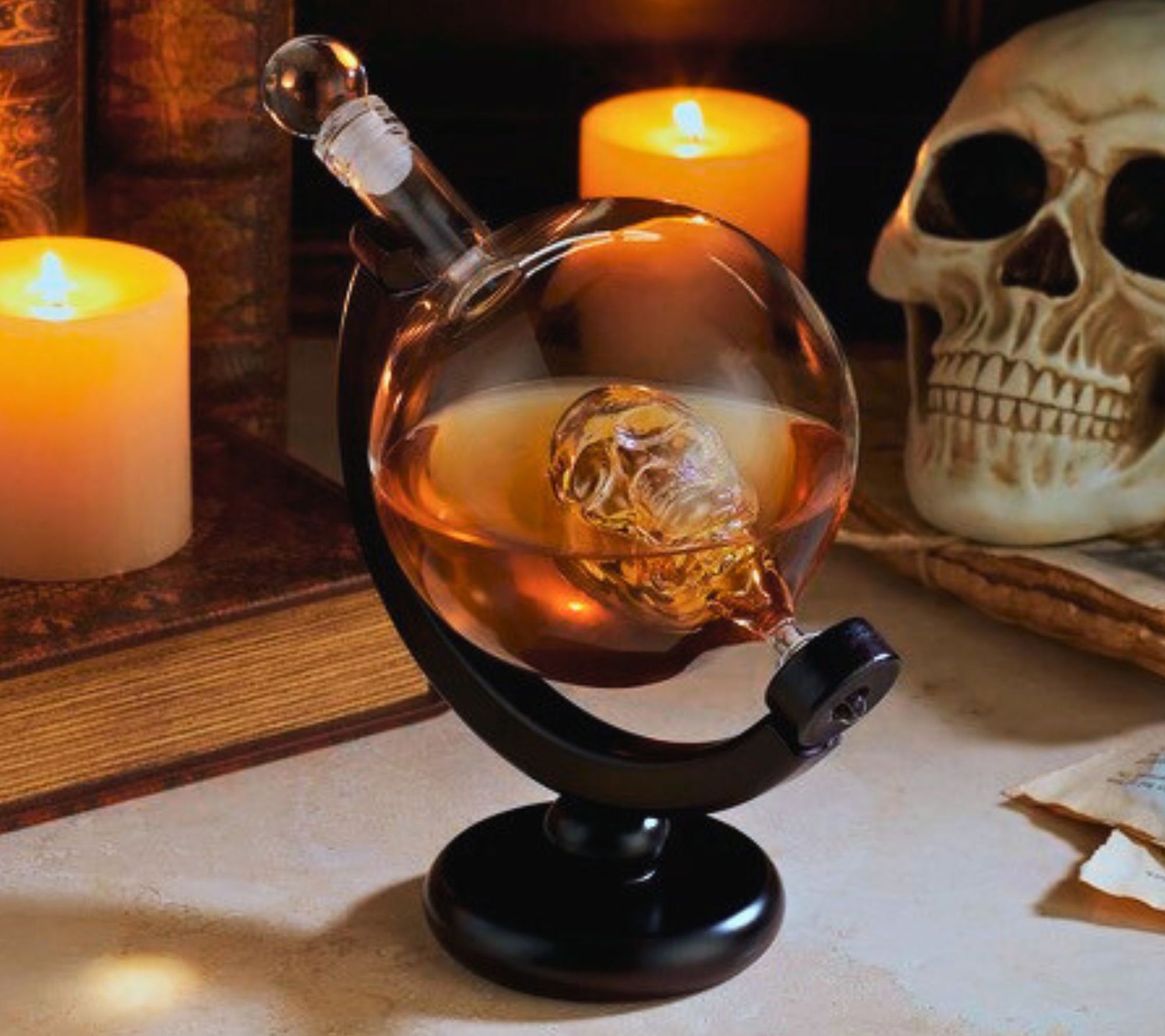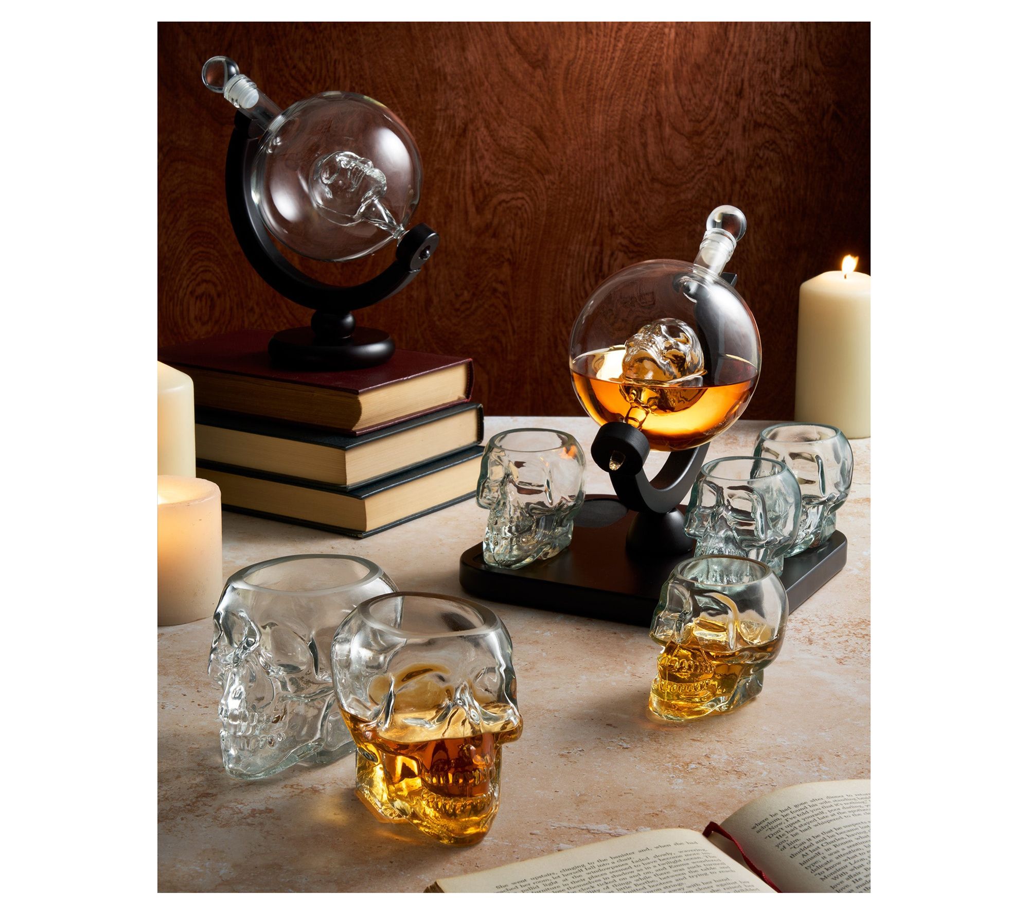 The Godinger skull whiskey decanter offers a distinctive look, featuring a round whiskey decanter with a floating skull and a wooden base. It makes for an eye-catching centerpiece at any celebration. From Godinger.