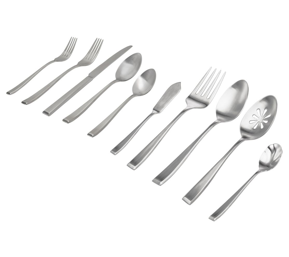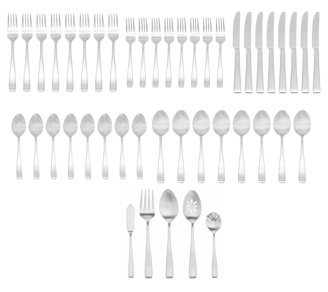 • Includes eight dinner forks, eight salad forks, eight teaspoons, eight tablespoons, eight knives, one butter knife, one sugar spoon, one serving fork, one serving spoon, and one pierced serving spoon