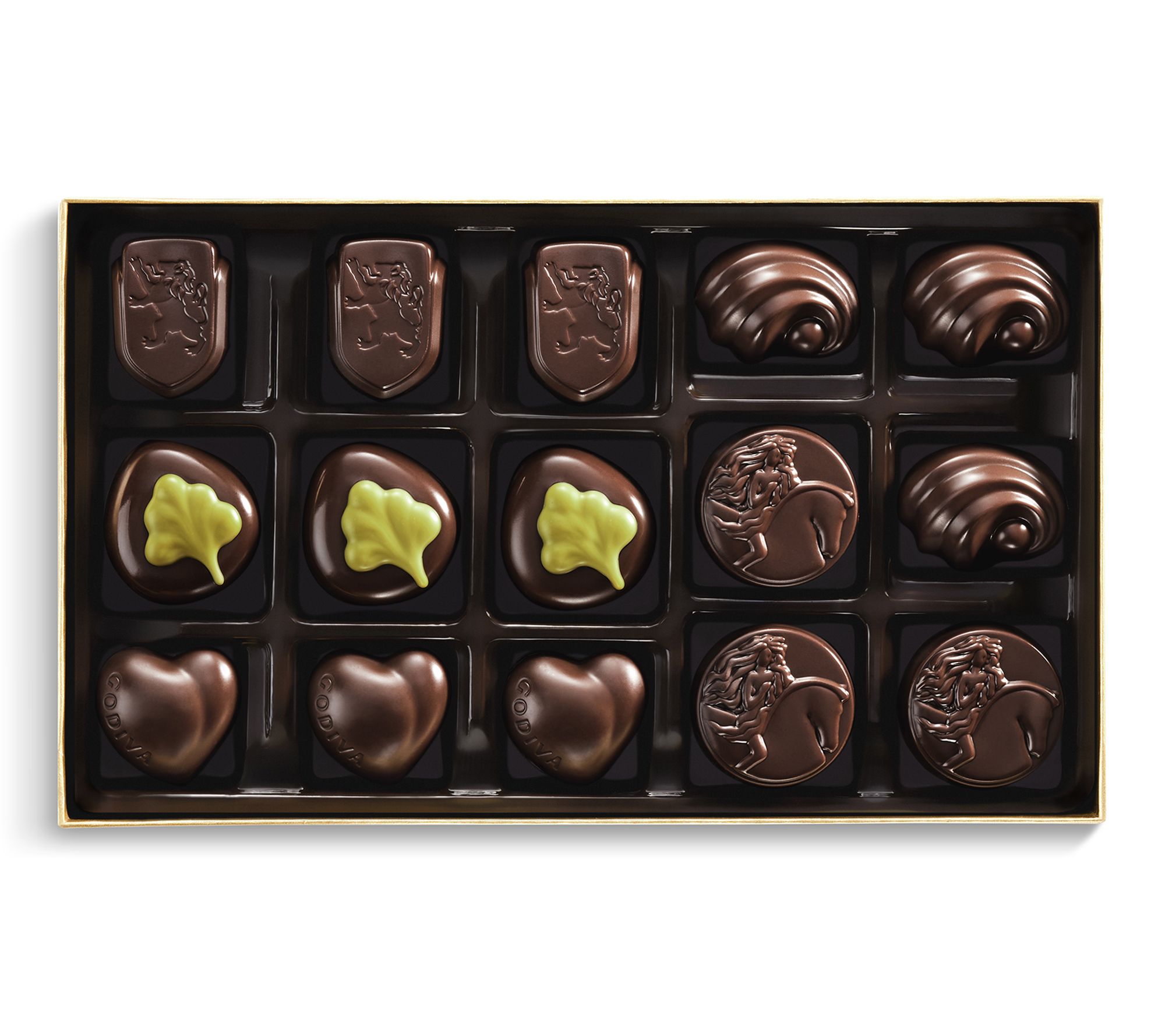 • Assortment includes 15 dark chocolate pieces featuring five flavors: Dark & White Chocolate Lady Godiva, Salted Caramel Lion of Belgium, Gone with a Pistachio Feather, Dark Chocolate Ganache Sweetheart, and Midnight Swirl
