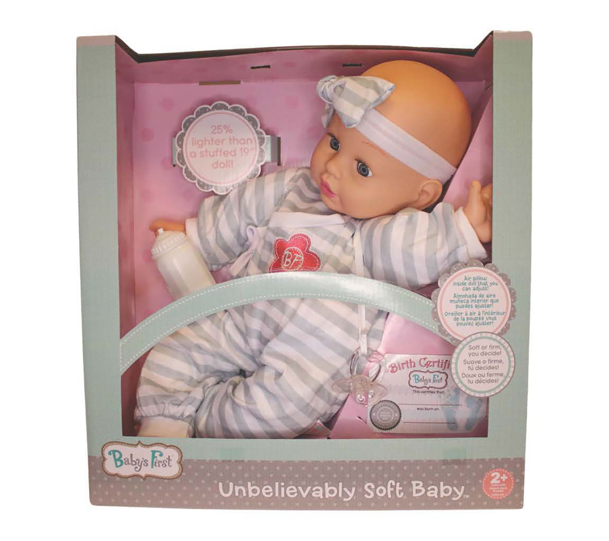 Little ones can snuggle, nurture, and care for this soft-body doll, designed to inspire imaginative play and sweet moments of pretend parenting. Lightweight and easy to carry, its air pillow tummy makes playtime comfortable for tiny arms, while surface-washable construction helps keep things tidy after busy days of fun. From Goldberger.