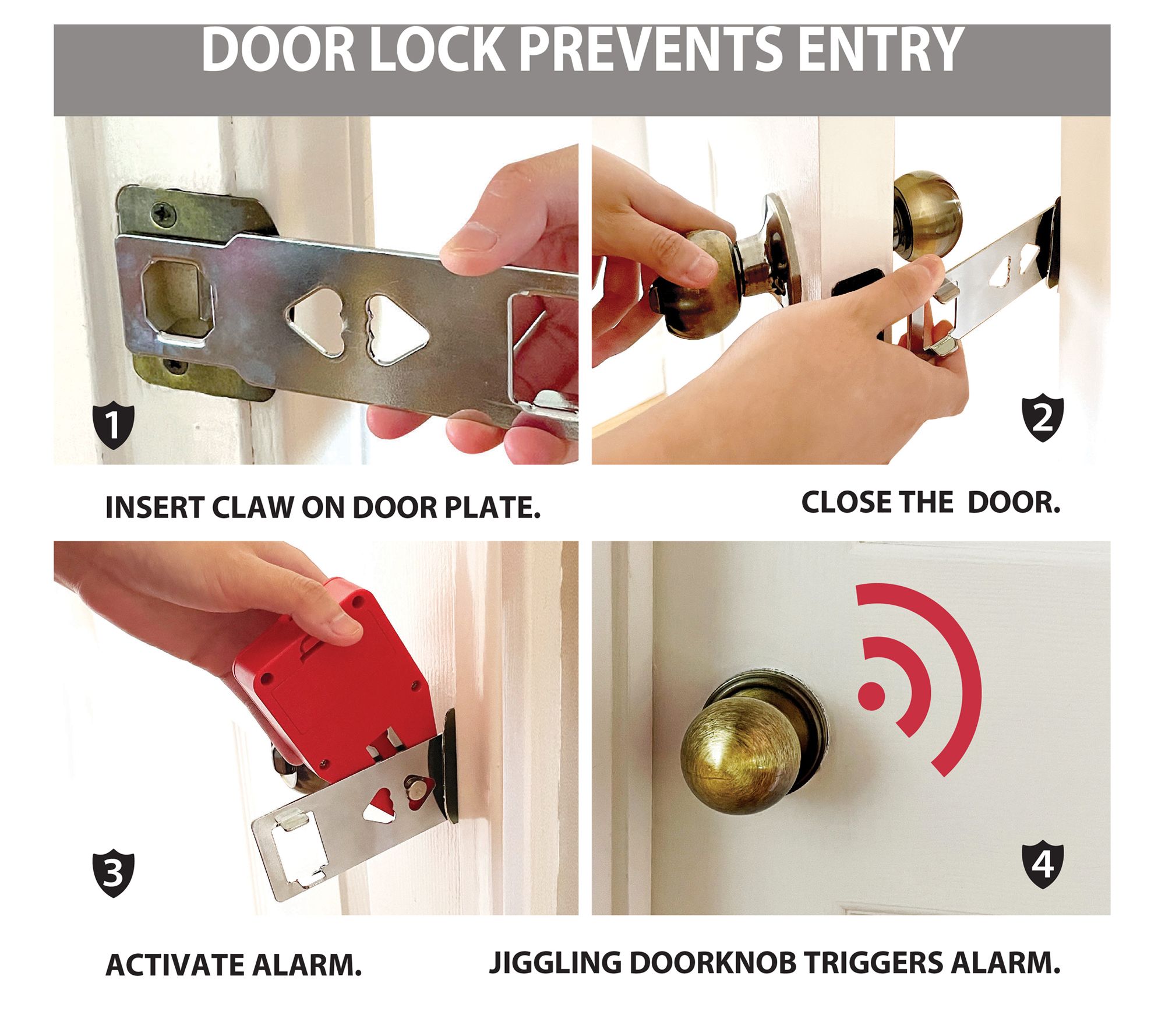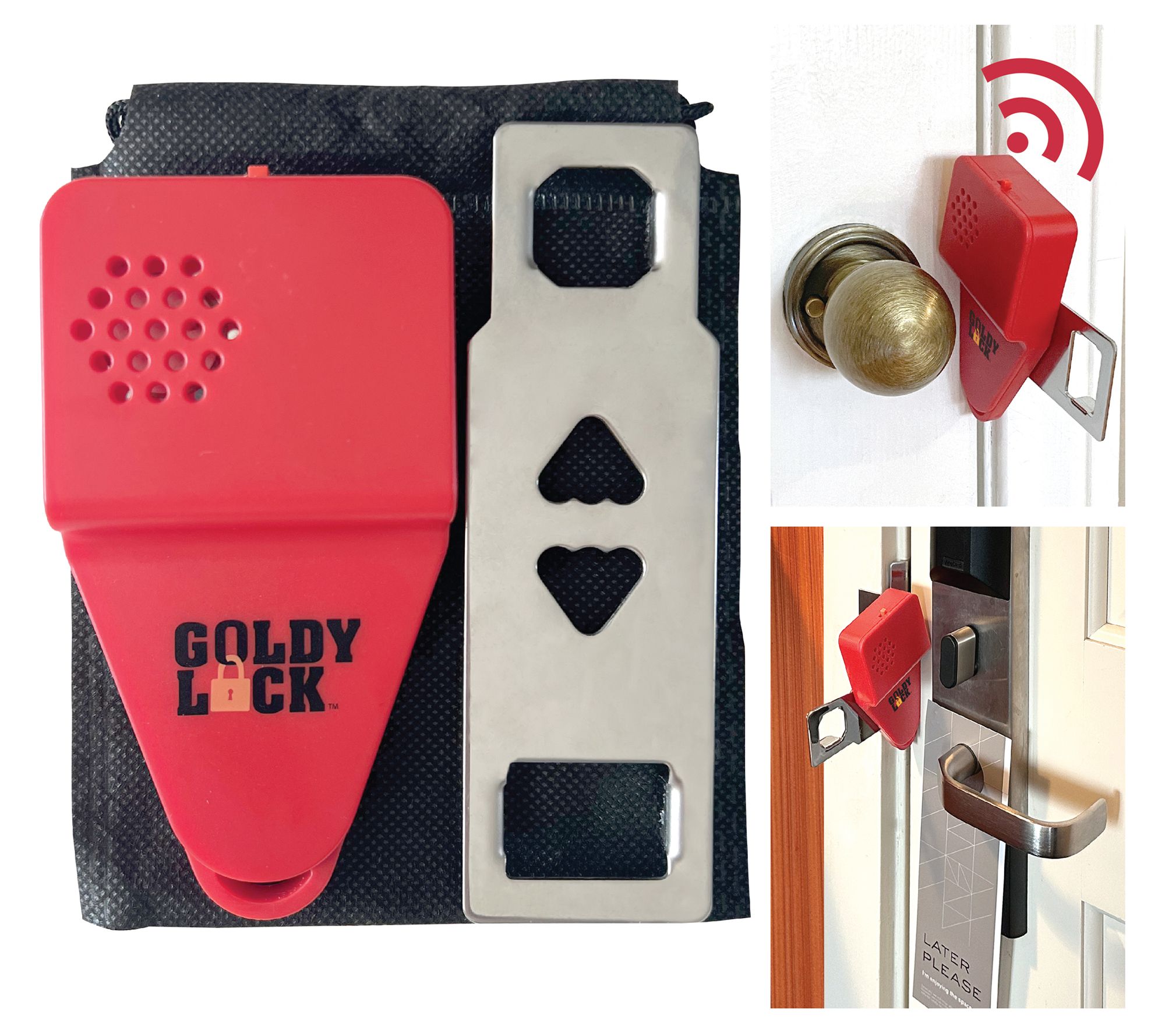 Includes two portable door locks with built-in alarm and two storage pouches