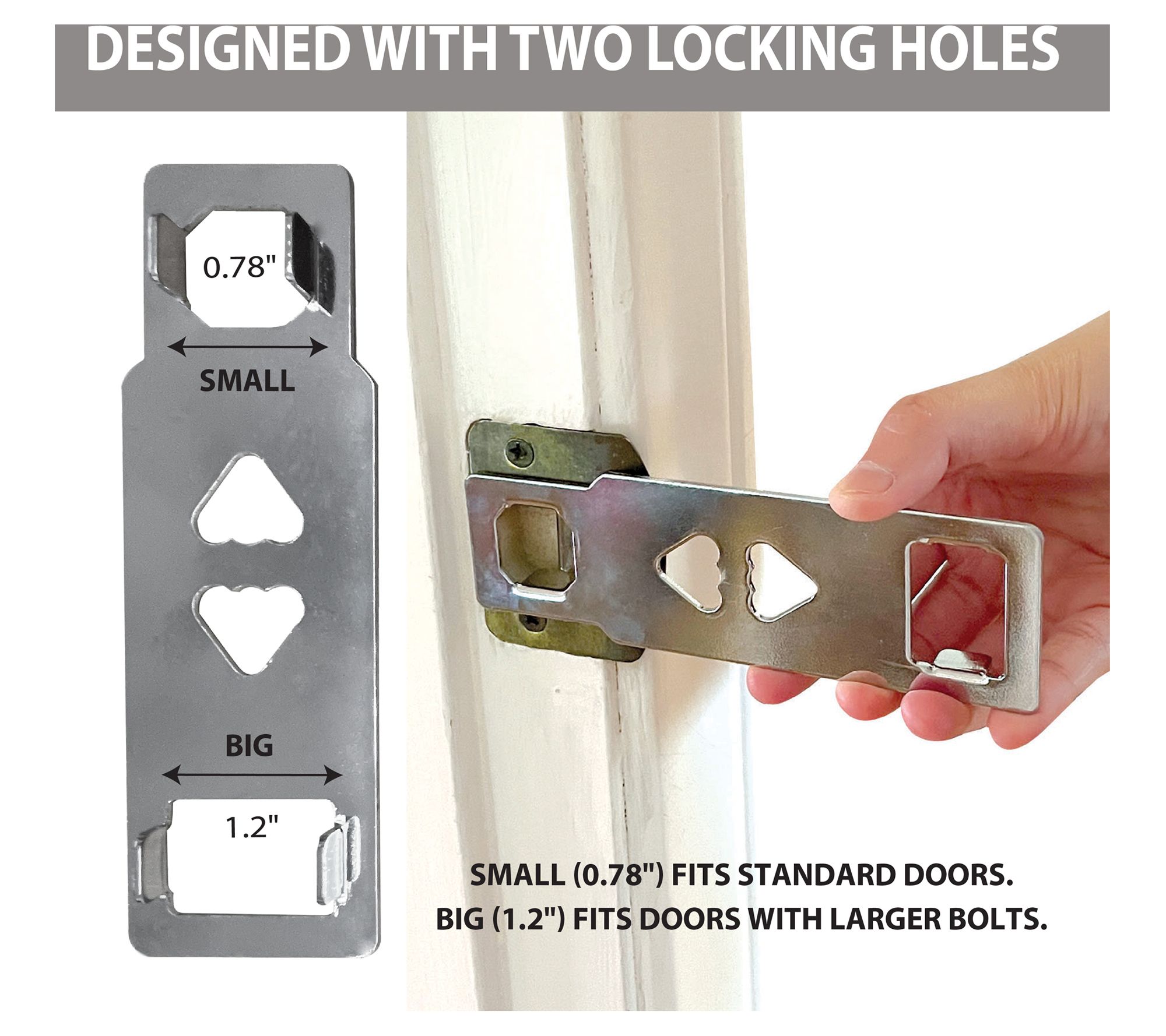 Two locking holes on steel claw fit standard and large bolt doors