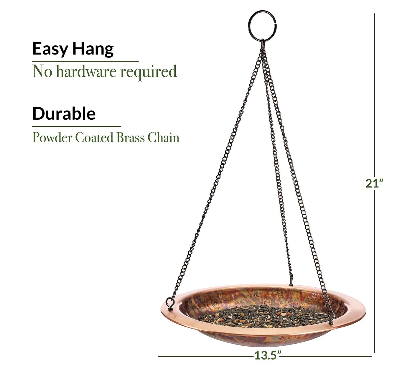 Enhance your garden with the Good Directions hanging copper bird bath. Featuring an artisan-hammered 13.5" pure copper bowl and a decorative lip, this bird bath allows birds to perch comfortably. Its natural copper construction helps maintain a sanitary environment for your feathered friends. From Good Directions.