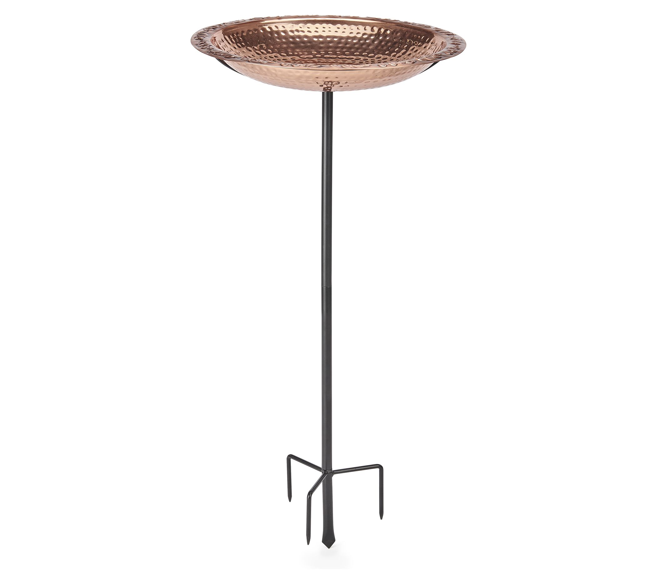 Elevate your garden's charm with the Good Directions 18" pure copper bird bath with garden pole. This artisan-hammered copper bowl offers a decorative lip for birds to perch and sip, while the four-prong base ensures stability. It's a delightful addition to any outdoor space. From Good Directions.