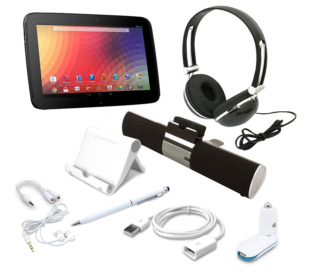 Includes Google Nexus 10 tablet, USB sync/charge cable, dual-voltage USB wall charger, stylus pen, earbud headphones, 6'L extension cable, tablet stand, headphone splitter, car charger, Bluetooth speaker bar, and DJ-style hard-shell headphones