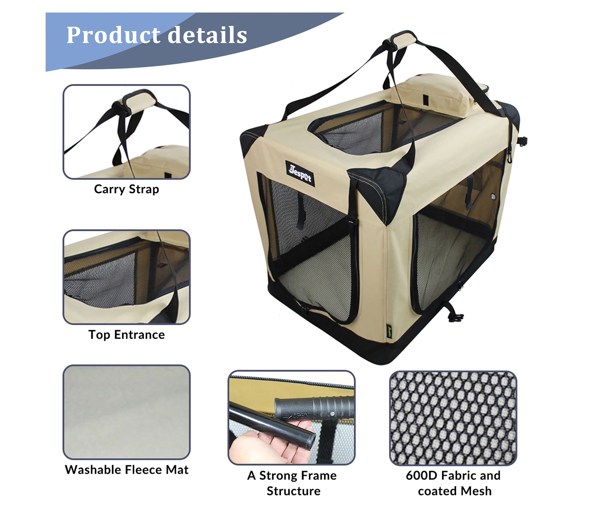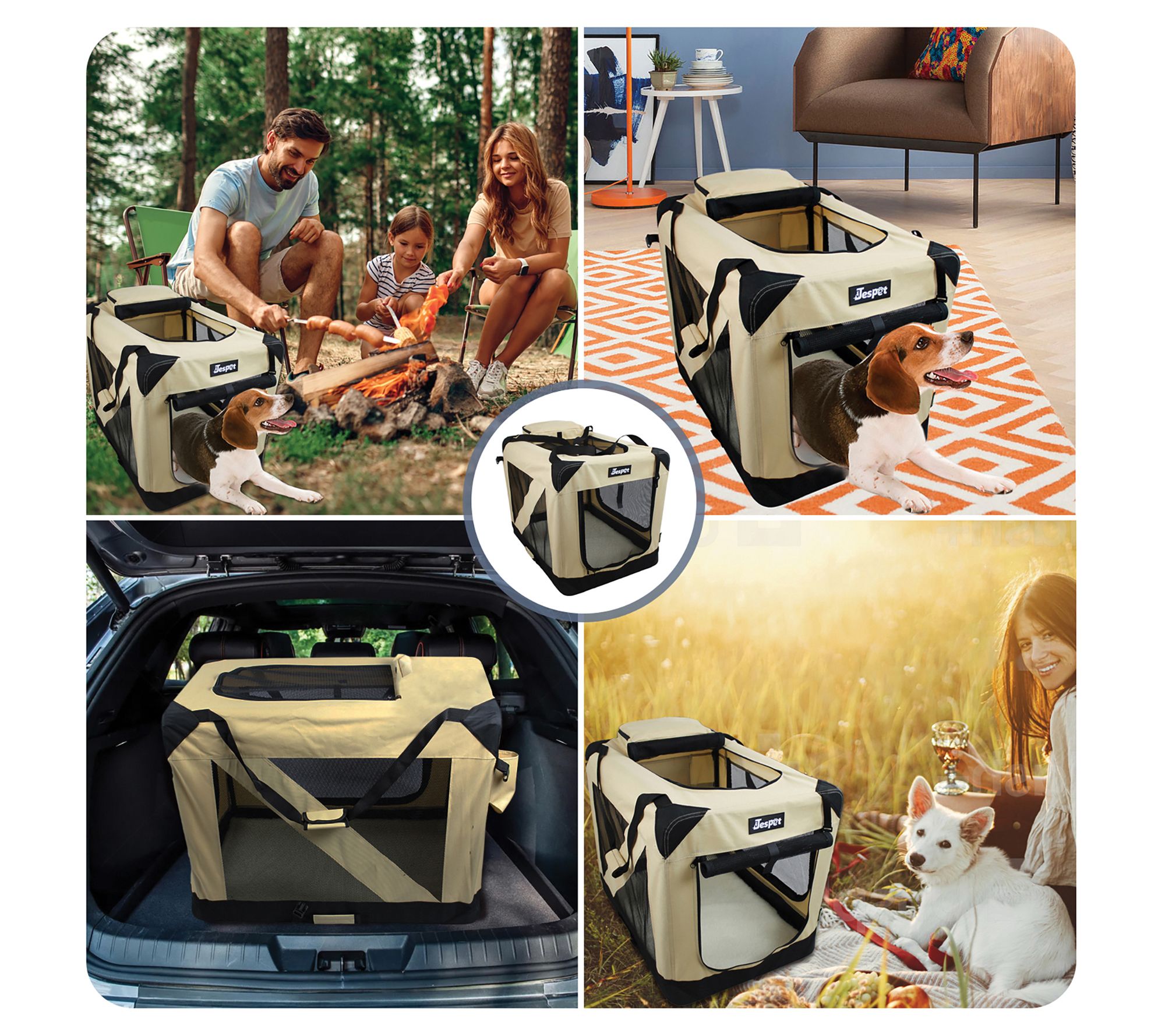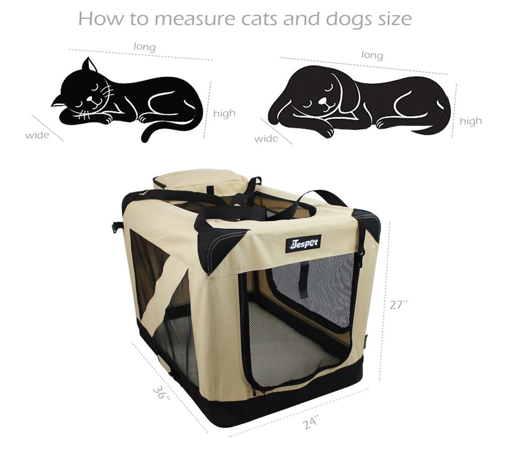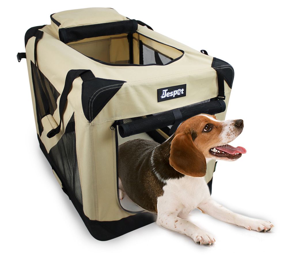 Soft-sided crate designed to give your furry friend a comfortable place to rest. Features 3 entrance doors for easy access and ventilation for your paw-tner. Made of steel tubes with a durable, washable cover to withstand the outdoors. Includes a fleece bed and adjustable strapsfor comfort and convenience. Stores away simply with collapsible barsand retractable springs. Give your furry friend a comfortable place to rest with the JesPet Soft-Sided Dog Crate. It features three entrance doors for easy access and to provide your paw-tner with plenty of v;includes a fleece bed and adjustable straps for comfort and convenience. With collapsible bars and retractable springs, Soft-Sided Dog Crate