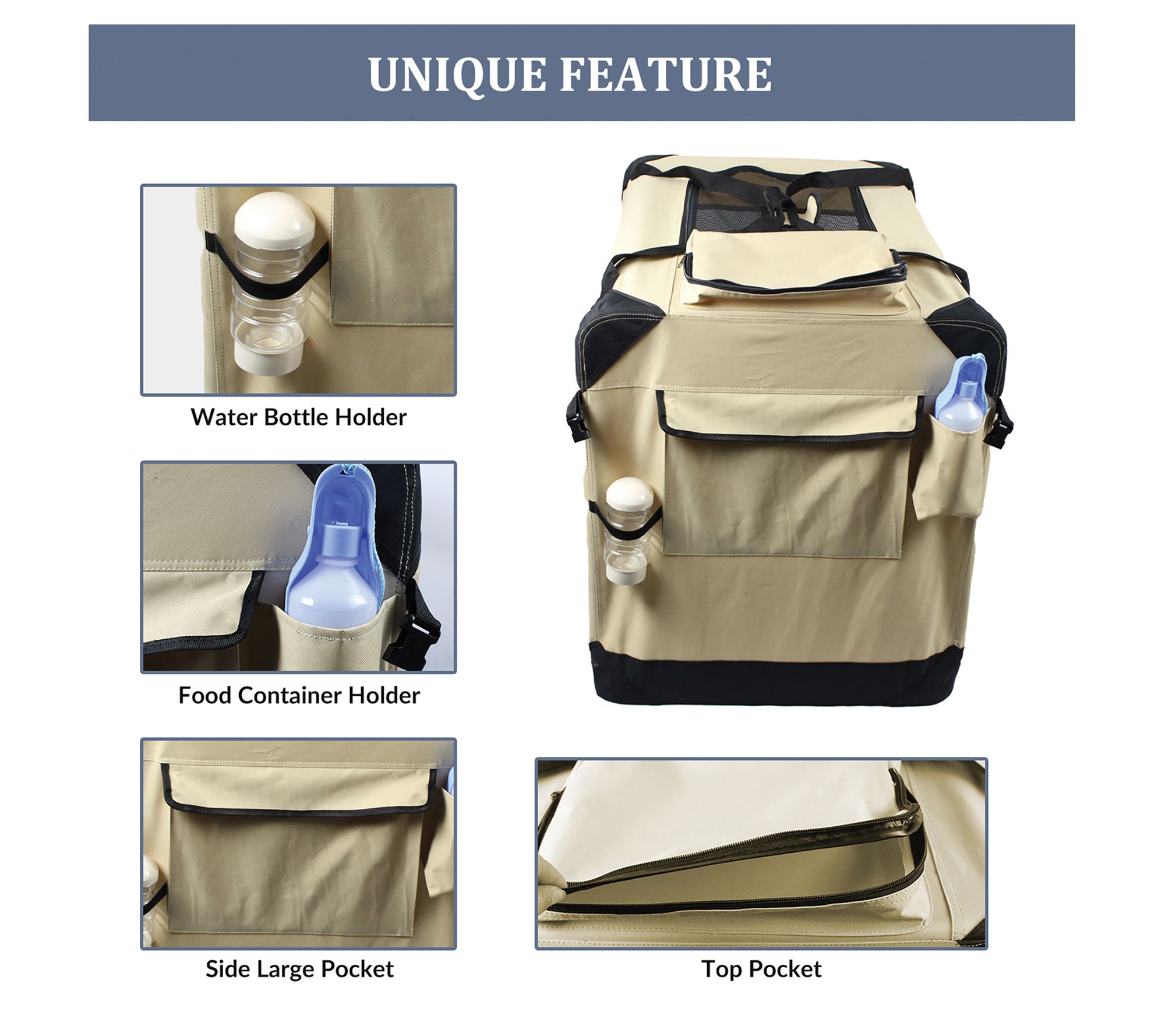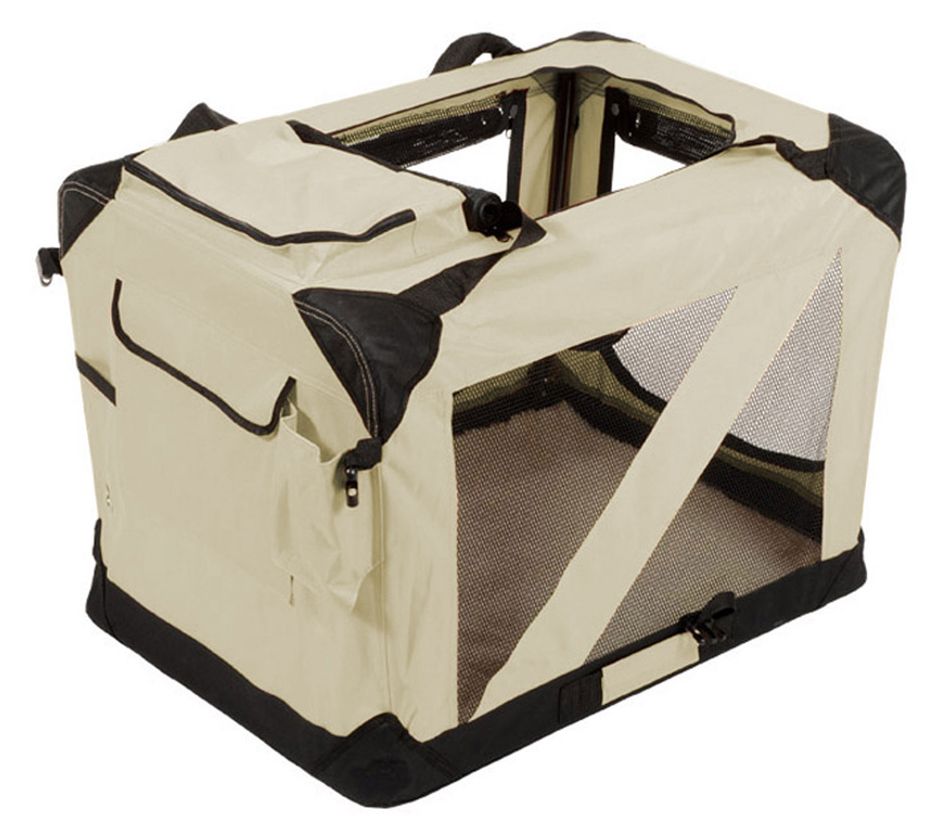 Includes soft-sided dog crate with fleece bed and adjustable straps