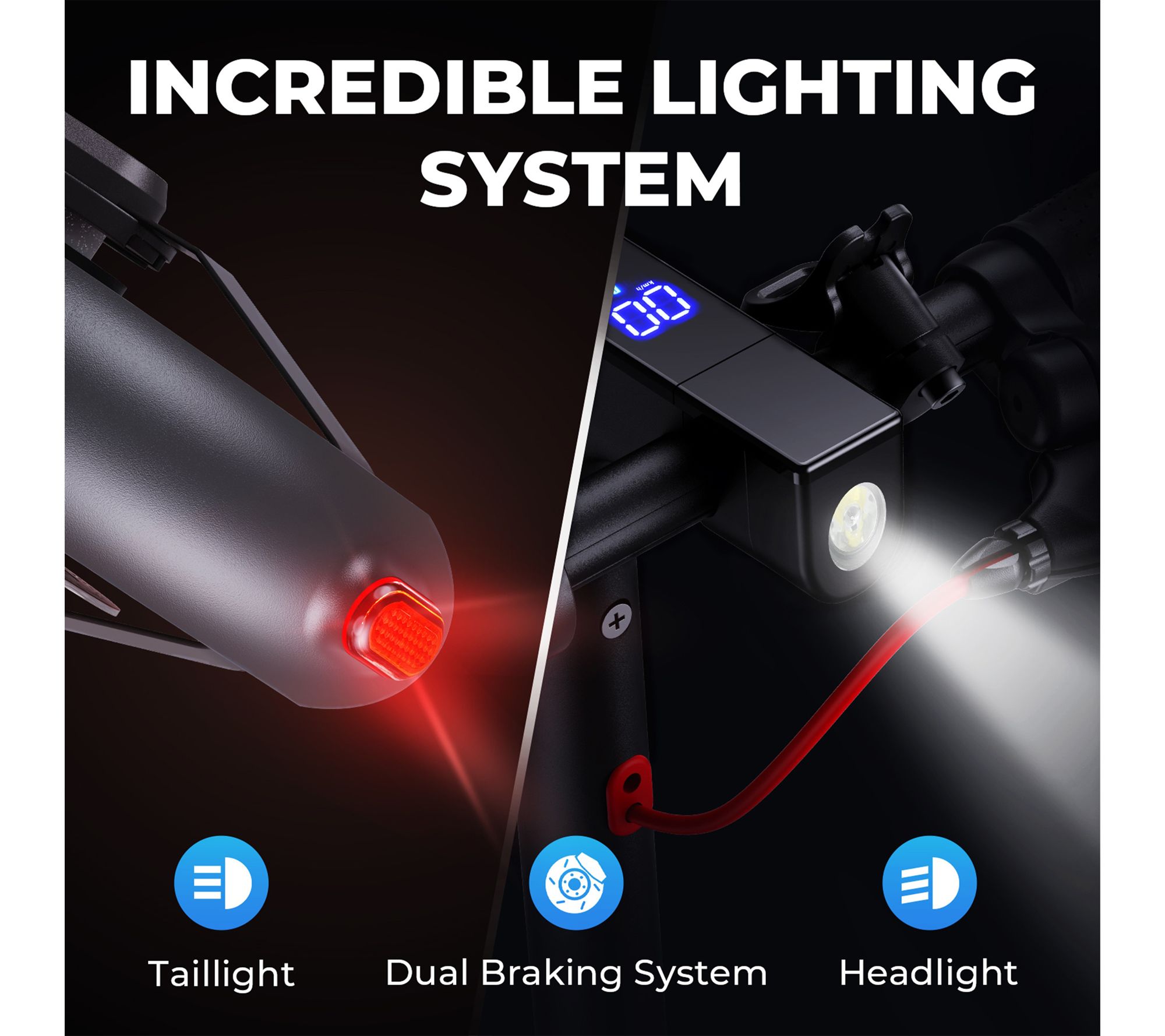 Integrated LED display shows speed, battery level, gear, and lights