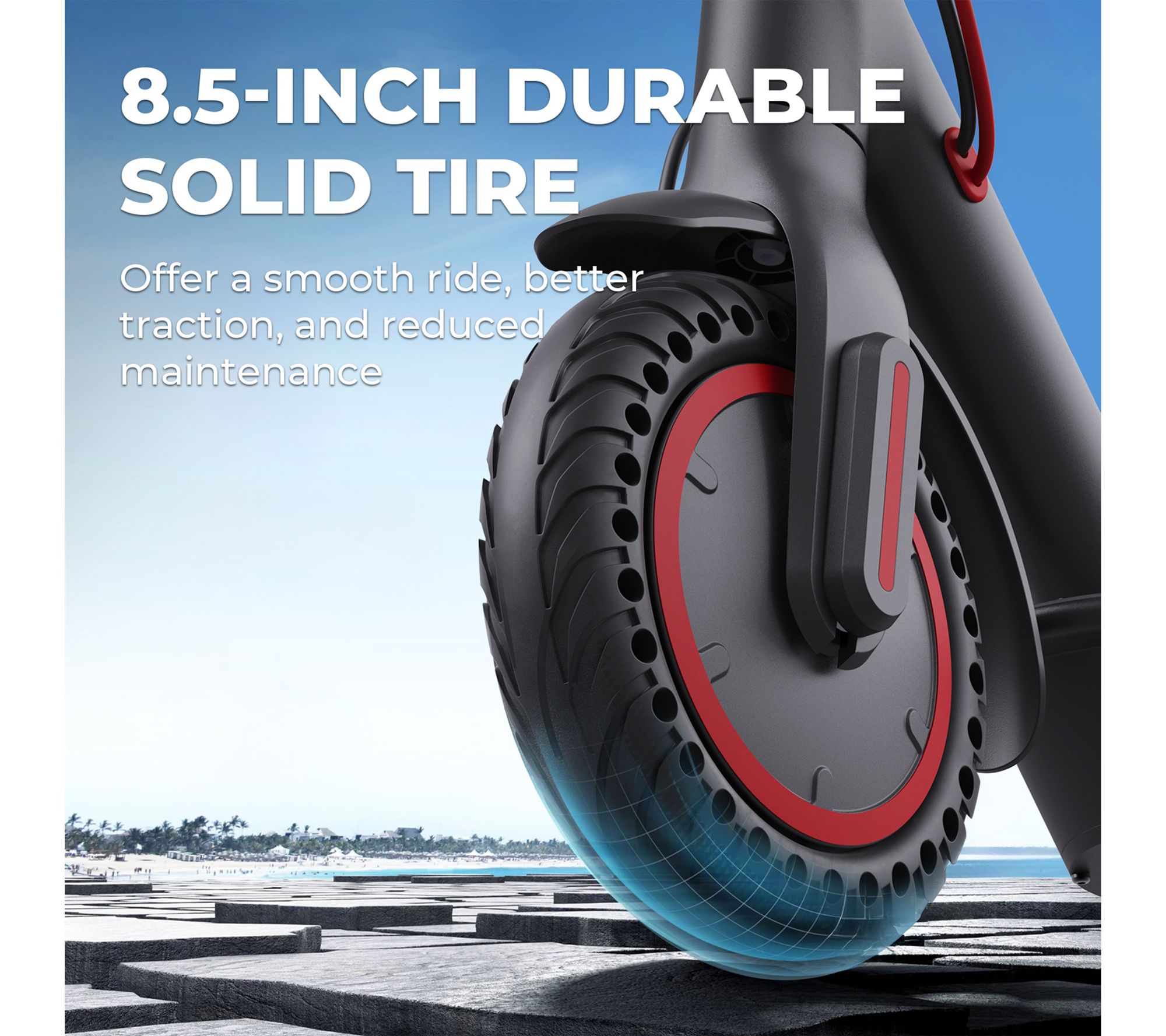 Solid 8.5" tires are puncture-resistant