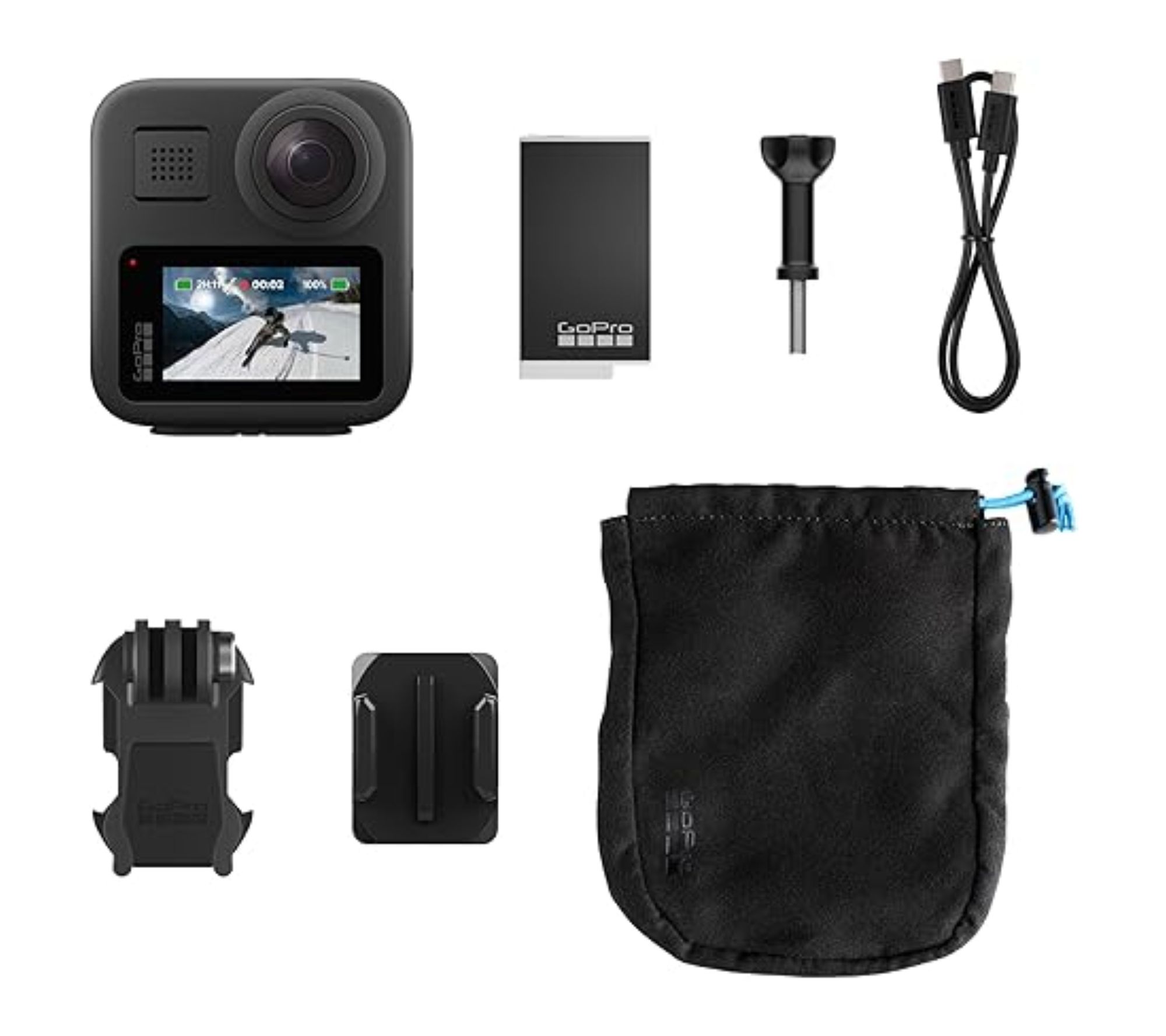 • Includes GoPro MAX Camera, Enduro battery, curved adhesive mount, mounting buckle, thumb screw, USB-C cable, two protective lens caps, and microfiber bag