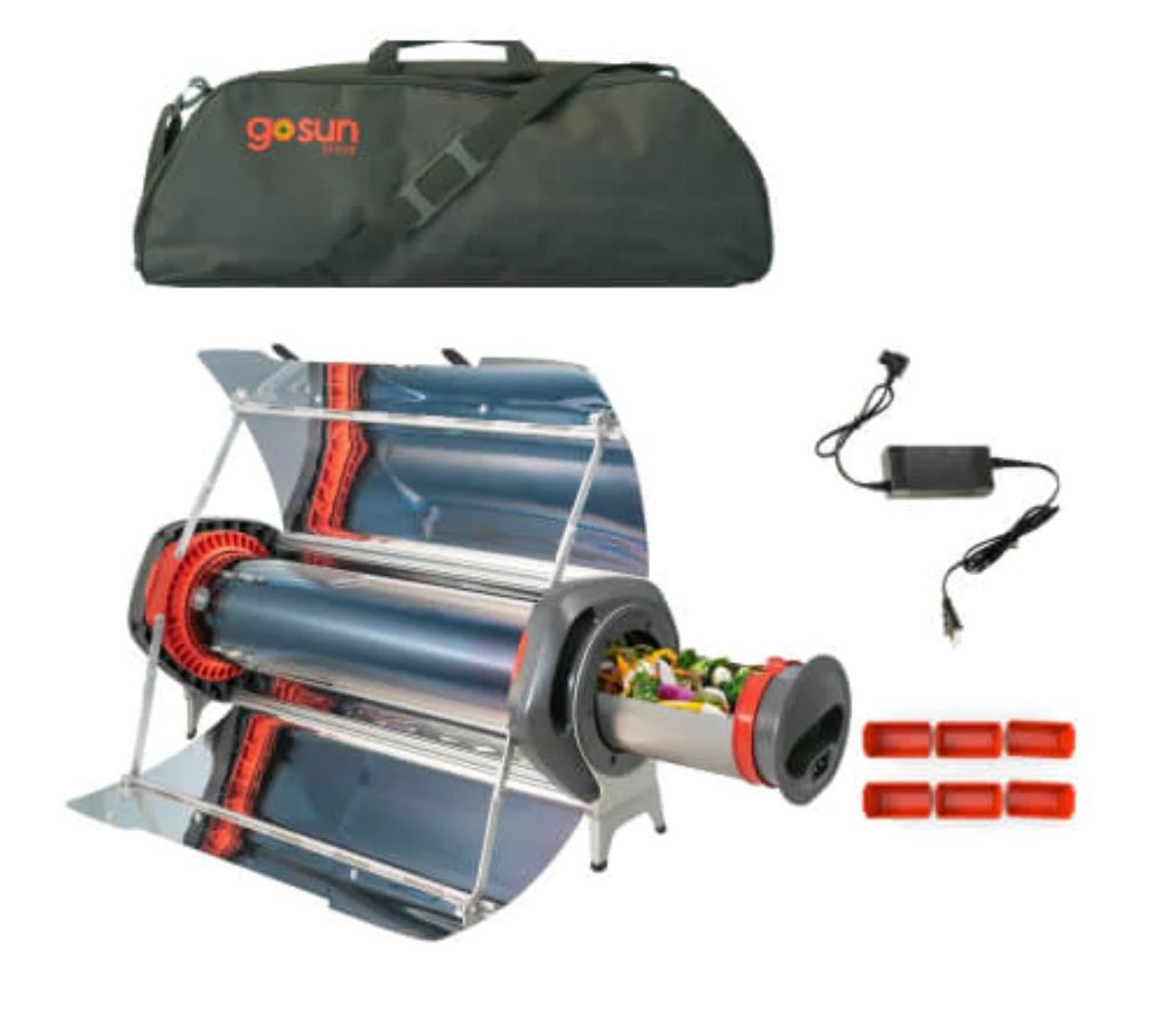 • Includes 2FS1D1P1 Fusion hybrid solar/electric oven, 101-oz powered cooking tray, power cord, solar dial, user manual, six Fusion pans, AC adapter, and Fusion carrying case