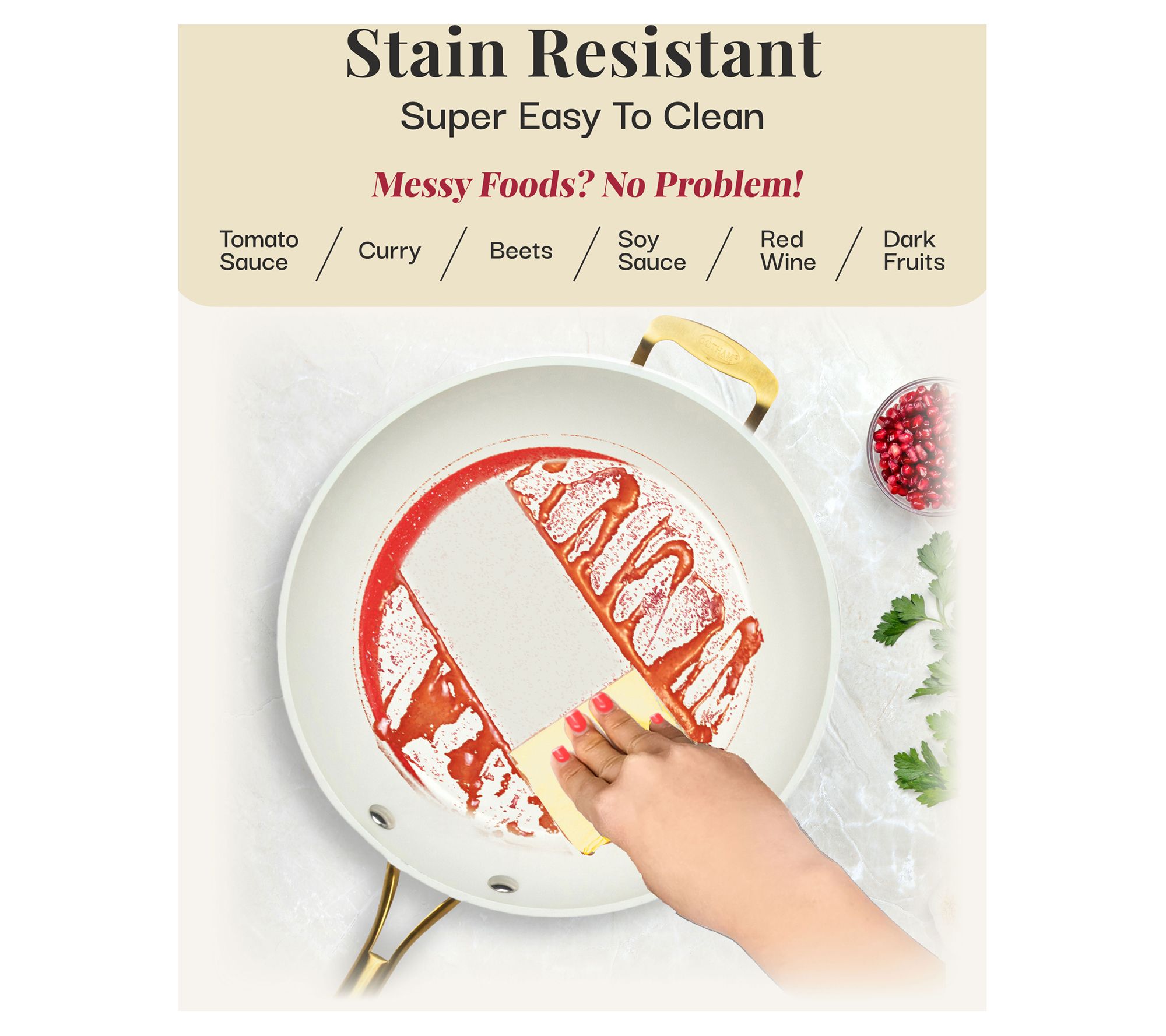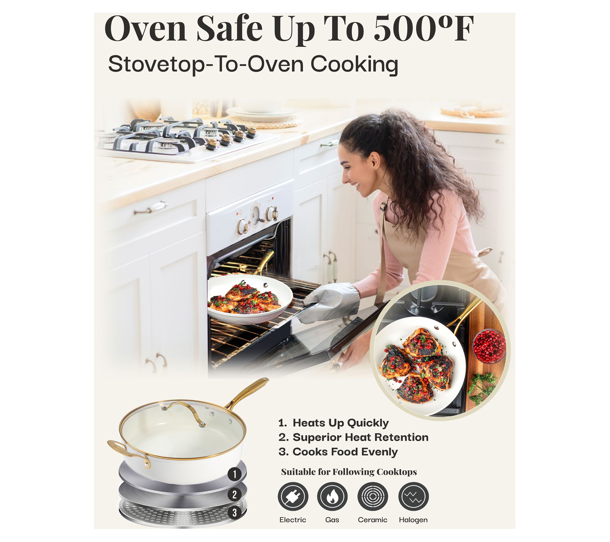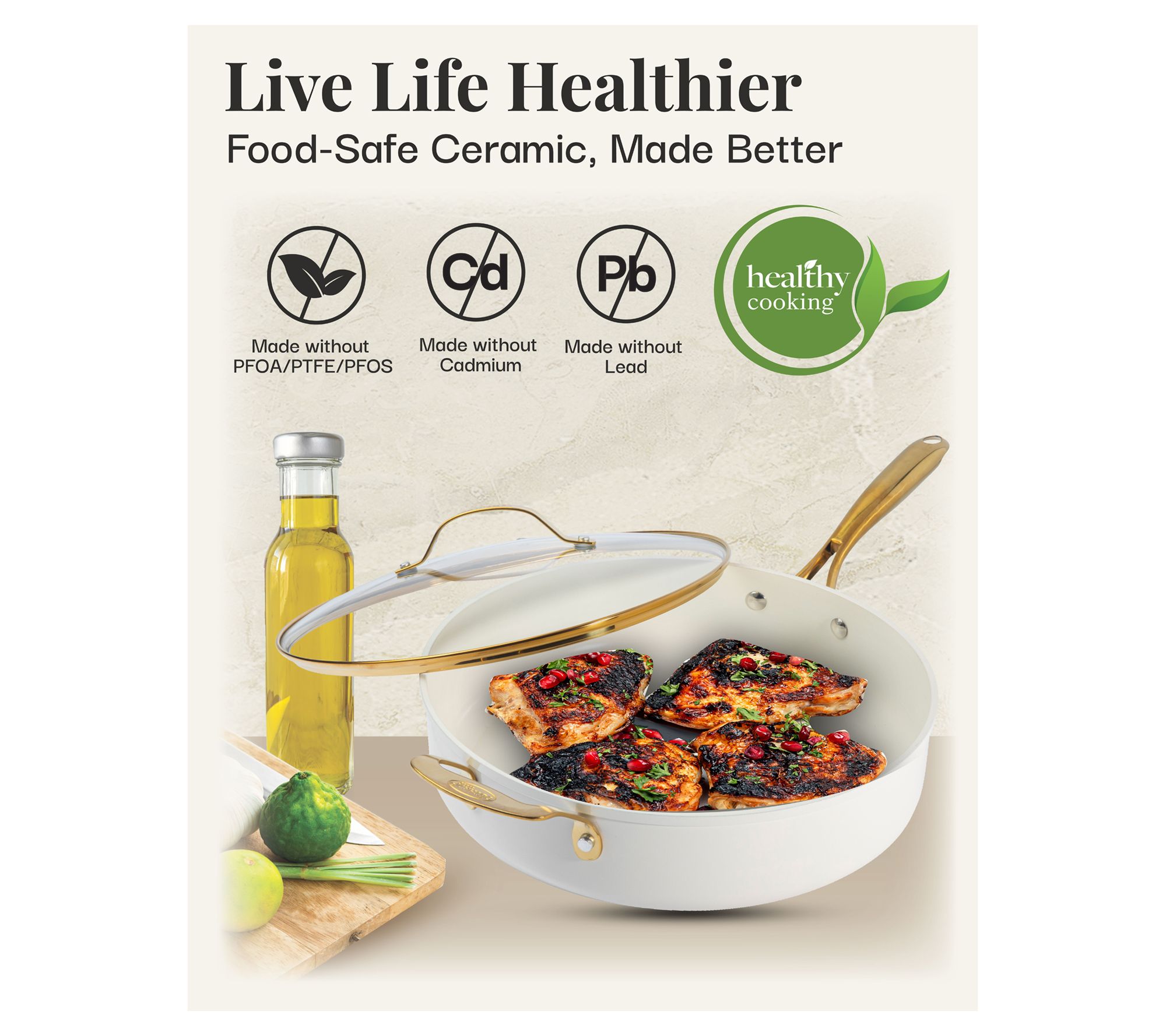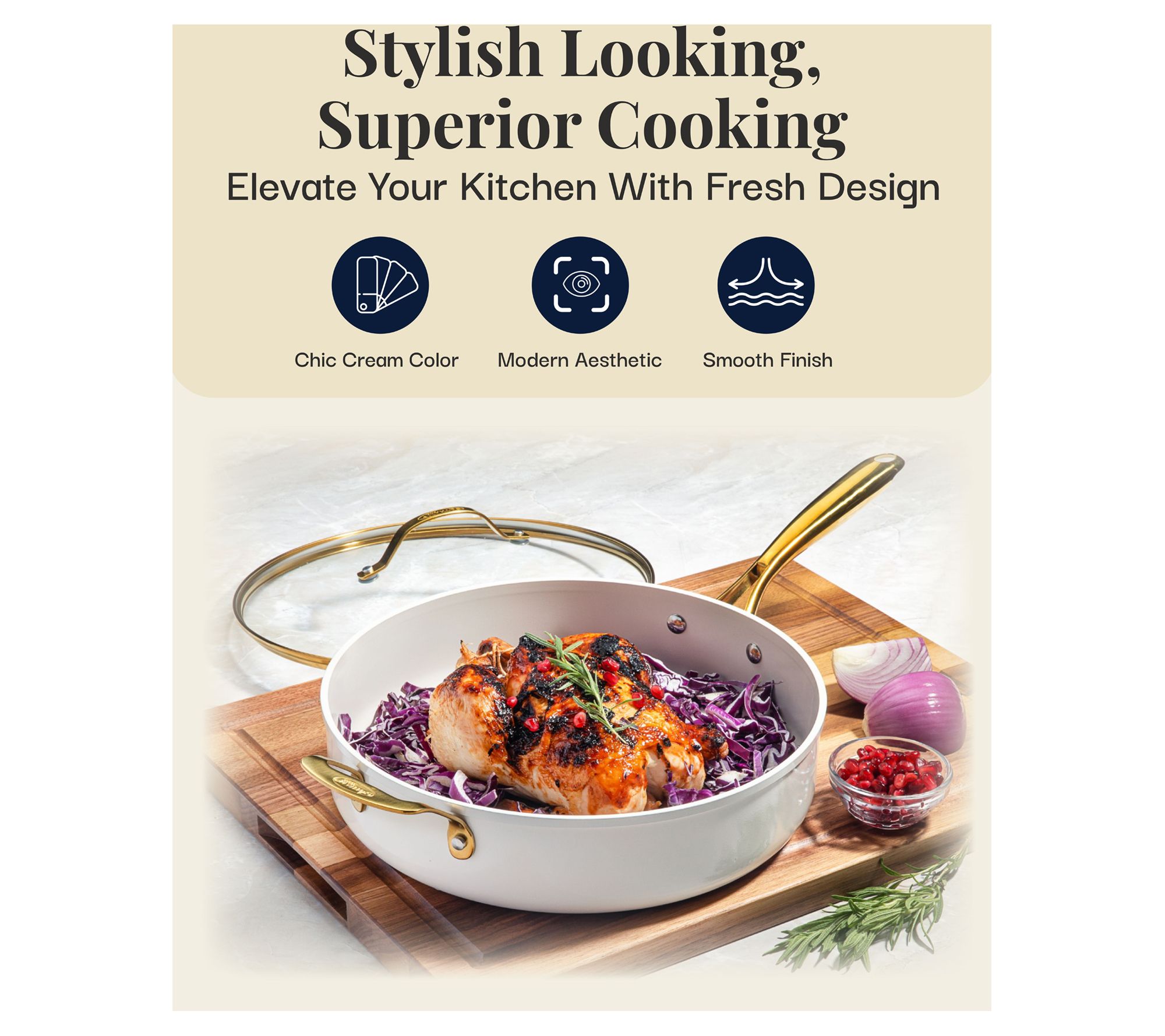 Upgrade your kitchen with the Gotham Steel Cream Nonstick 5.5-qt Jumbo Cooker Pan, perfect for cooking large meals with ease. Its ultra-nonstick ceramic interior ensures effortless food release, reducing the need for oils and butters. The elegant goldtone stay-cool handles provide style and comfort while you create delicious meals. From Gotham Steel.