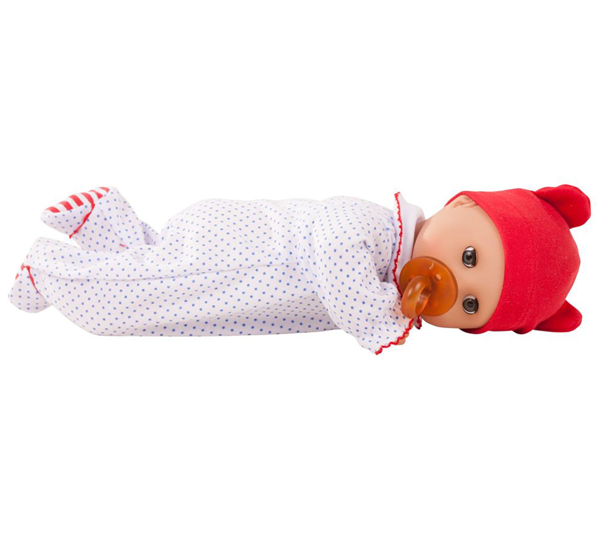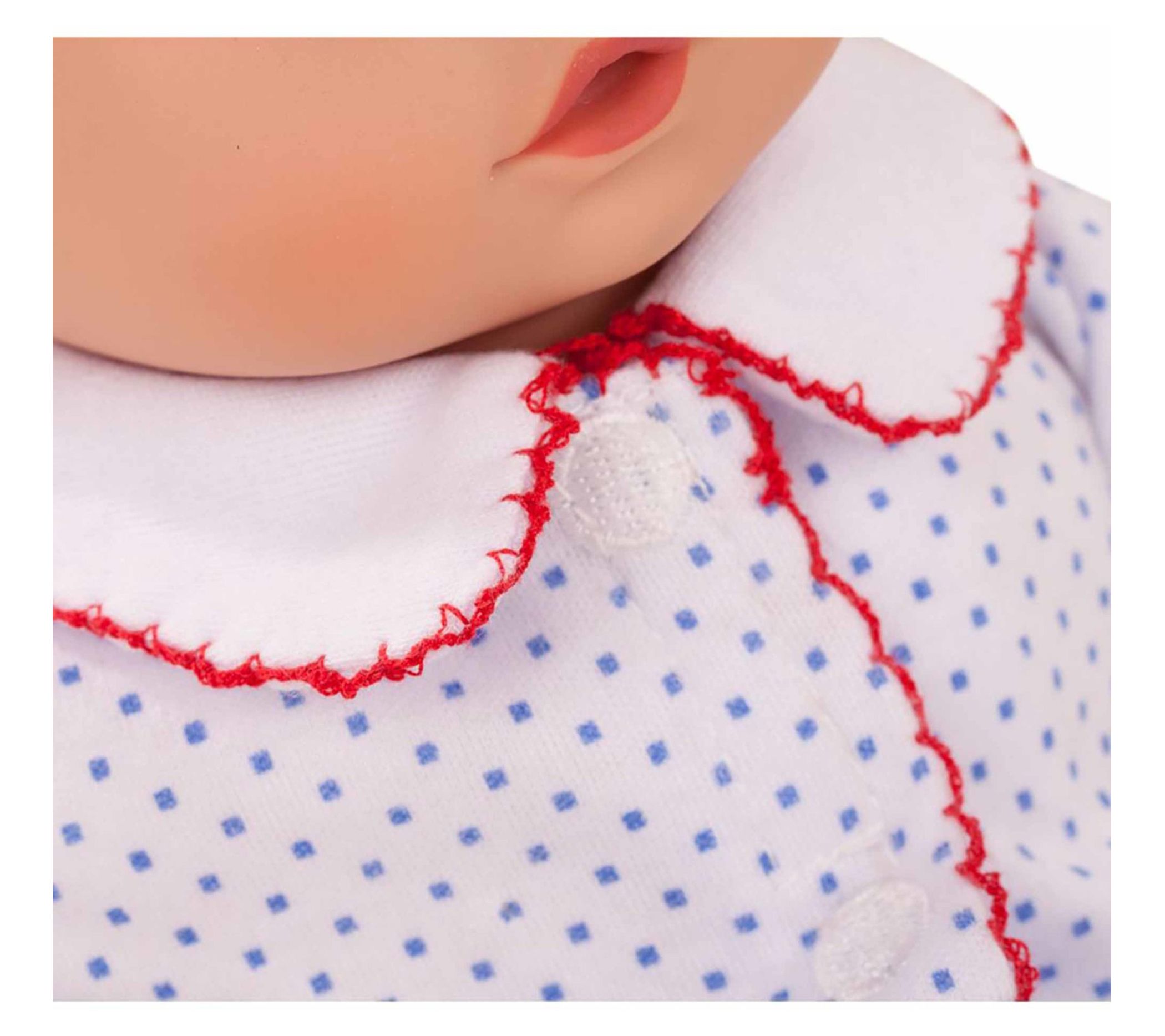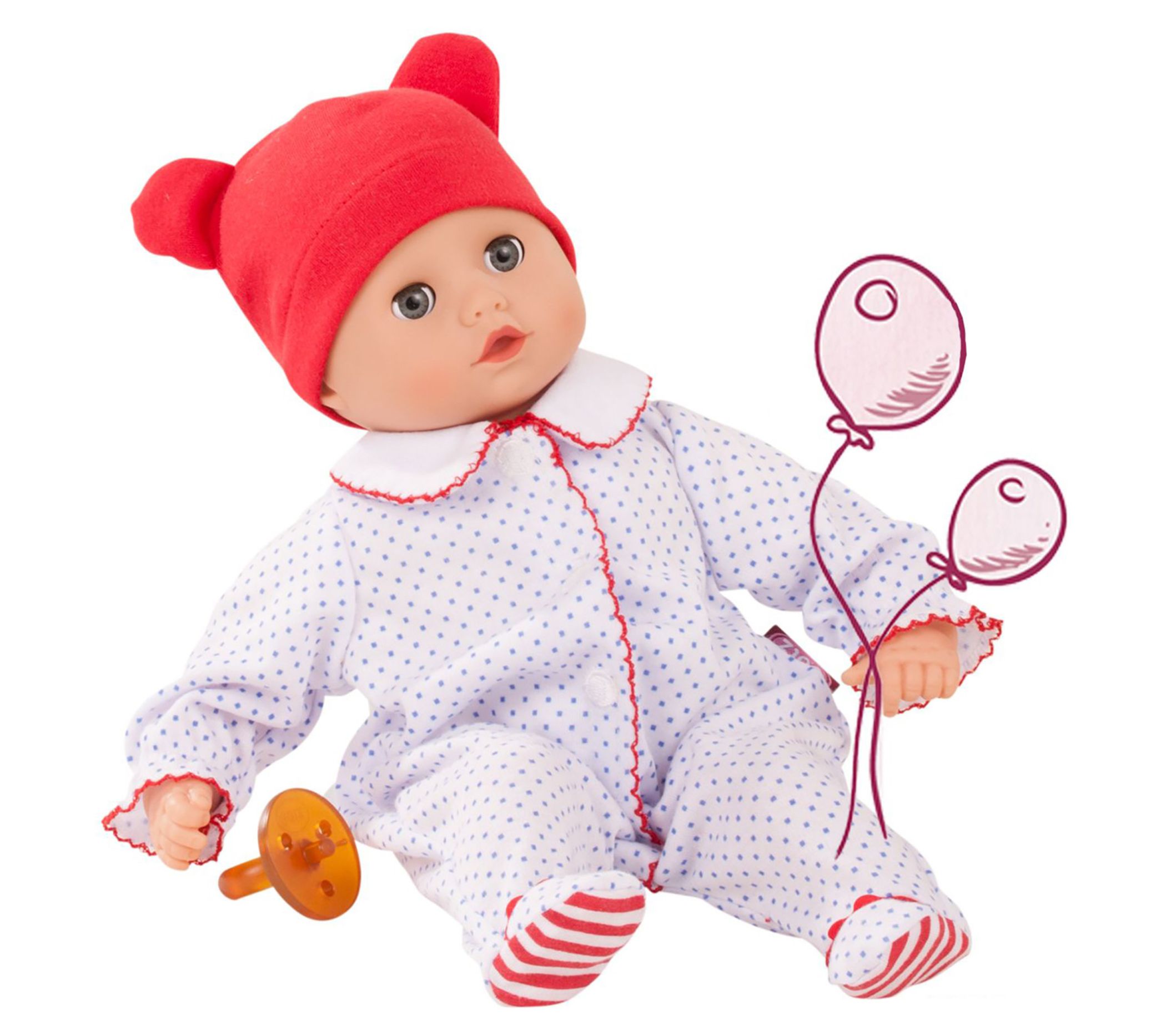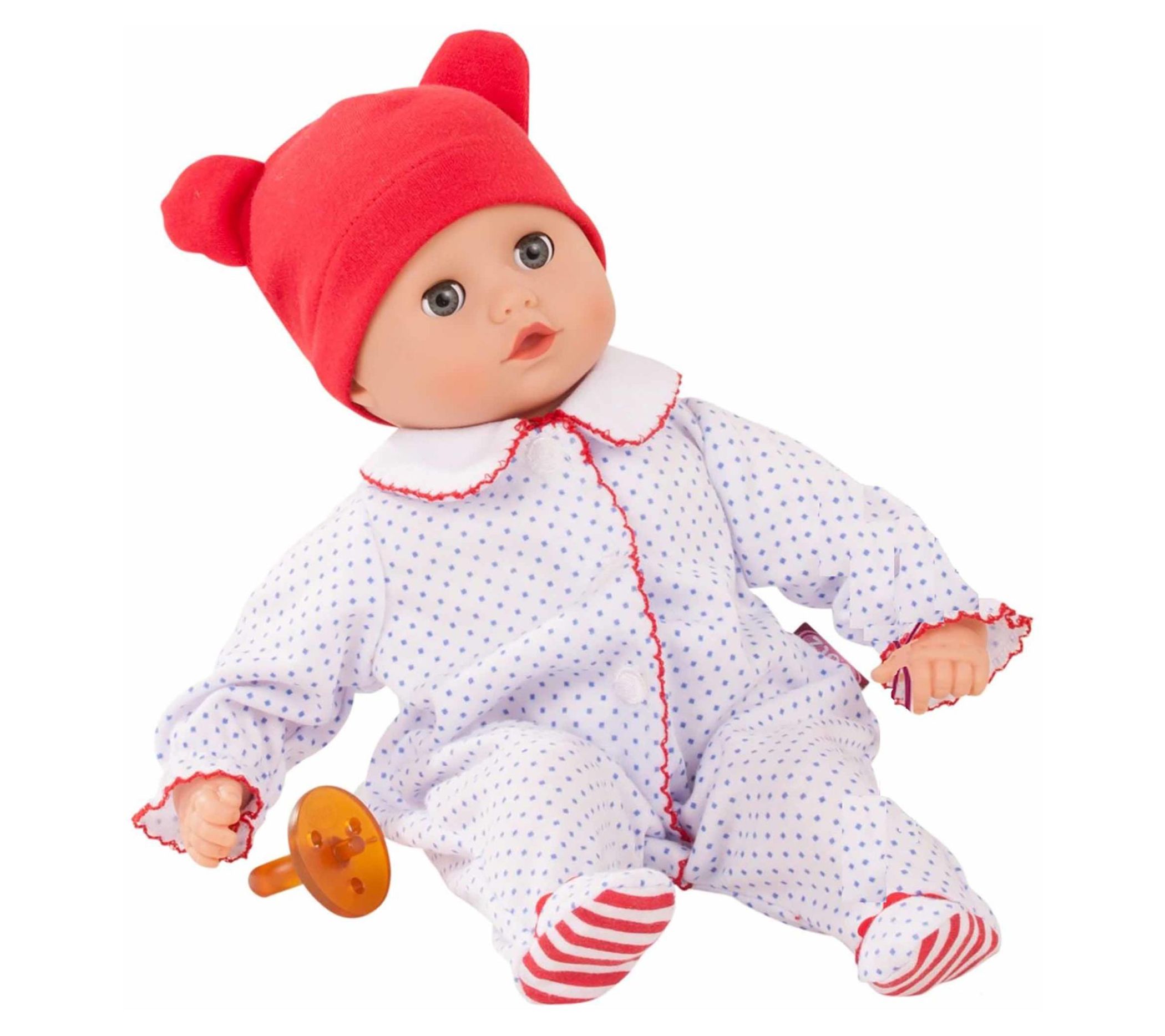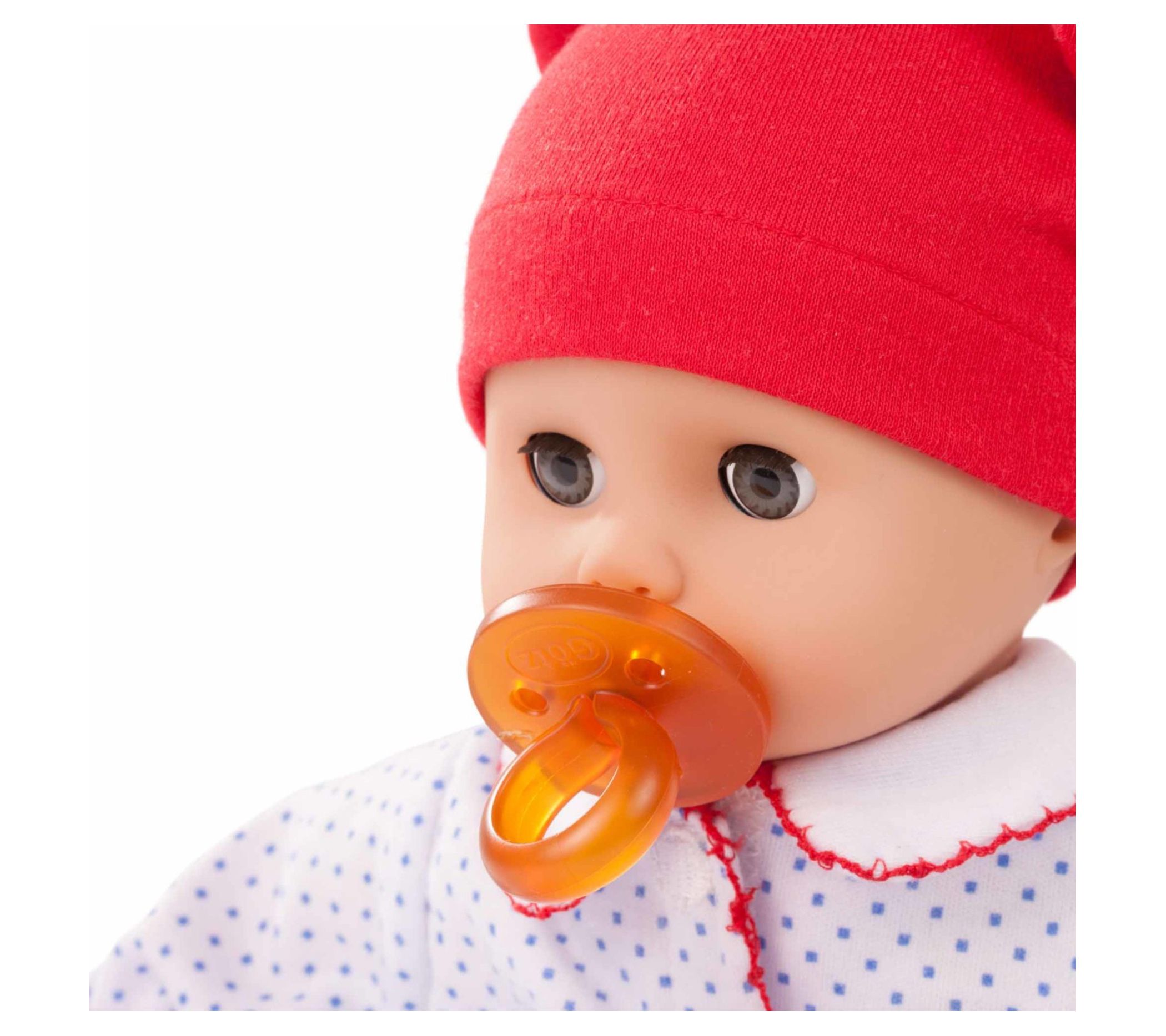 Cuddled into this adorable romper suit with dots all over, this Gotz Boy Muffin 13" doll wants to be held and cuddled. Children can easily undress him and put his clothes back on. With blue sleeping eyes and a soft, cuddly body, he's sure to become a favorite playmate. From Gotz.