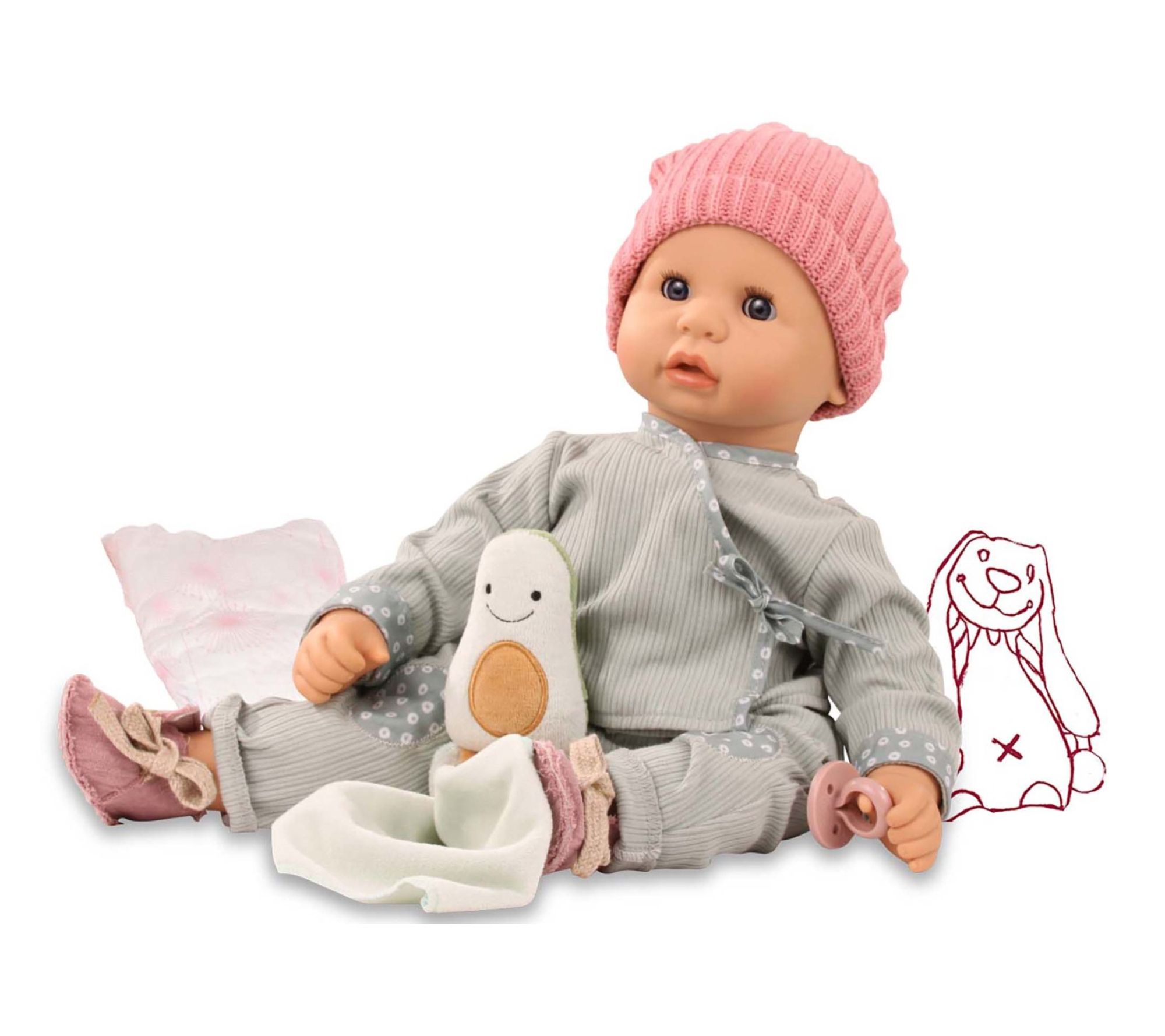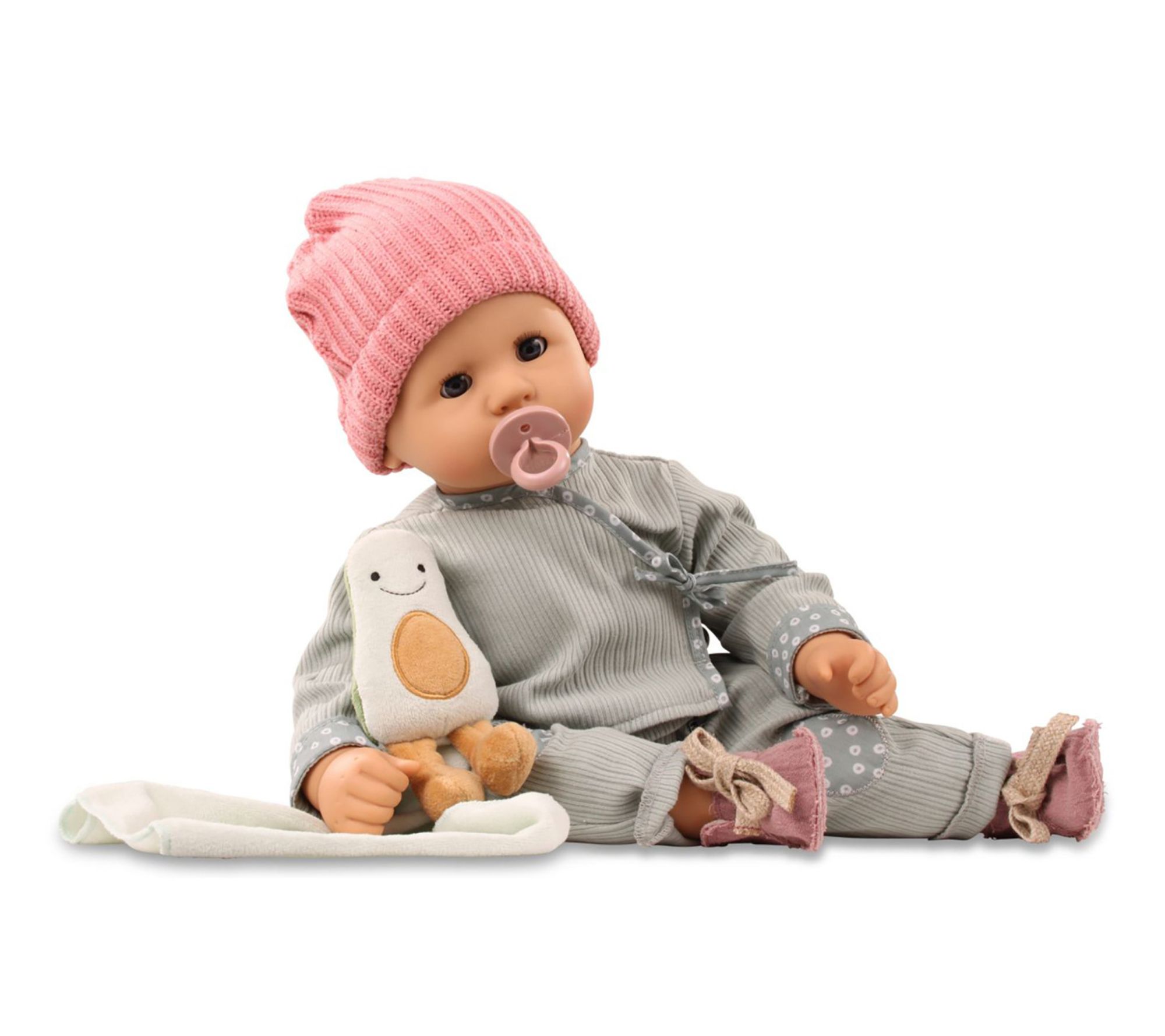 Whether it's naptime snuggles or a day at the playground, this soft doll brings comfort and joy with her adorable pastel outfit, cozy knitted hat, and beloved avocado cuddle toy. Watch as little ones nurture and care for their new playmate, creating sweet memories and imaginative adventures together. From Gotz.