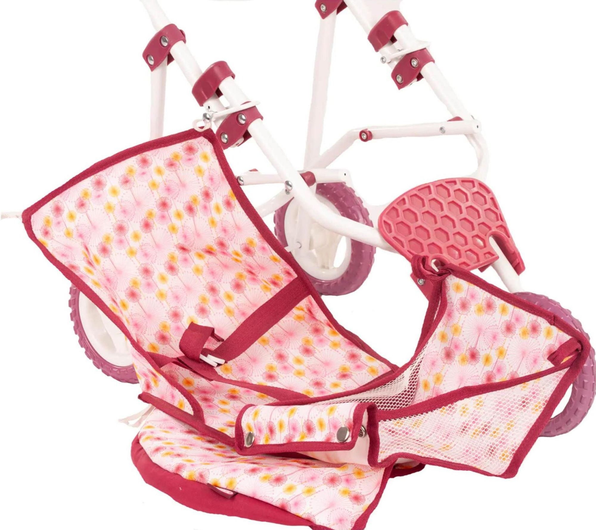 Outings become even more fun with this playful three-wheel doll buggy, featuring a charming flower motif and a net basket for taking accessories on the go. The cushioned handle and adjustable sunshade add comfort and style, while the foldable frame and washable cover make cleanup and storage easy after every adventure. From Gotz.