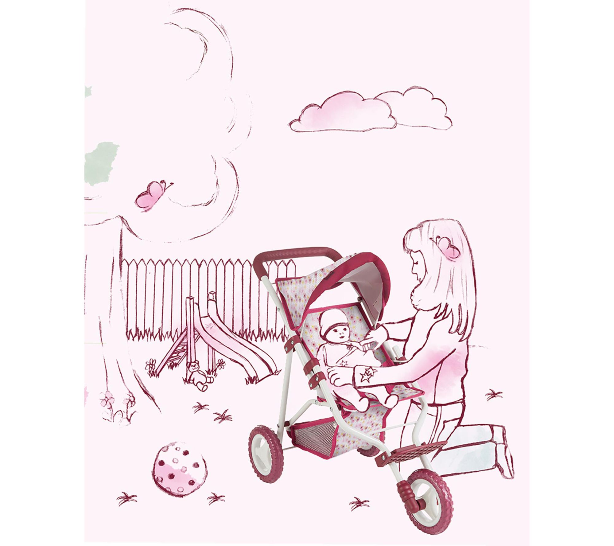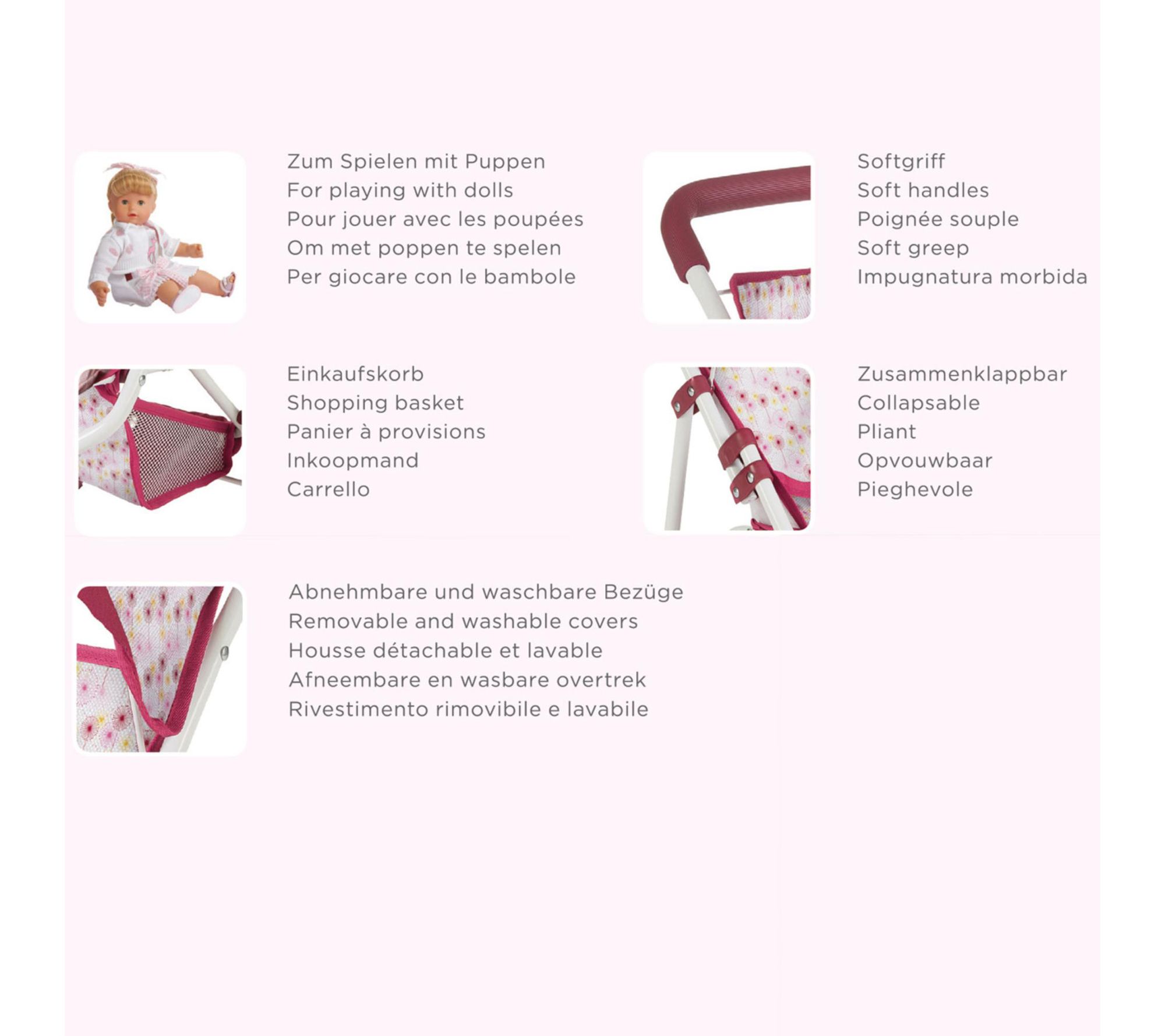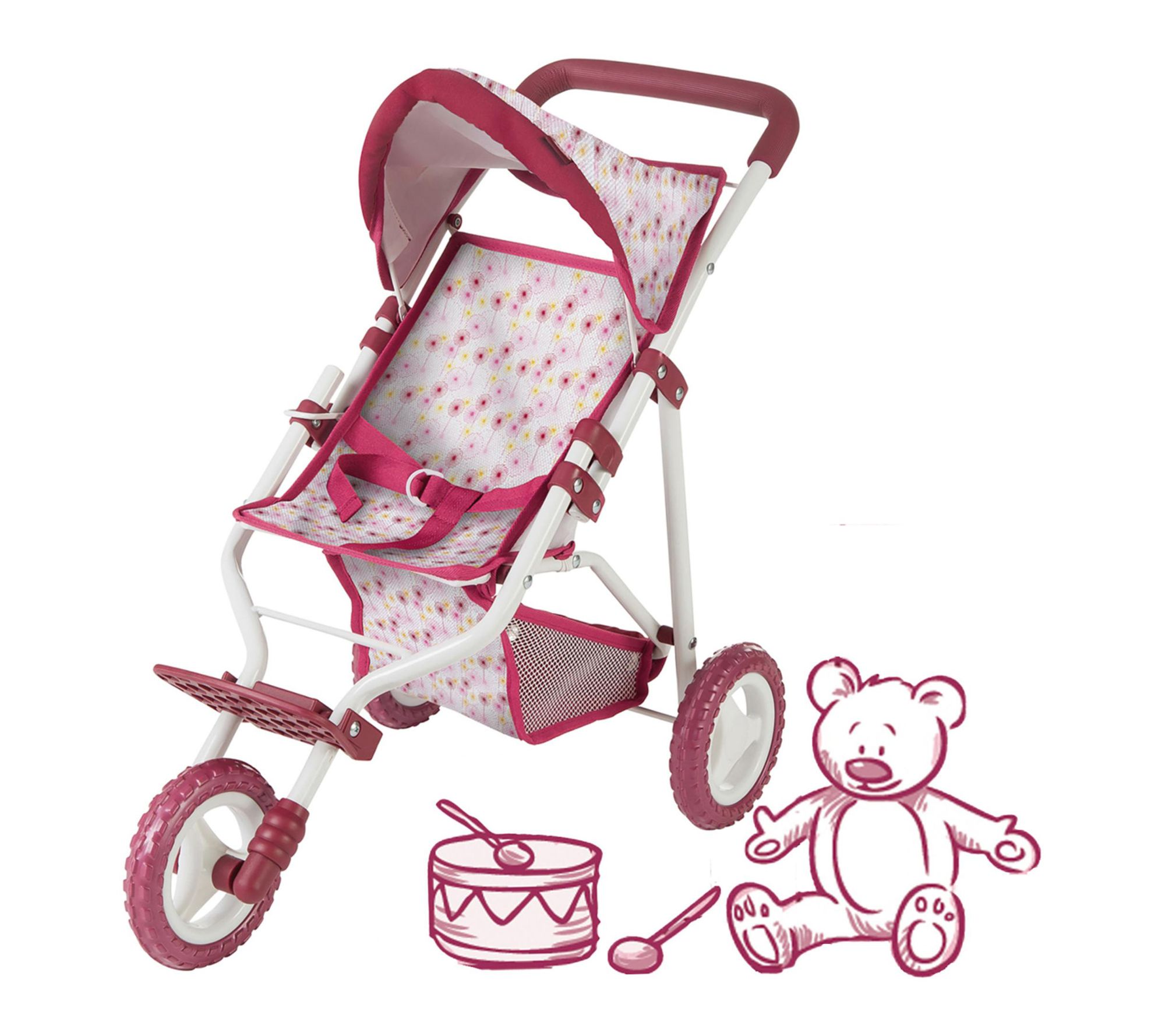 • Doll stroller with soft handle grip, adjustable hood sunshade, net storage basket, and removable machine washable cover