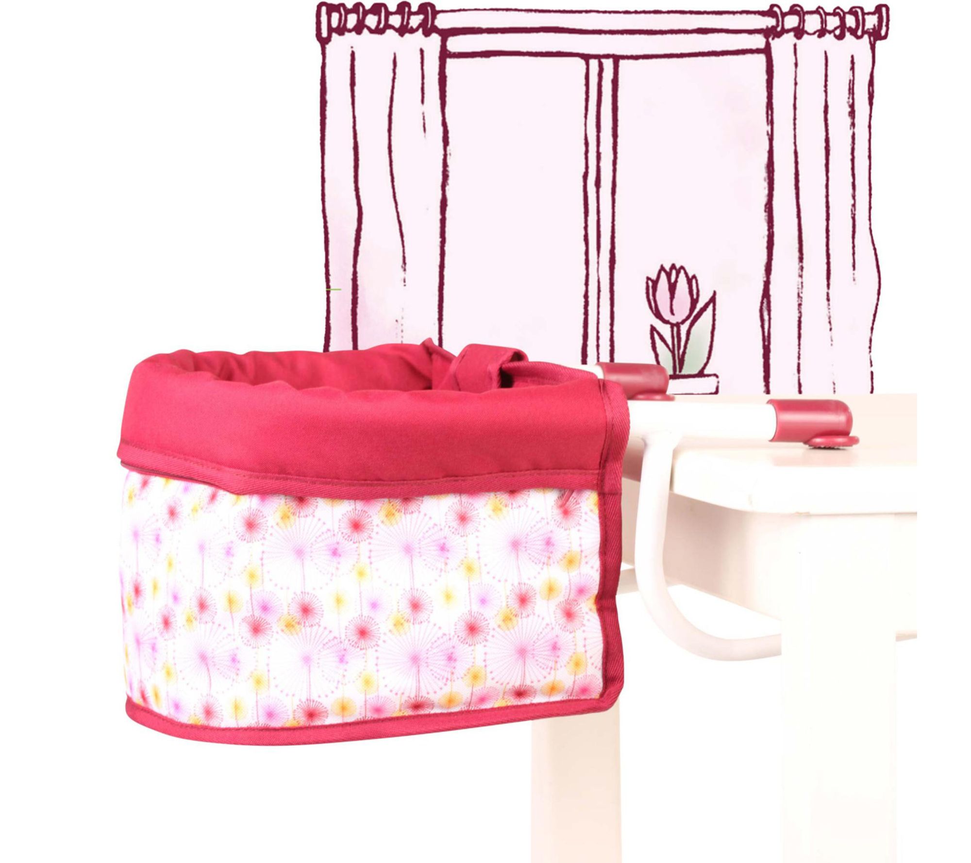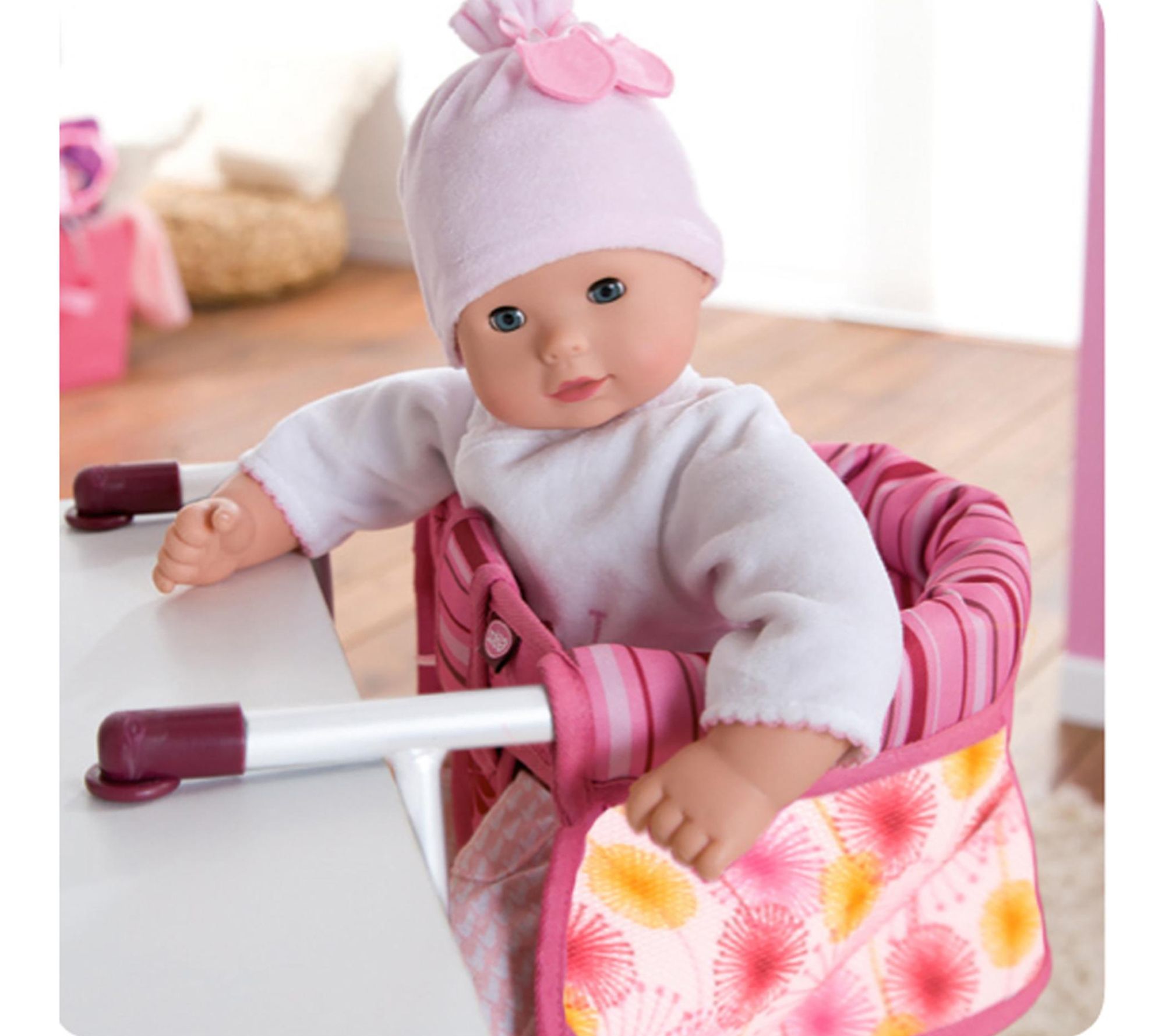Your little one's baby doll can join every family meal with this charming doll table seat, featuring a cheerful pink floral and striped design. Soft padding brings extra comfort to playtime, while the sturdy frame lets dolls up to 19 inches sit securely at the table for snack sessions, pretend picnics, or imaginative gatherings. From Gotz.