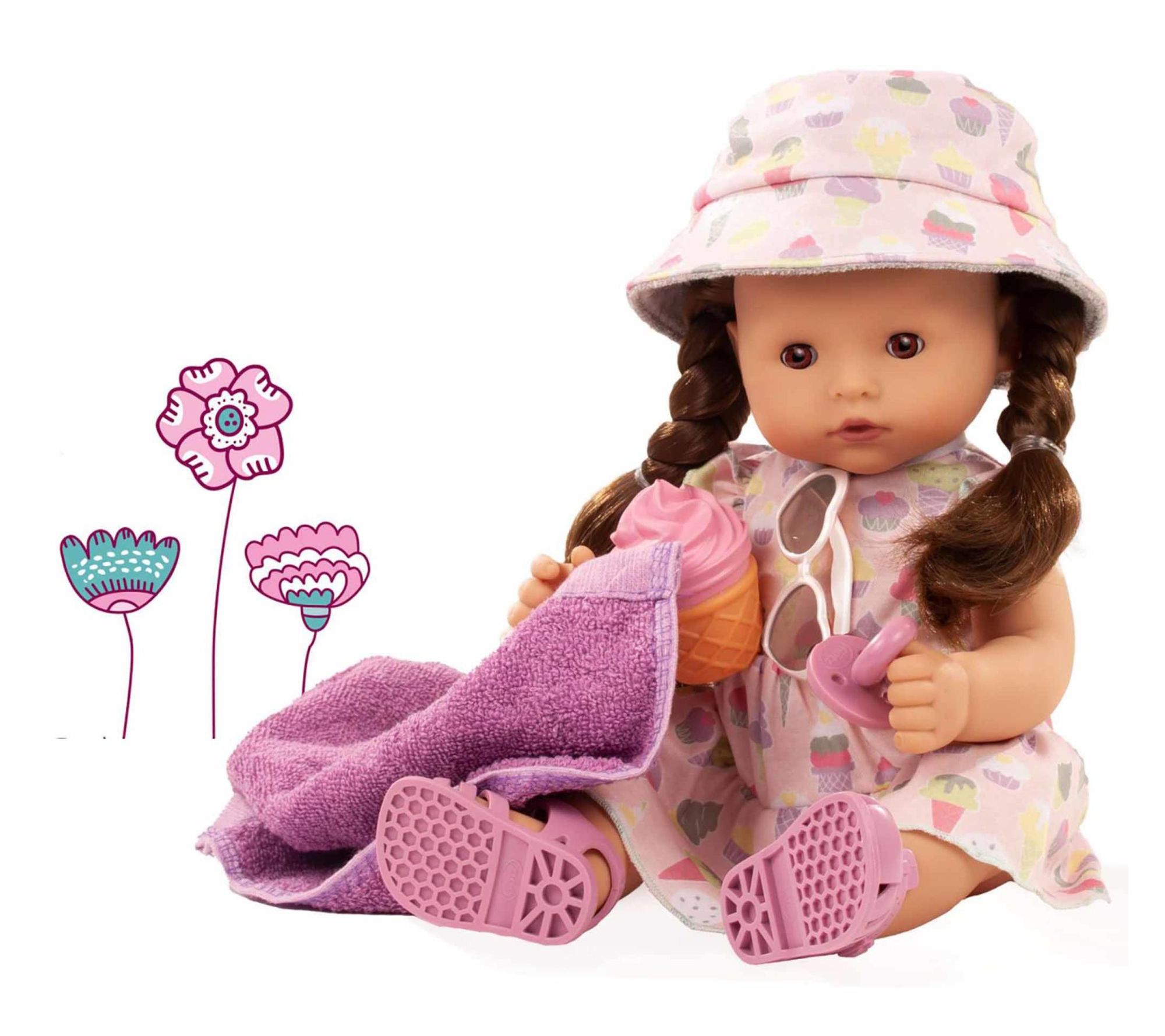 Sunny afternoons get a splash of fun with this Maxy Aquini baby doll. From bath time giggles to ice cream outings, your little one can dress her up with her chic dress, sunglasses, and hat or dry her off with her bath towel after play. Popsicle adventures begin with every hug and imaginative moment. From Gotz.