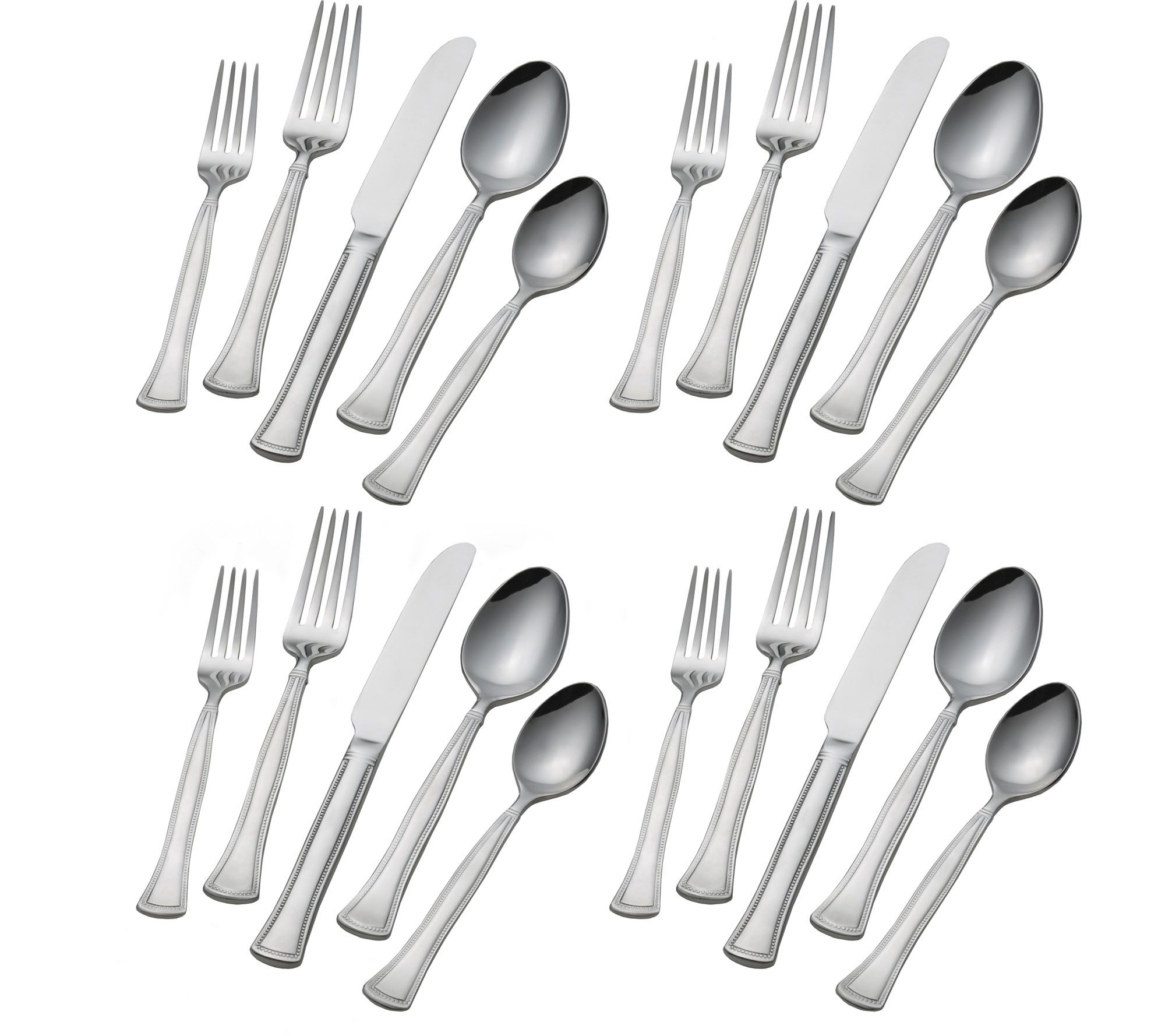 • Includes four dinner knives, four dinner forks, four teaspoons, four tablespoons, and four salad forks