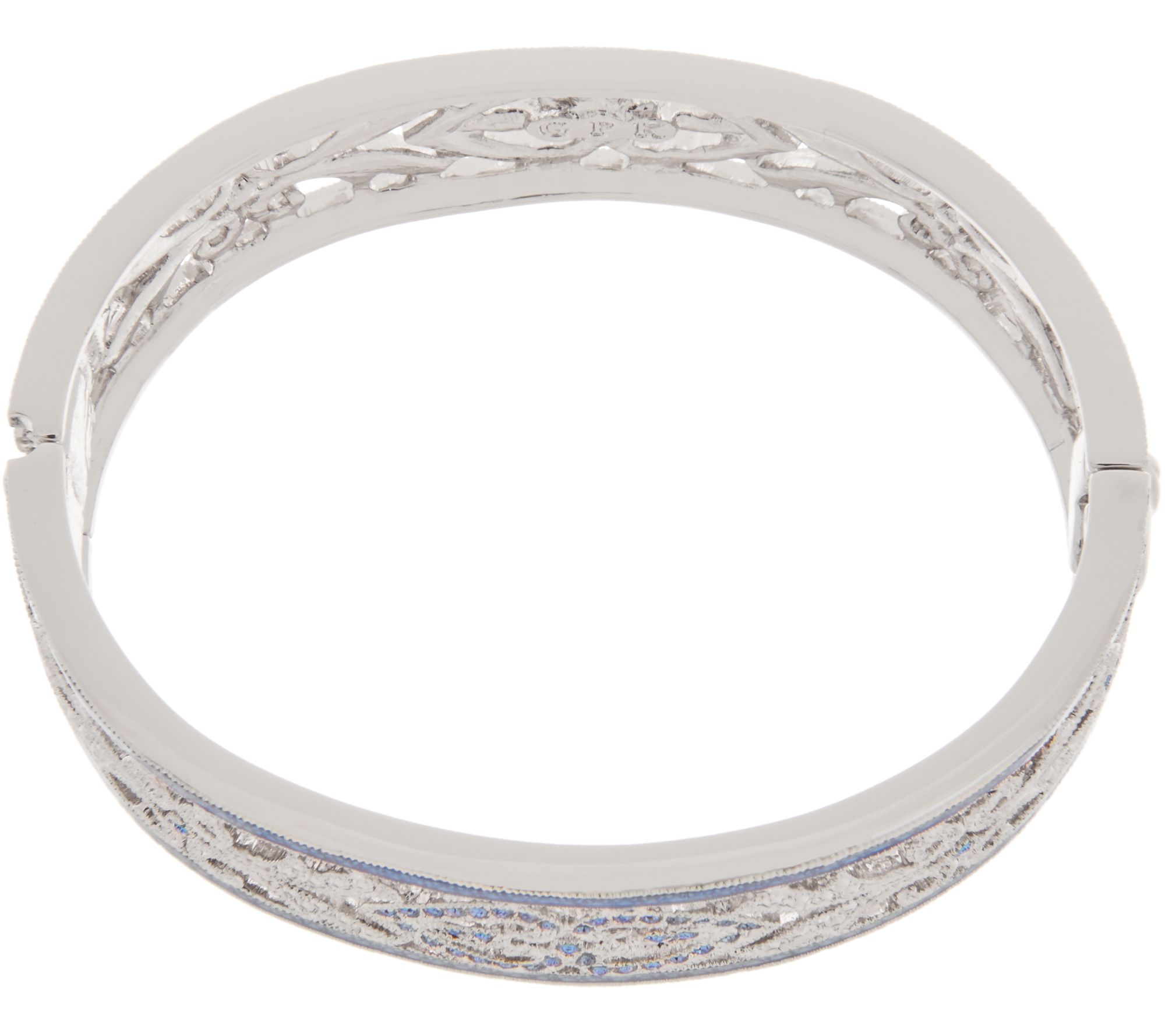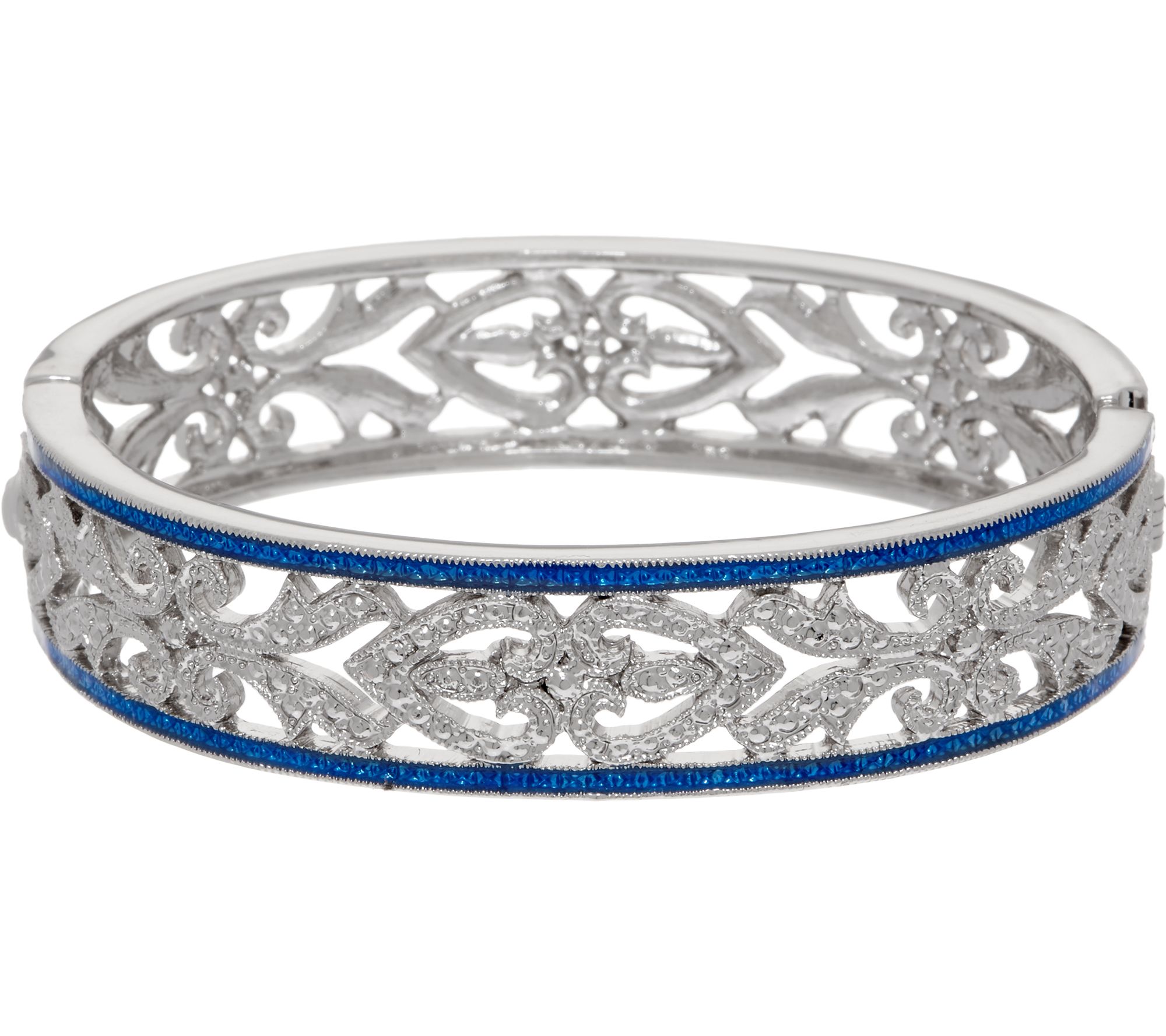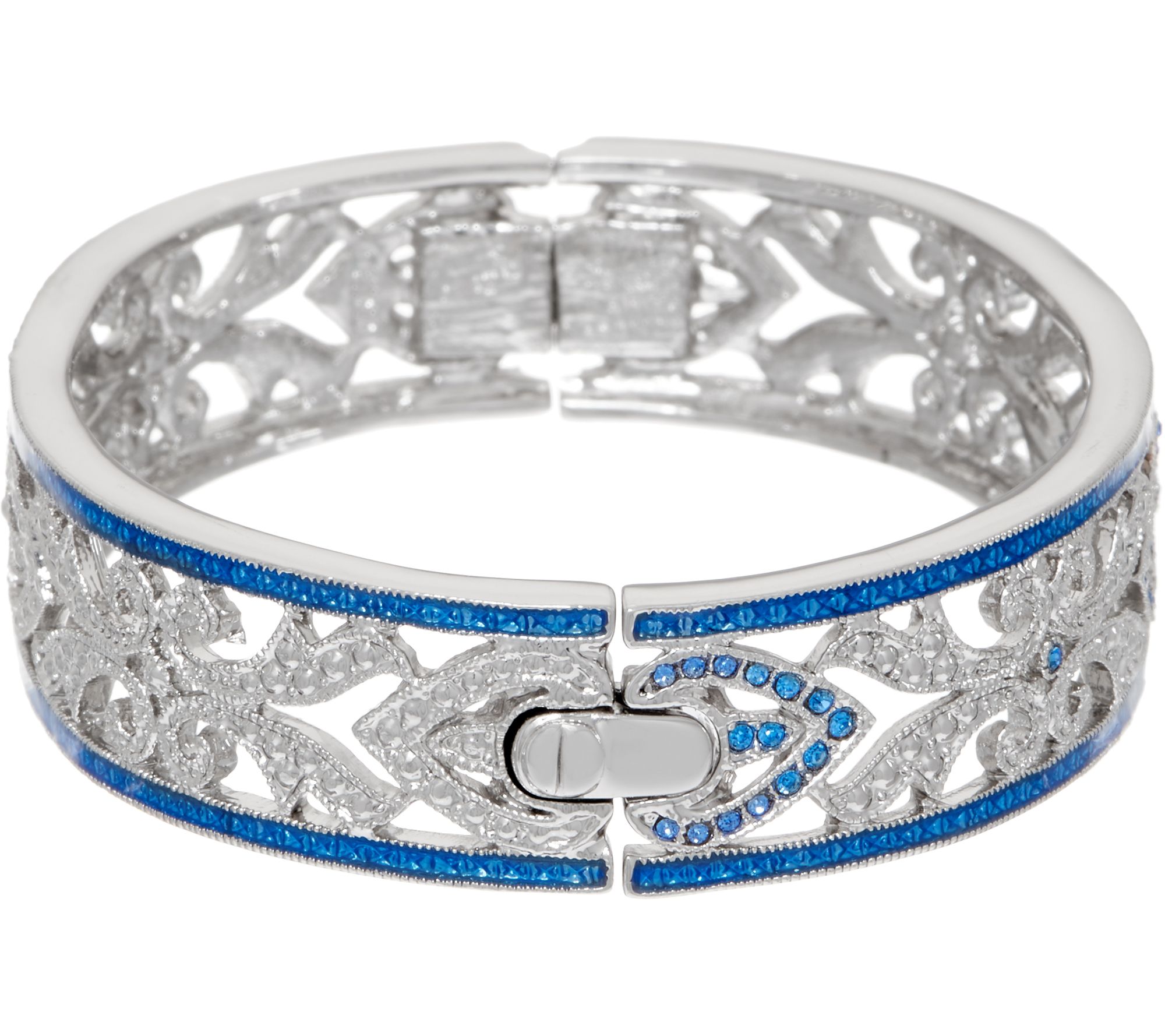 • Heart and swirl crystal designs with bead-set, blue crystals throughout hearts; blue enamel borders