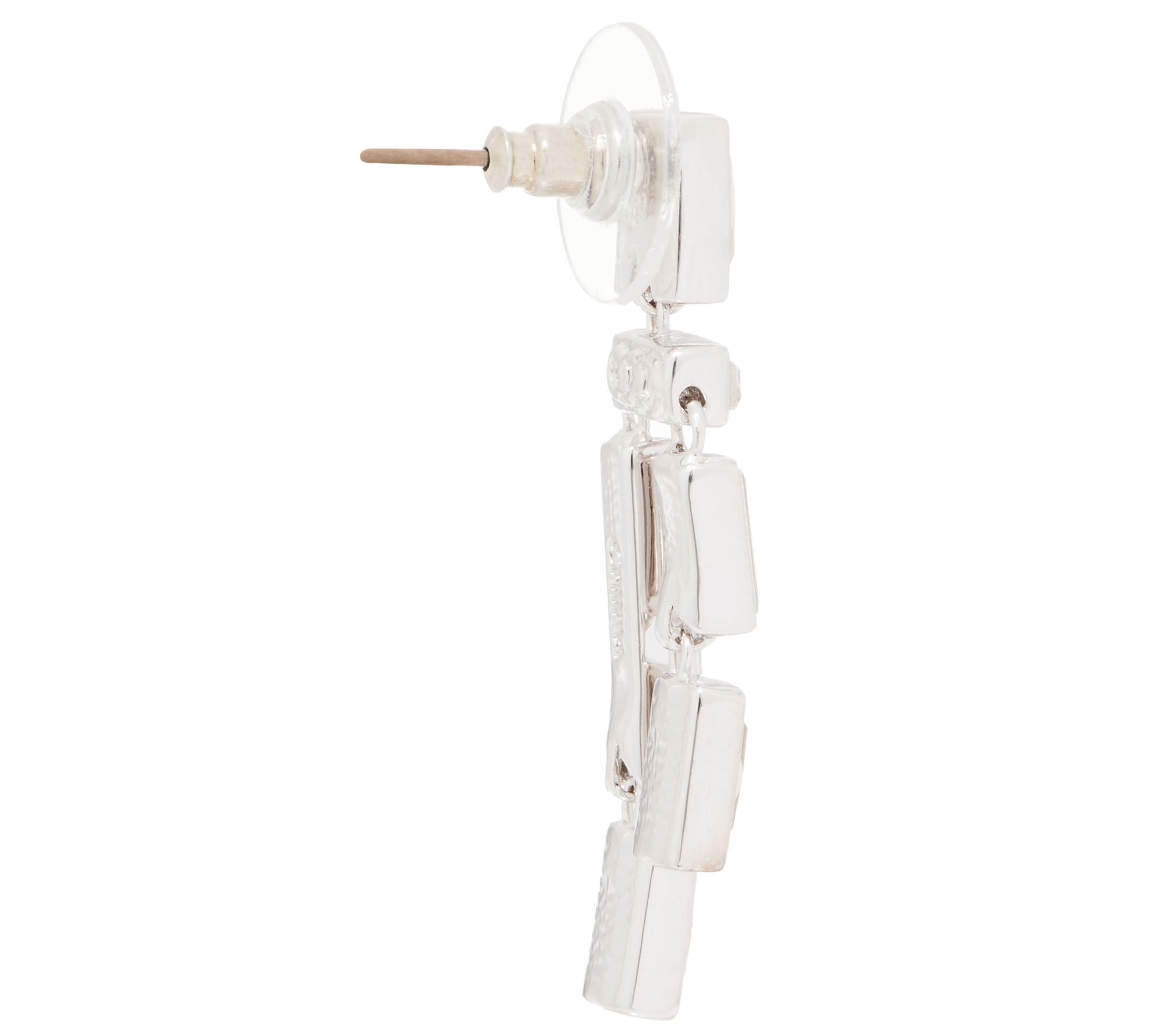 • Various bezel-set and horizontal with vertical simulated diamond baguettes that dangle below; asymmetrical left and right design