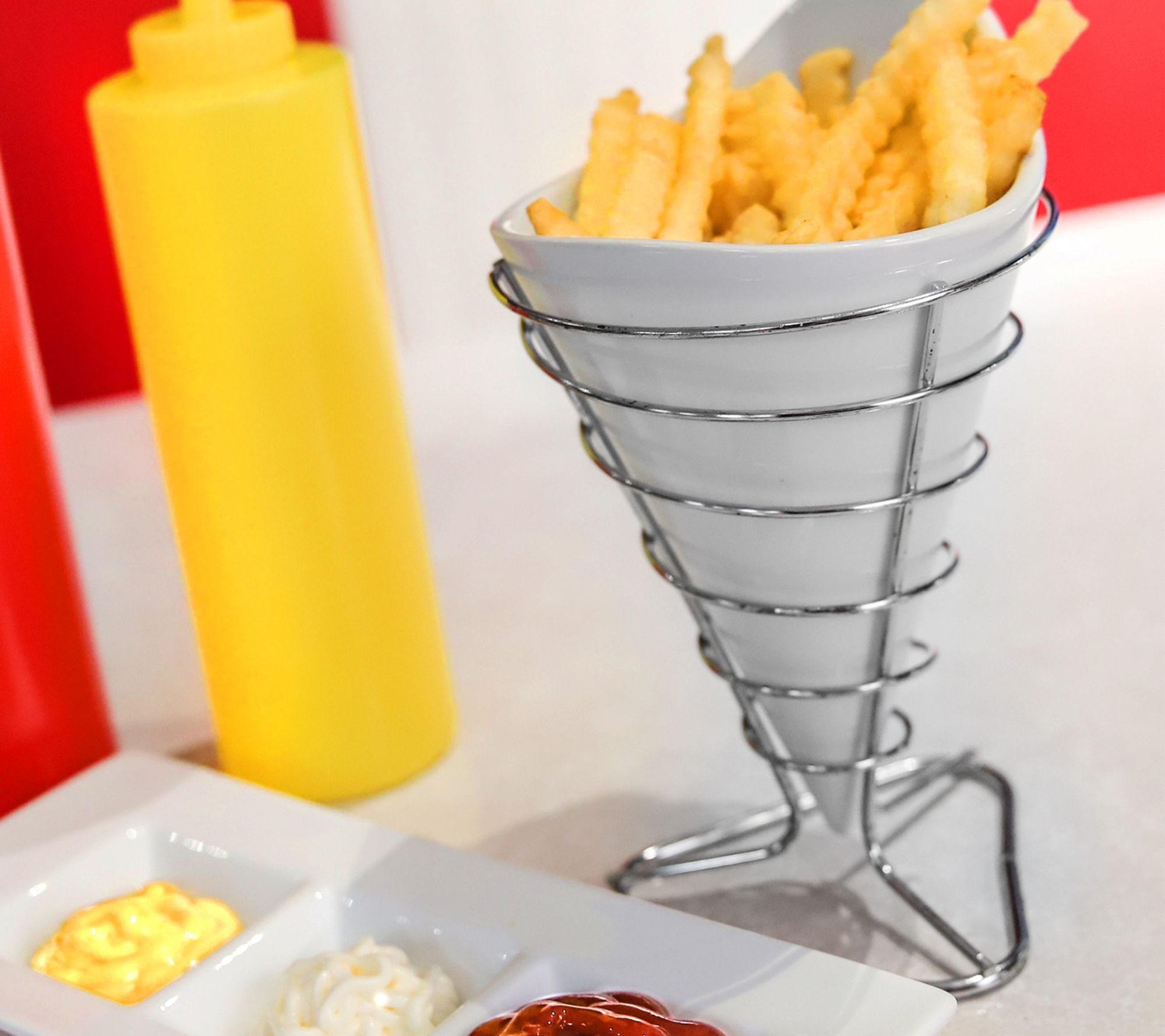 In a charming throwback to the days of French fries in a paper cone, this French fry bucket in a wire stand gives your table a stylish, fresh look. From Gracious Dining.