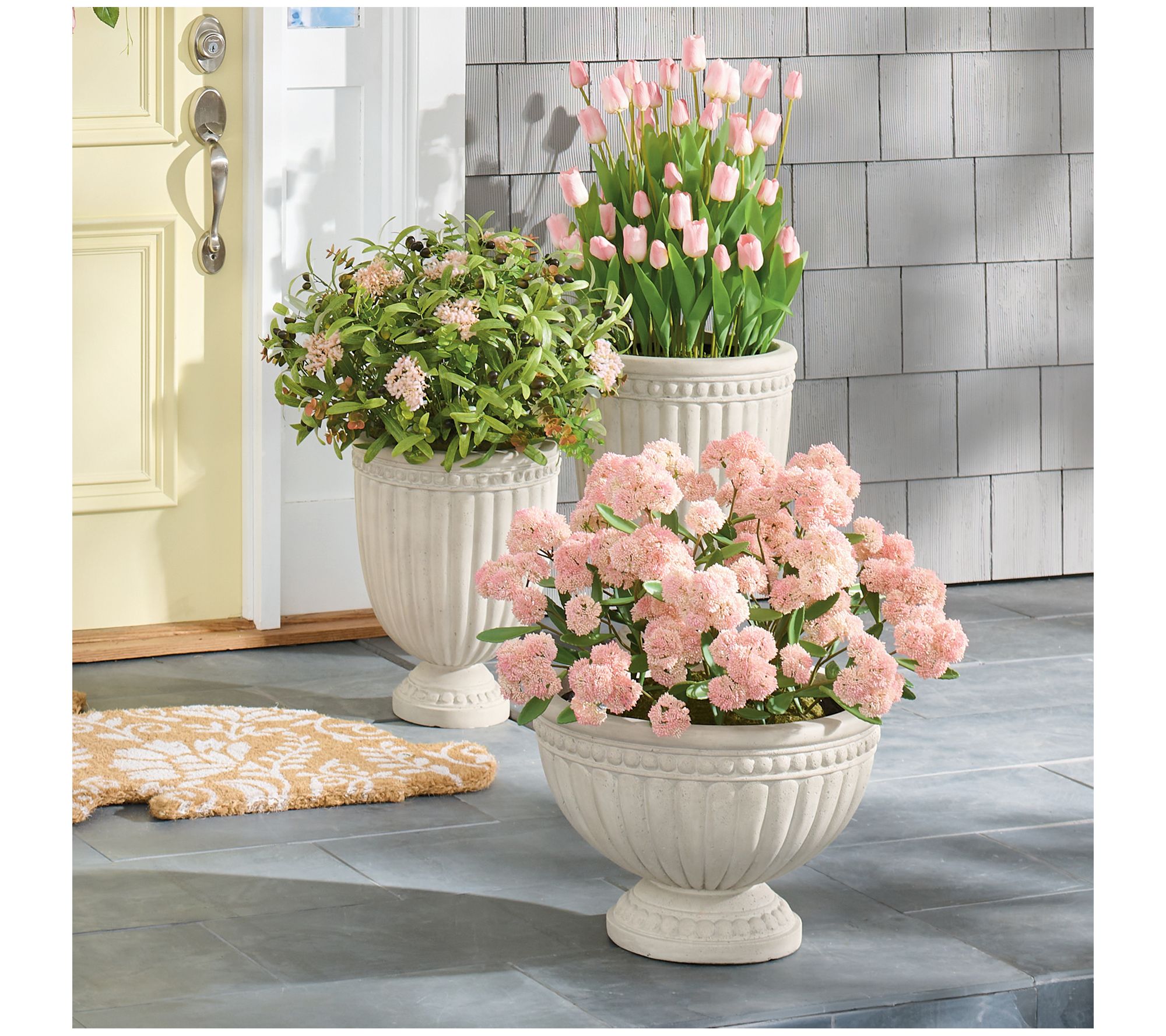 The convincing look of heavy carved stone adds vintage appeal to this Grandin Road Reese pedestal planter -- but its lightweight composite construction makes it easy to relocate. Enjoy mixing urn fillers or plants of different heights and dimensions in your green space with this versatile piece. From Grandin Road.