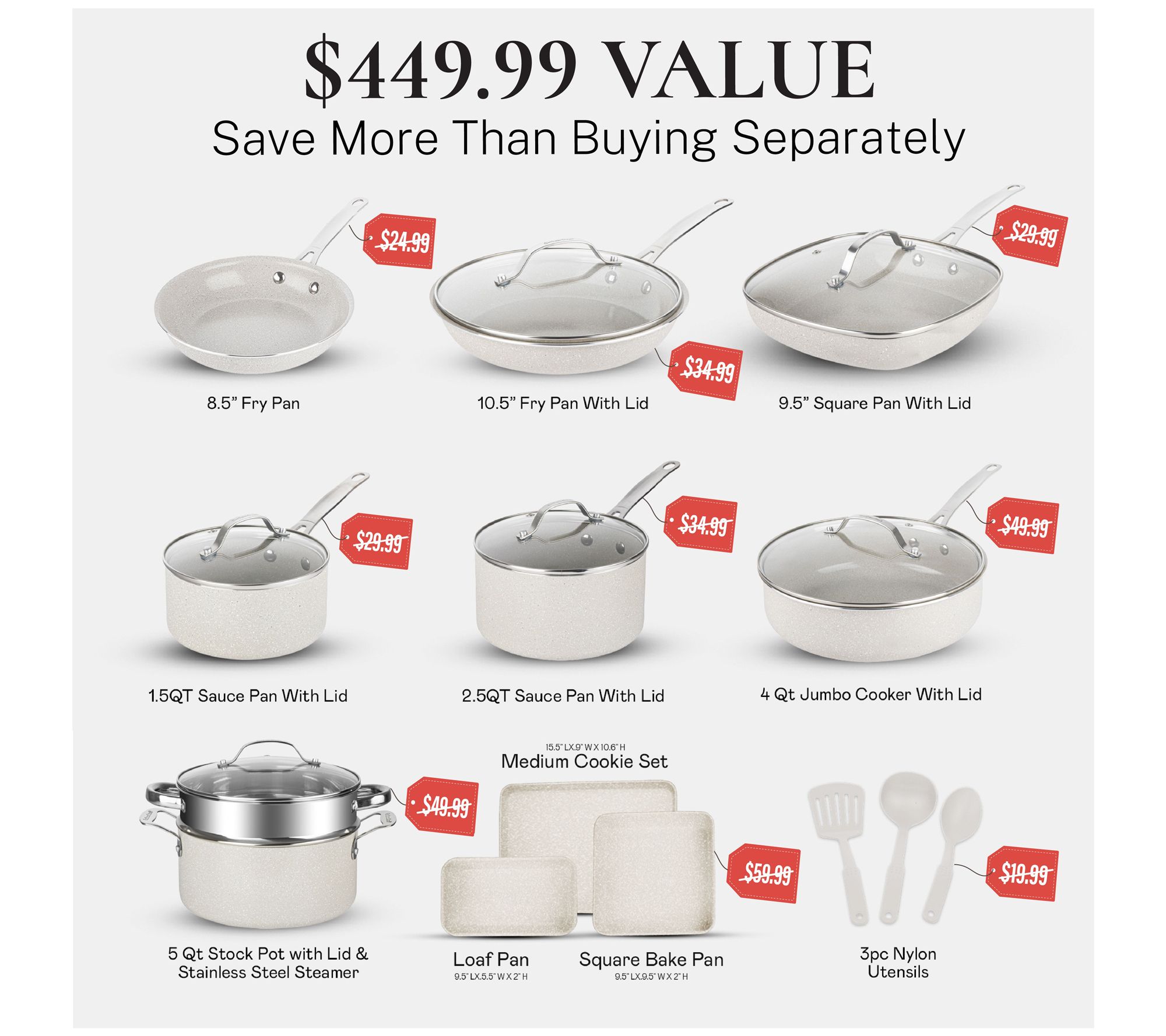 • Includes 8.5" frying pan, 10.5" frying pan with lid, 9.5" square frying pan with lid, 1.5 quart saucepan with lid, 2.5 quart saucepan with lid, 5 quart stock pot with lid and stainless steel steamer, 4 quart jumbo cooker with lid, cookie sheet/jelly roll pan, loaf pan, square pan, and three cooking utensils