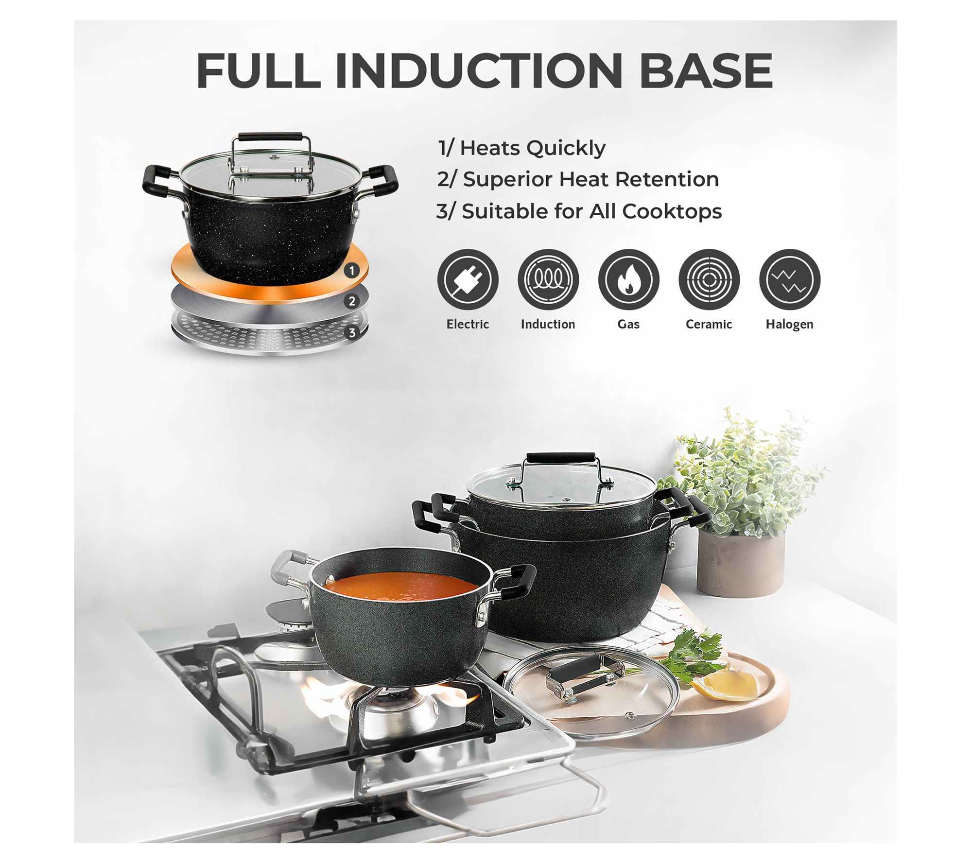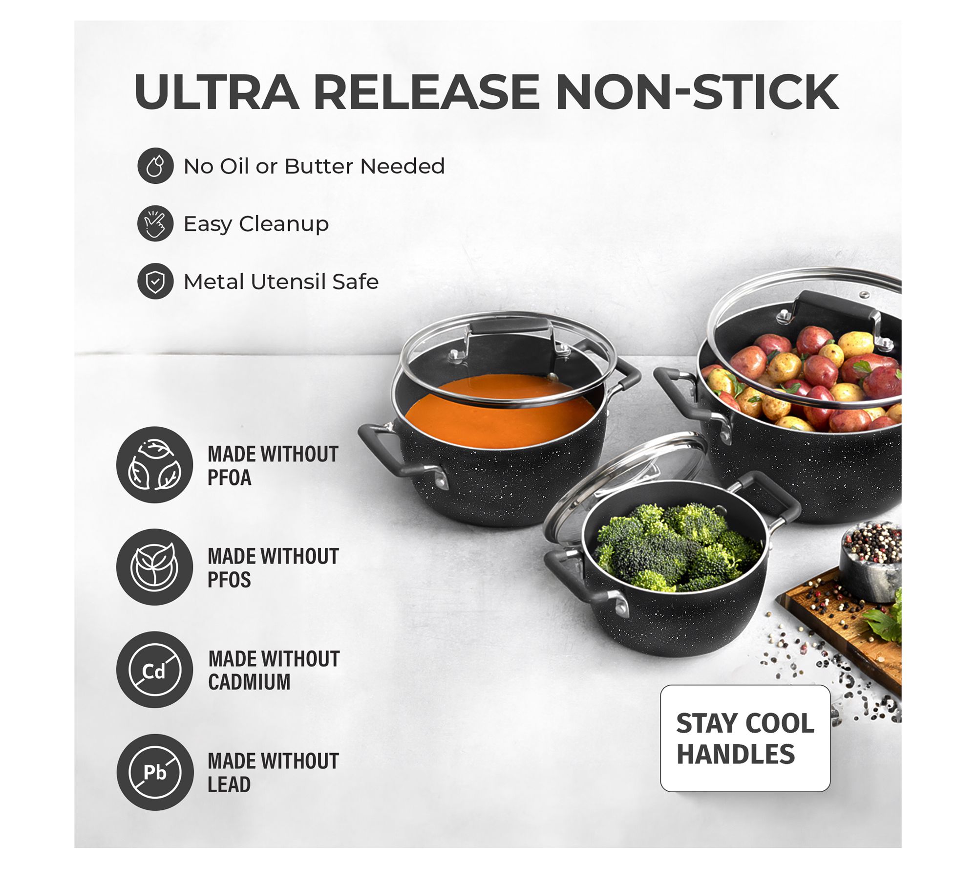 • Includes 1.5-qt stockpot with lid, 3.5-qt stockpot with lid, and 5-qt stockpot with lid