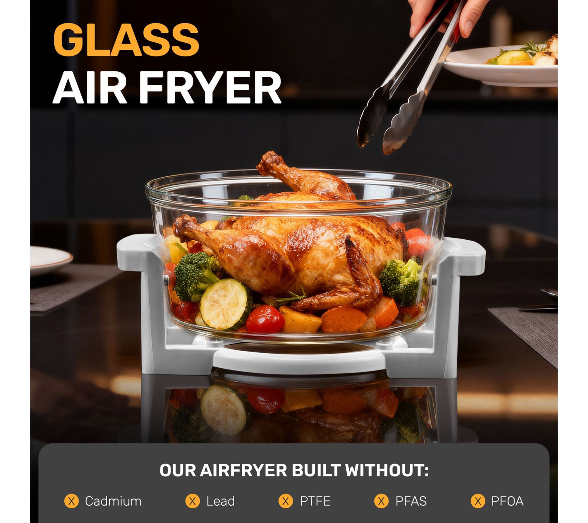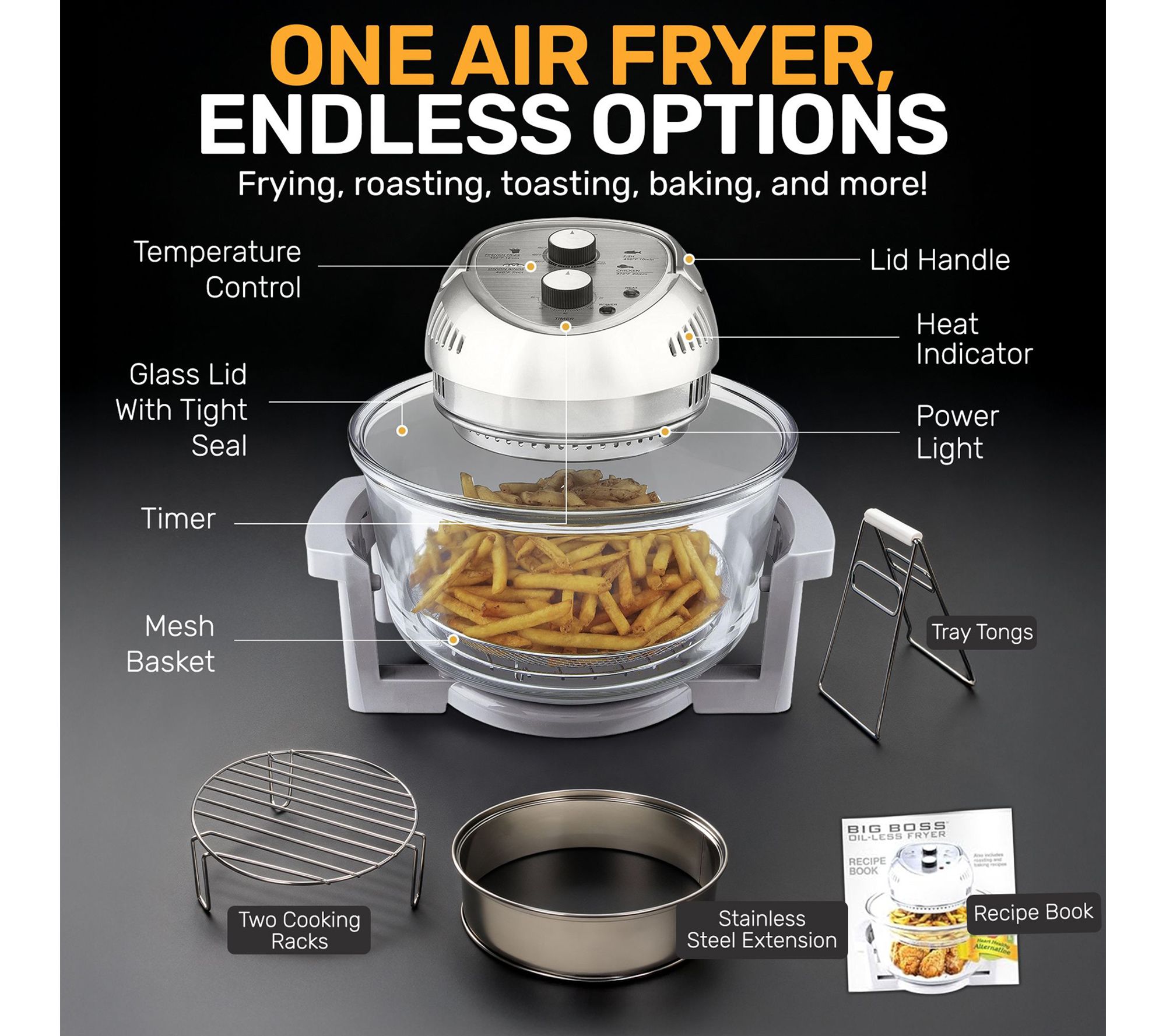 • Includes 16-qt air fryer oven, glass lid, stainless steel extension ring, mesh basket, high cooking rack, low cooking rack, glass bowl, tongs, and sturdy base with handles