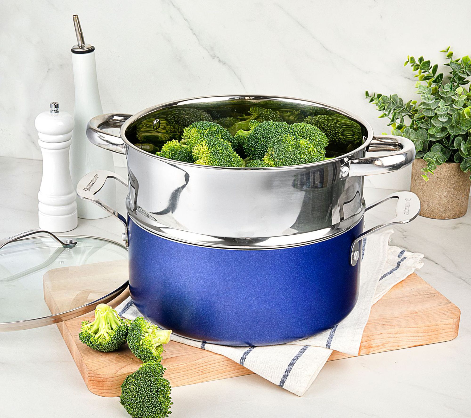 • Includes 8.5" fry pan, 10" fry pan with glass lid, 1.5-qt saucepan with glass lid, 2.5-qt saucepan with glass lid, 5-qt stock pot with glass lid, and stainless steel steamer insert