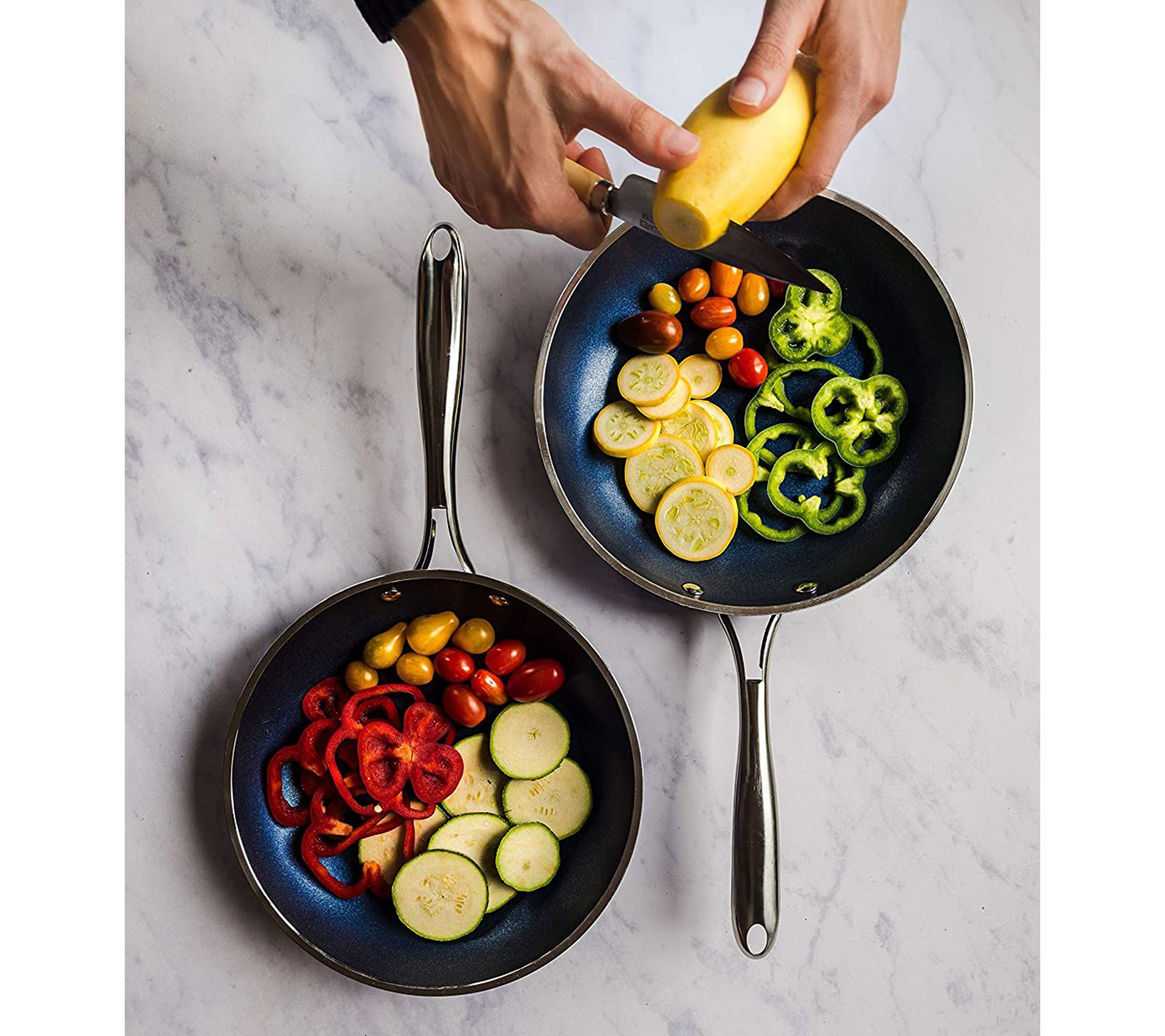 • Includes 8.5" round skillet, 10.25" frying pan with lid, 2-qt pot with lid