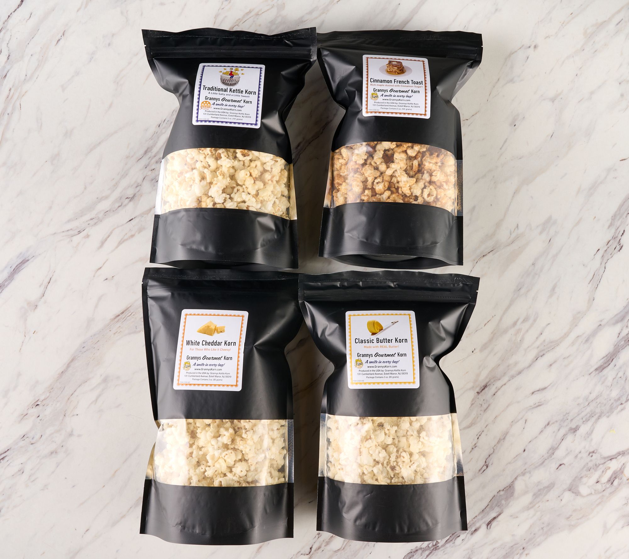 Includes four bags of gourmet popcorn: one 5-oz Traditional Kettle, one 3-oz White Cheddar, one 3-oz Classic Butter, and one 5-oz Cinnamon French Toast